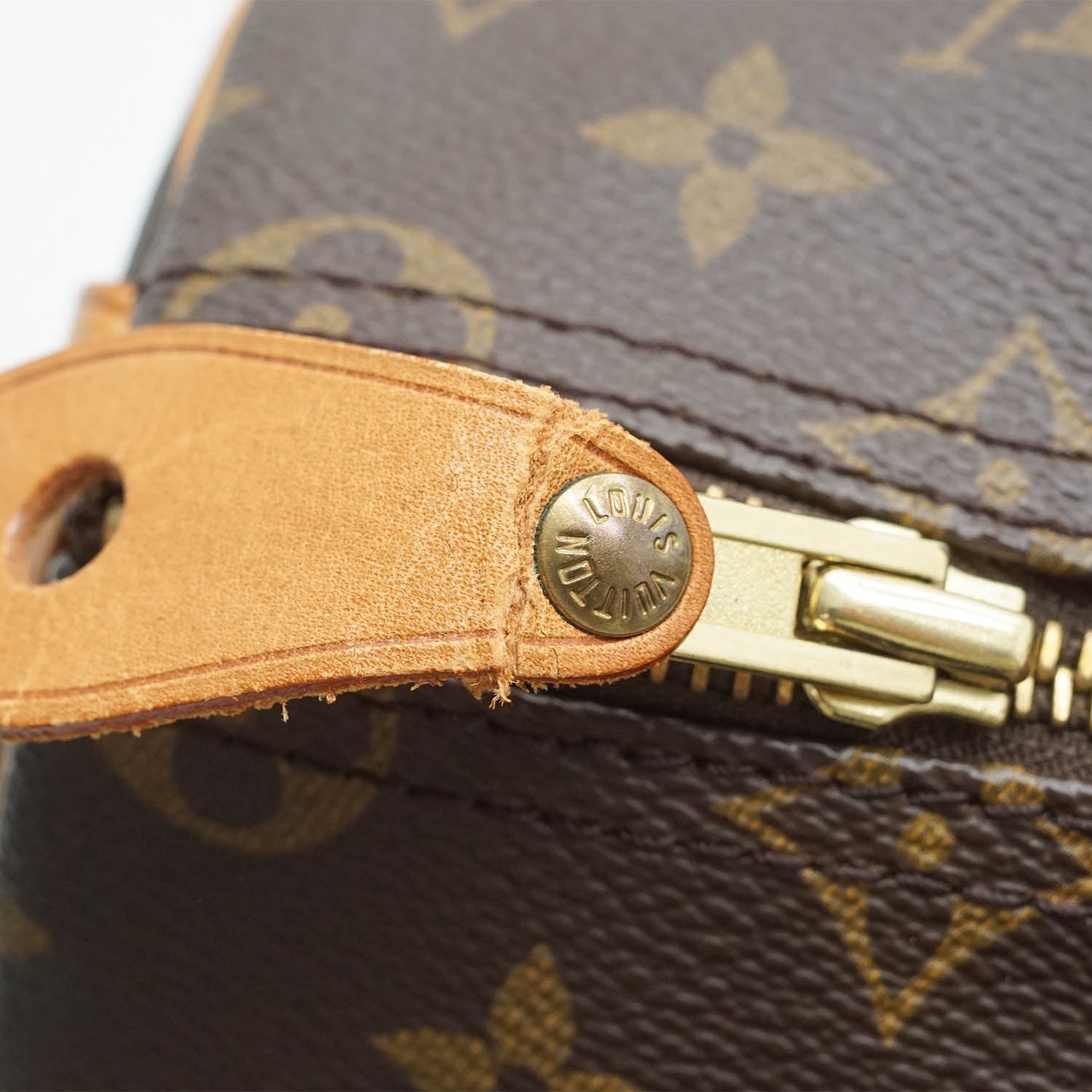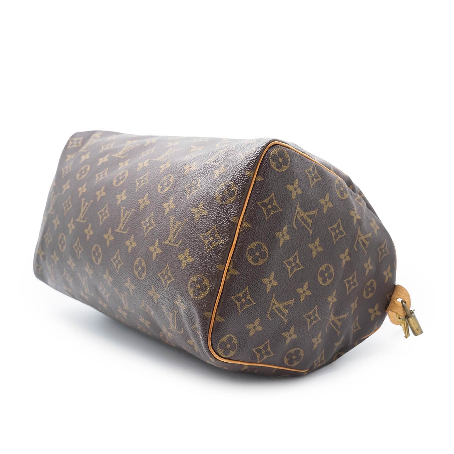 Monogram Speedy 35 Brown Canvas, LeatherDepth: 18.5cmHeight: 22cmWidth: 35cmHand Drop: 10cmOutside Rank: BCInside Rank: BStain: Some green mold residue near the hardwareDiscoloration: Hardware tarnishScratch: Slight scratches on the leather partsPeeling: Some cracking on the side leather tabsWorn: In general, with some loose threads on the inside pocketOdor: Slight storage smellInclude: Padlock, 2 keys (the padlock CANNOT be open since the keys are attached to it)Comments: The leather zipper pull is partially coming offSerial code: SP1913SKU: 7050105