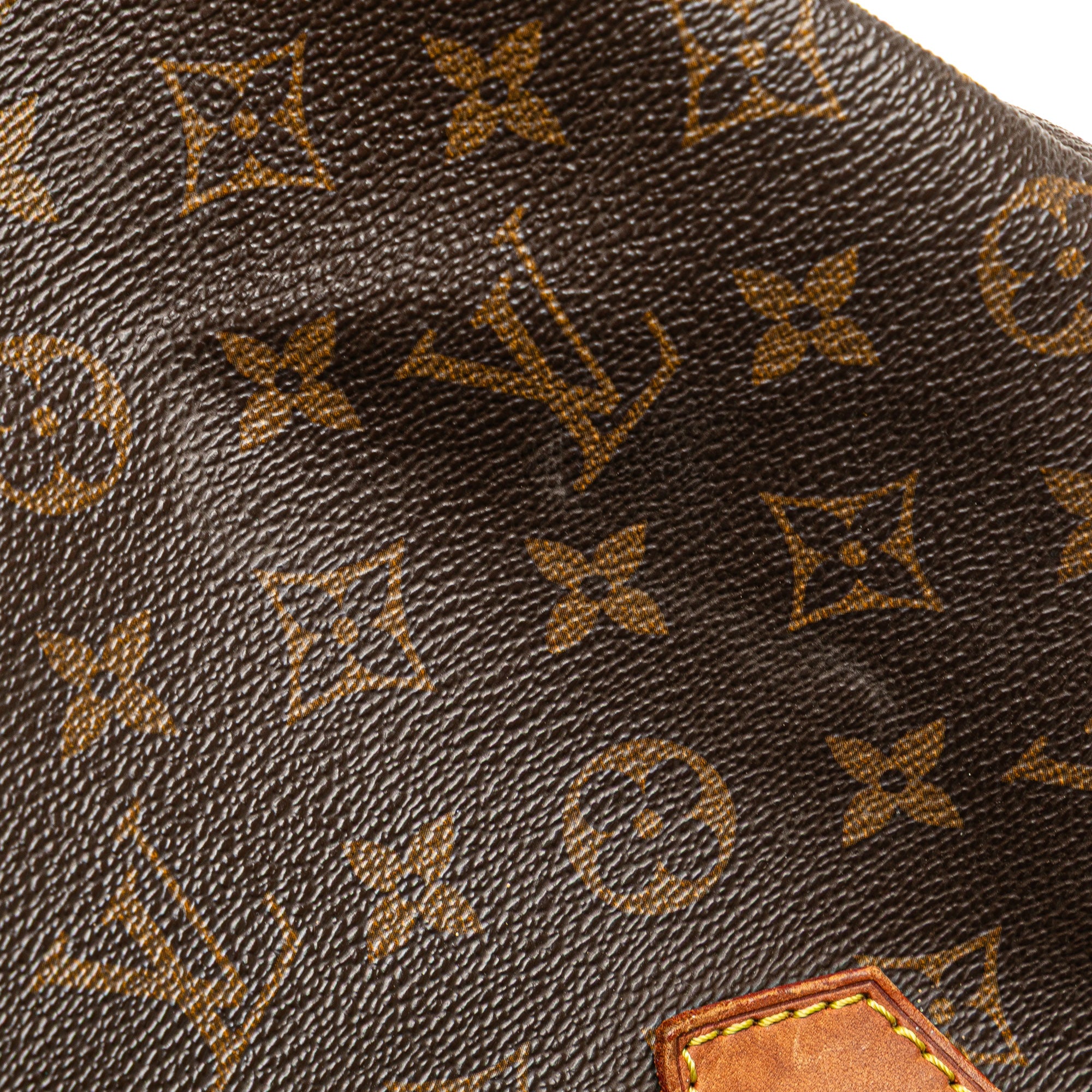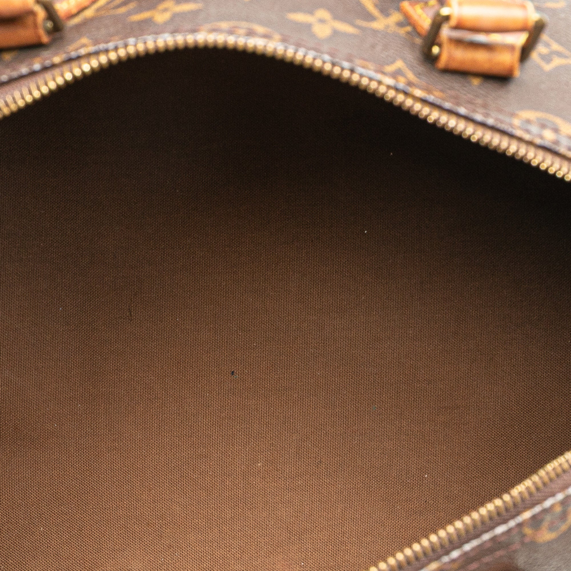 The Speedy 35 features a monogram canvas body, rolled vachetta leather handles, a top zip closure, and an interior slip pocket. Retail Price: 1230.00