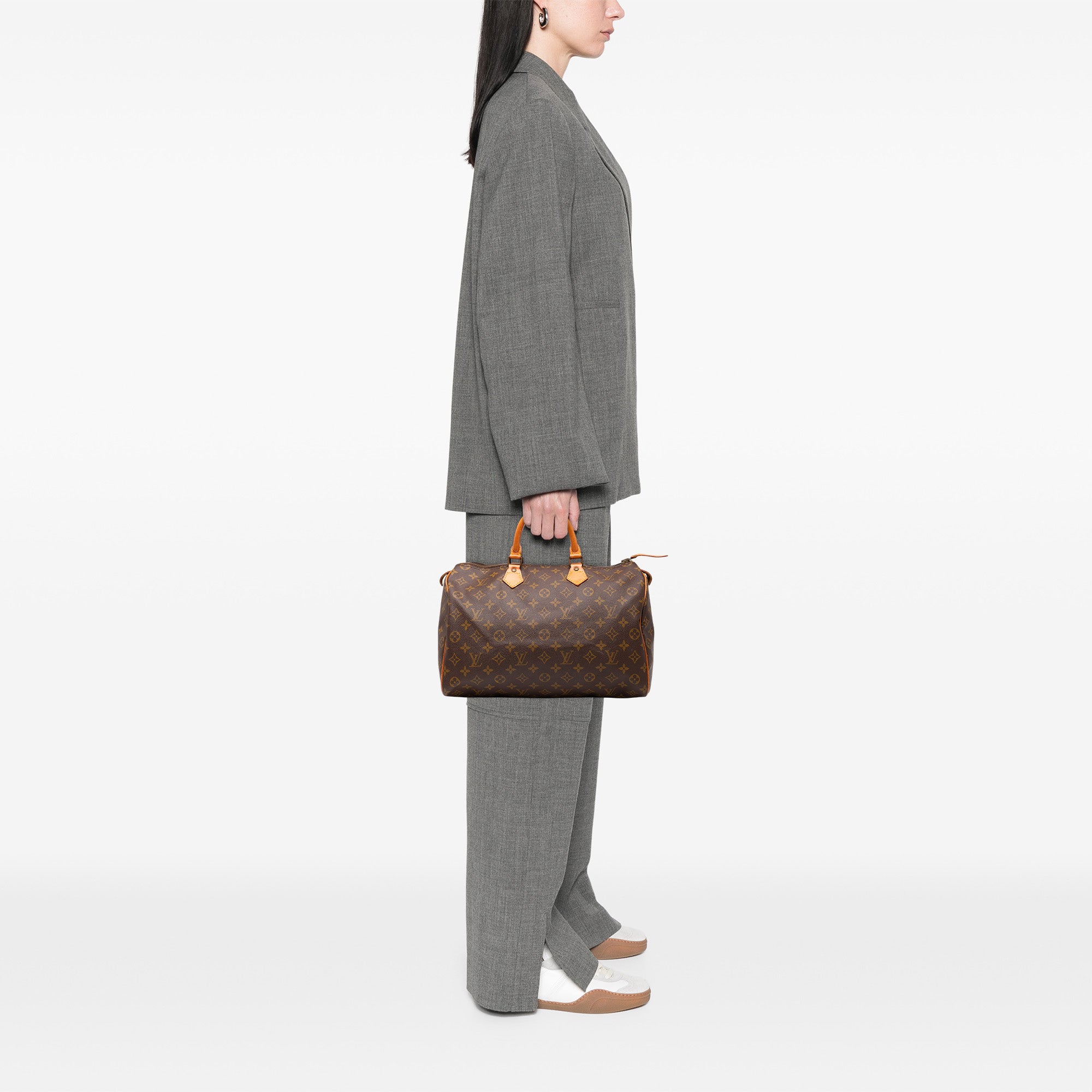 The Speedy 35 features a monogram canvas body, rolled leather handles, a top zip closure, and an interior slip pocket. Retail Price: 1230.00