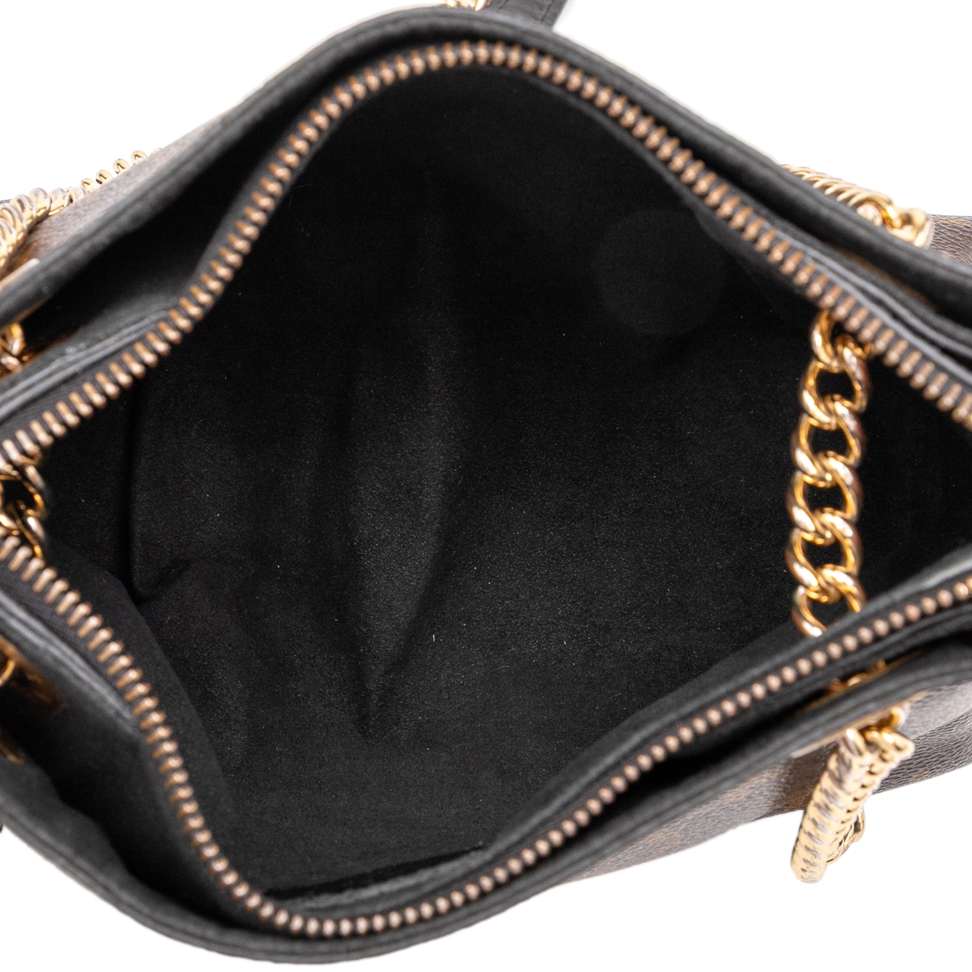 The Surene BB features a canvas monogram body, chain link straps with leather guard, a top zip closure, exterior slip compartments, and interior slip pockets. Retail Price: 2250.00
