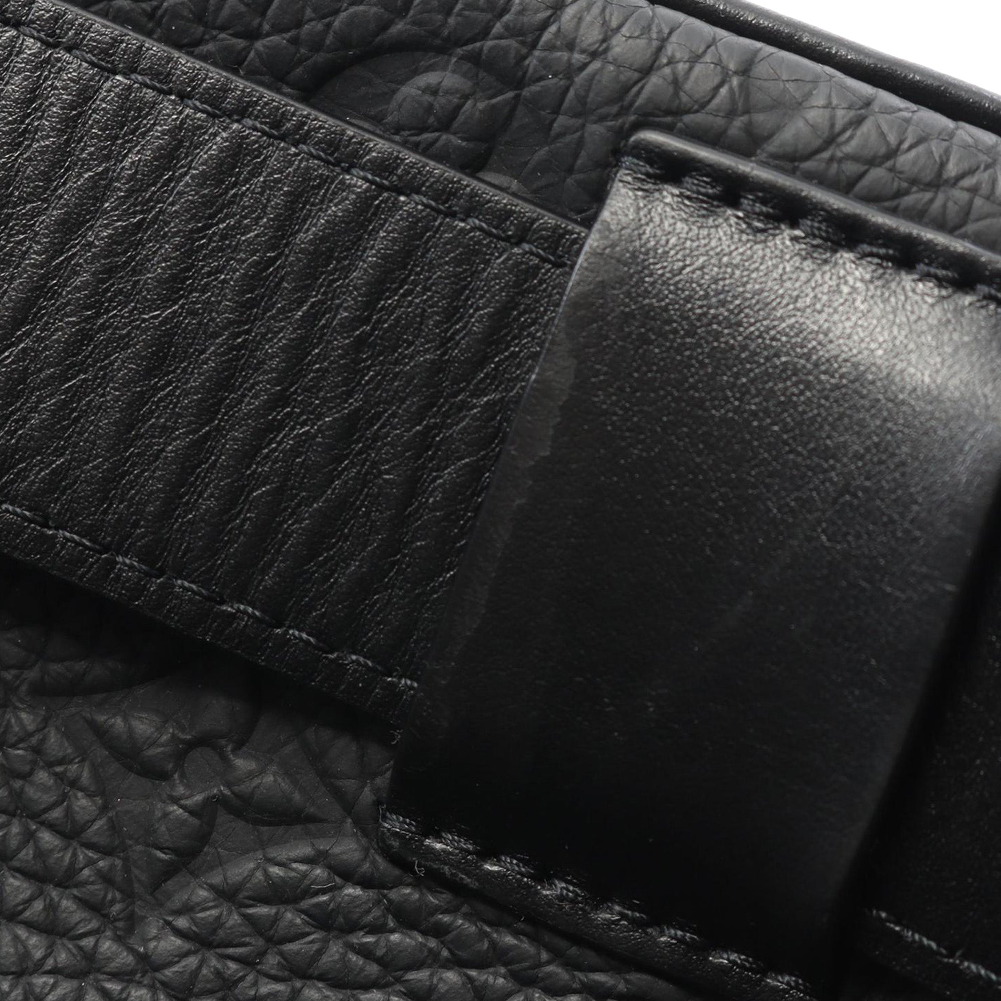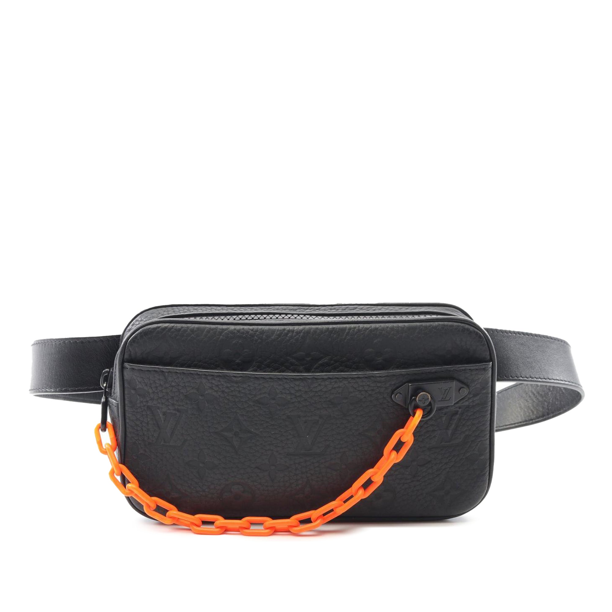 The Pochette Volga features a monogram taurillon leather body, a flat leather waist strap, an exterior front slip pocket with plastic chain details, and a top zip closure. Retail Price: 1400.00