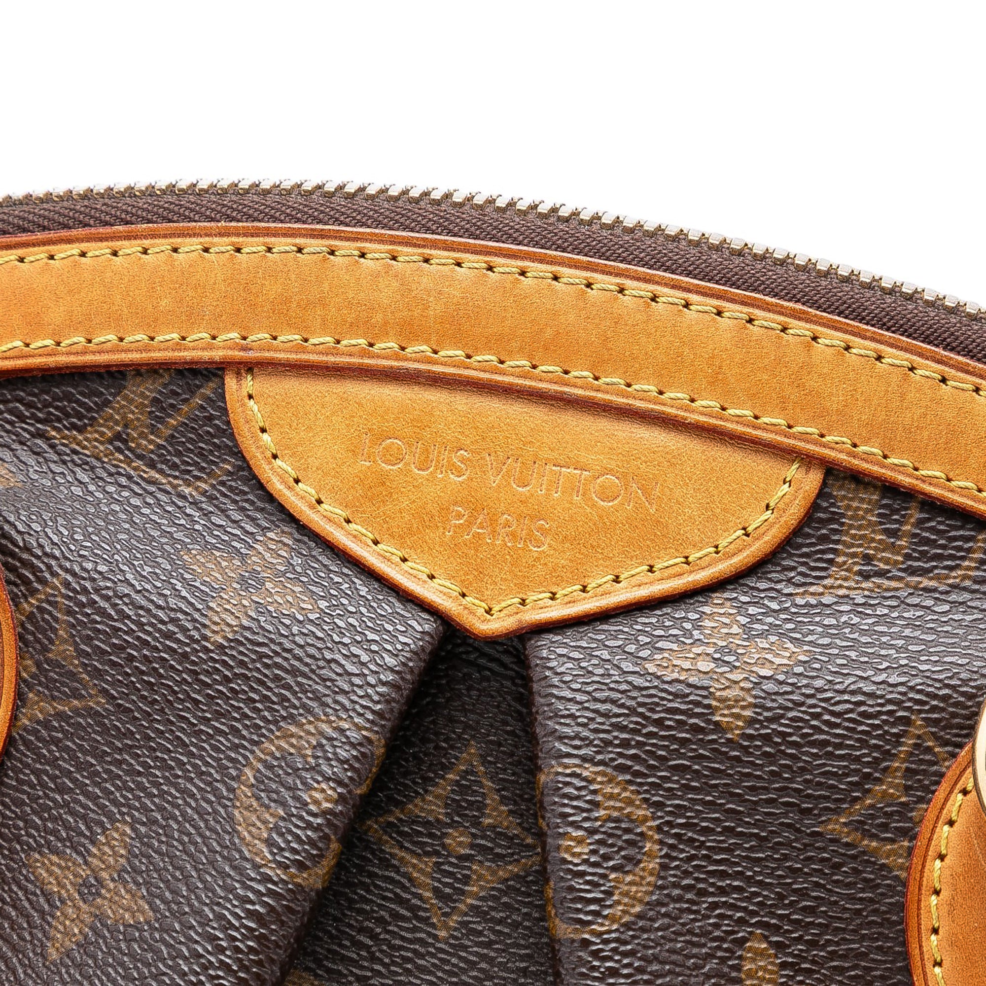 The Tivoli PM features a monogram canvas body with vachetta leather trim, rolled vachetta leather handles, a top zip closure, and interior slip pockets. Retail Price: 1475.00