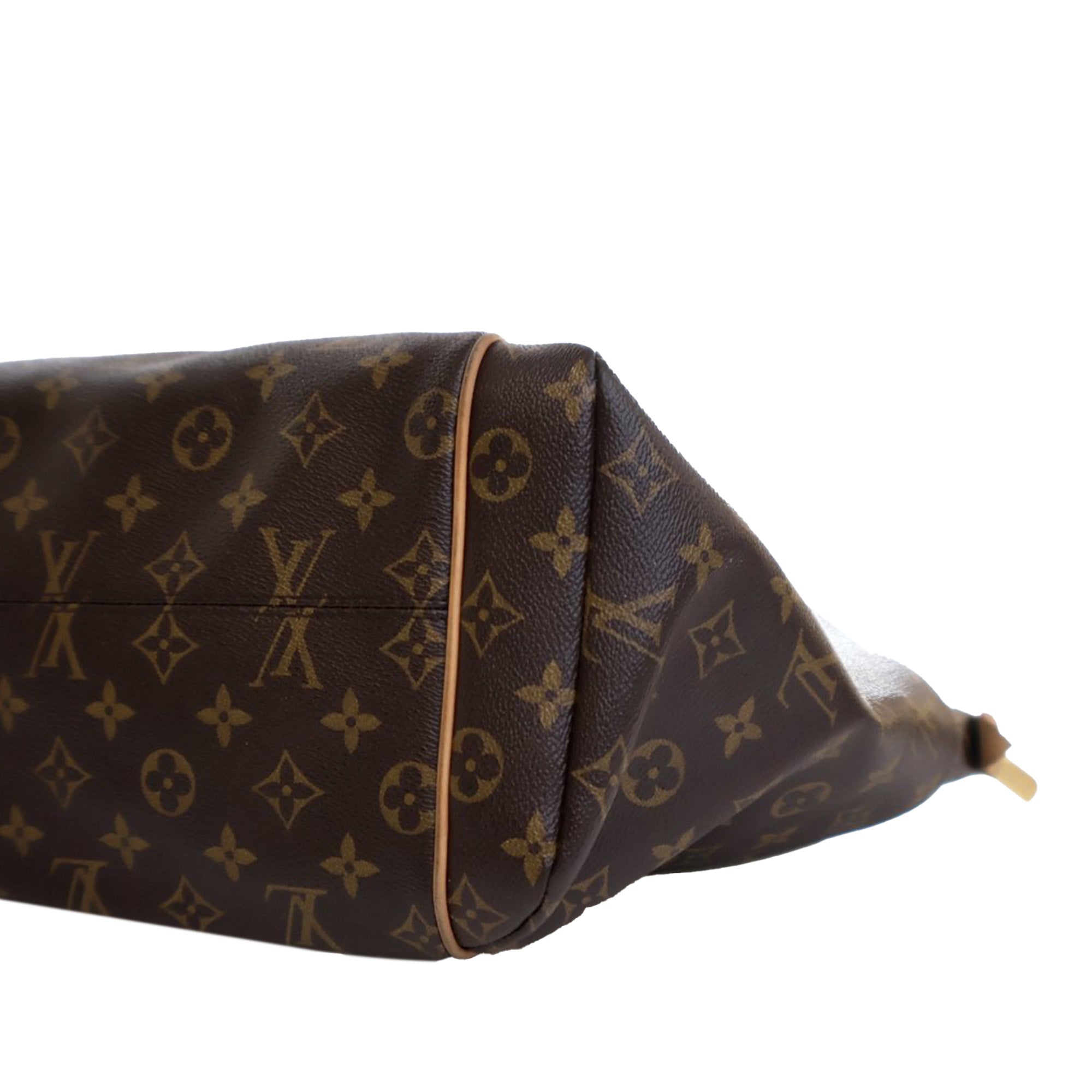 The Totally MM features a monogram canvas body with vachetta leather trim, exterior side open pockets, flat vachetta leather straps, a top zip closure, and interior slip pockets. Retail Price: 1350.00