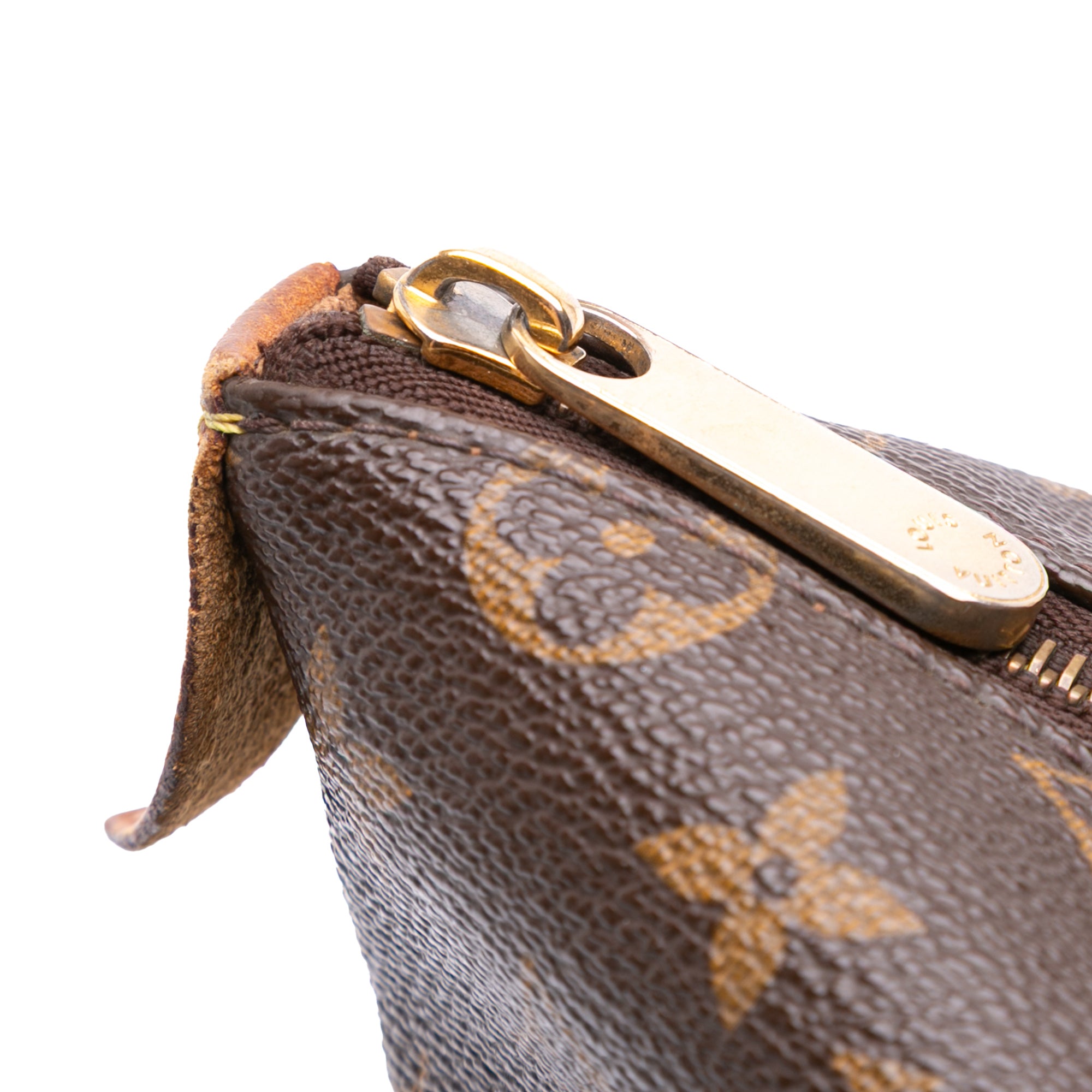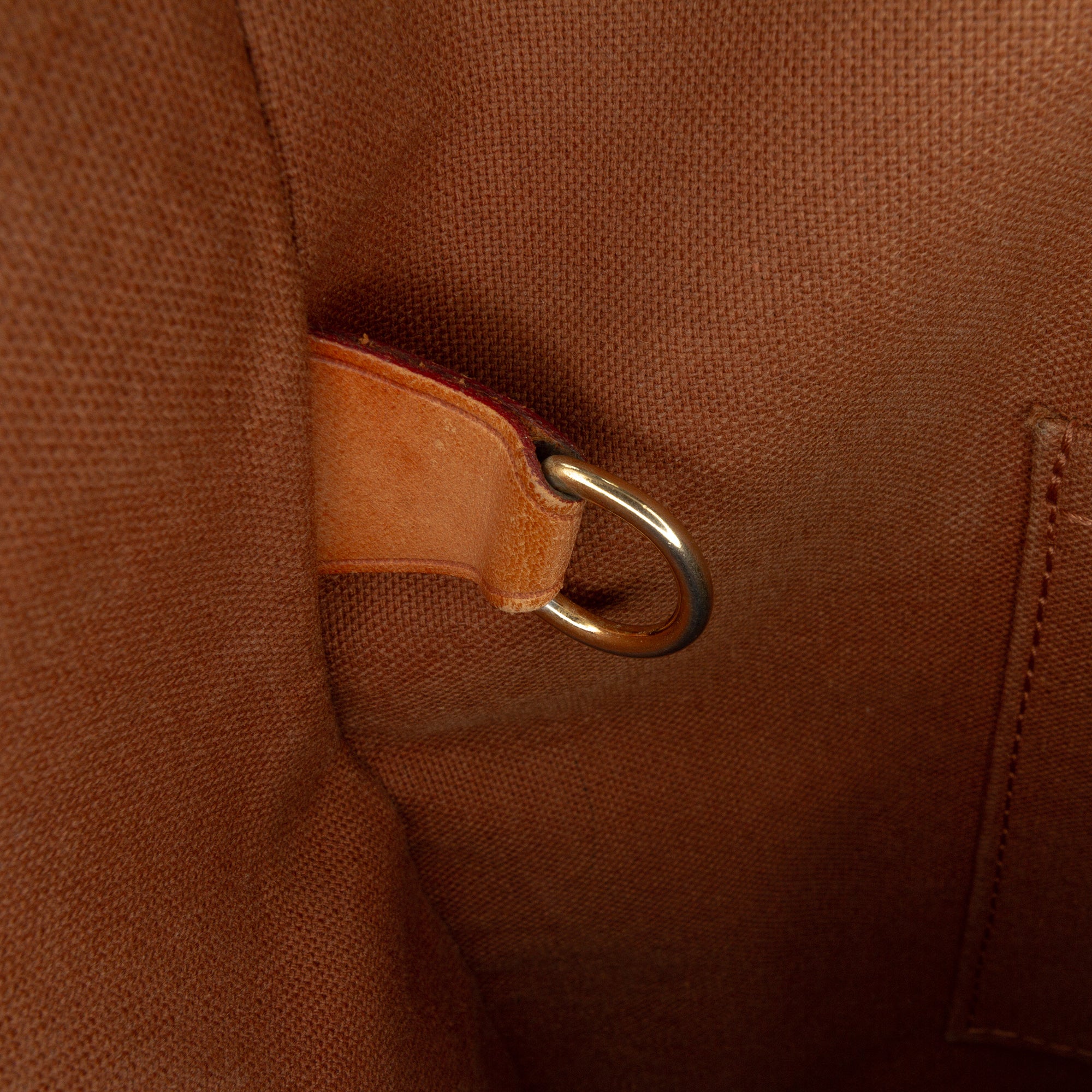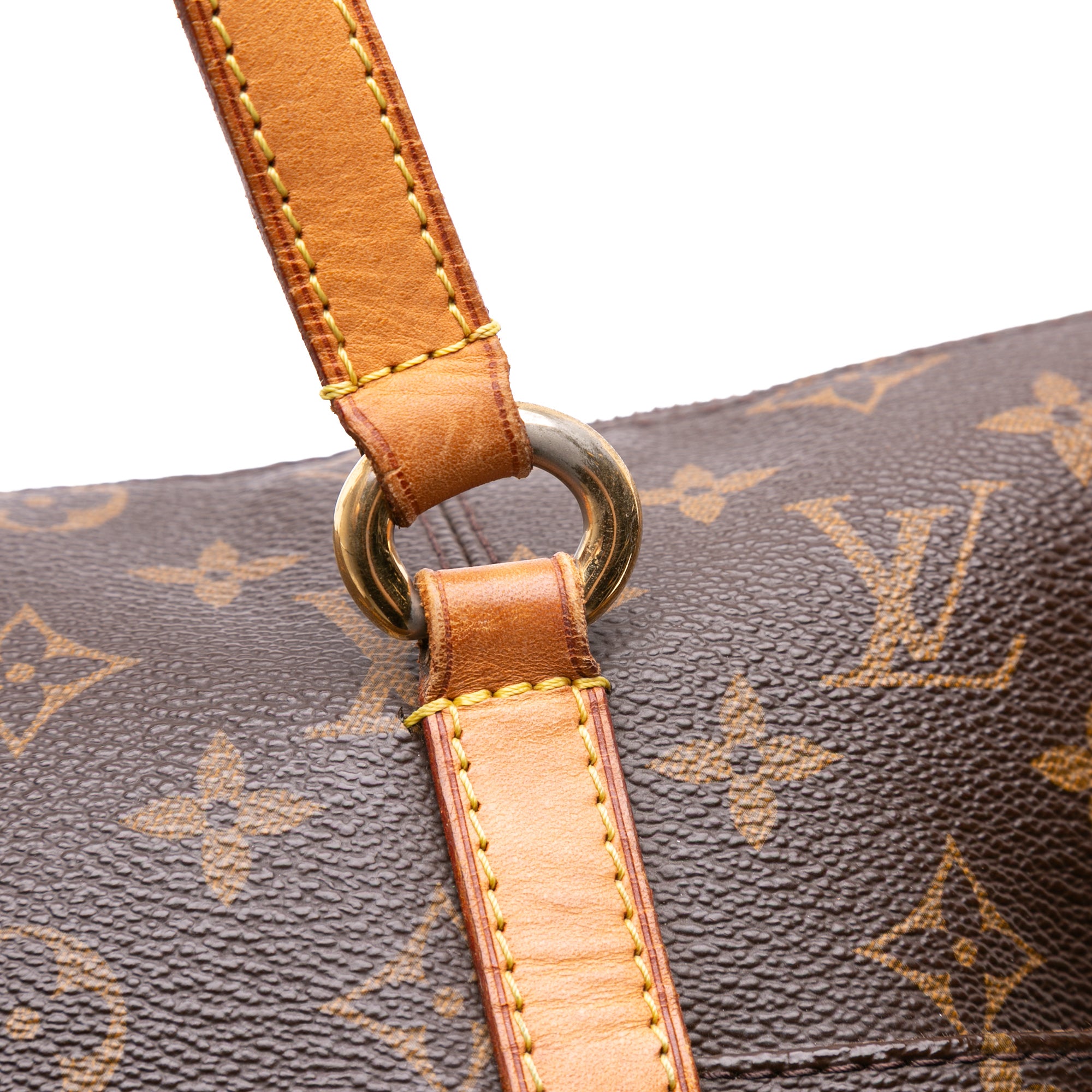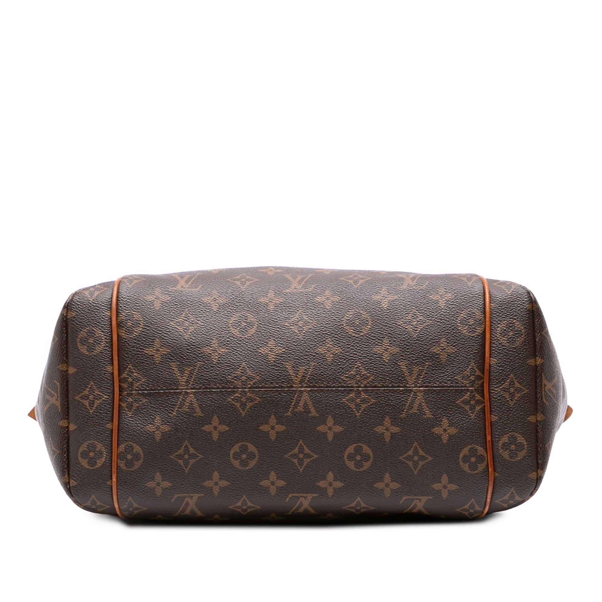 The Totally MM features a monogram canvas body with vachetta leather trim, flat vachetta leather straps, a top zip closure, exterior side open pockets, and interior slip pockets. Retail Price: 1350.00