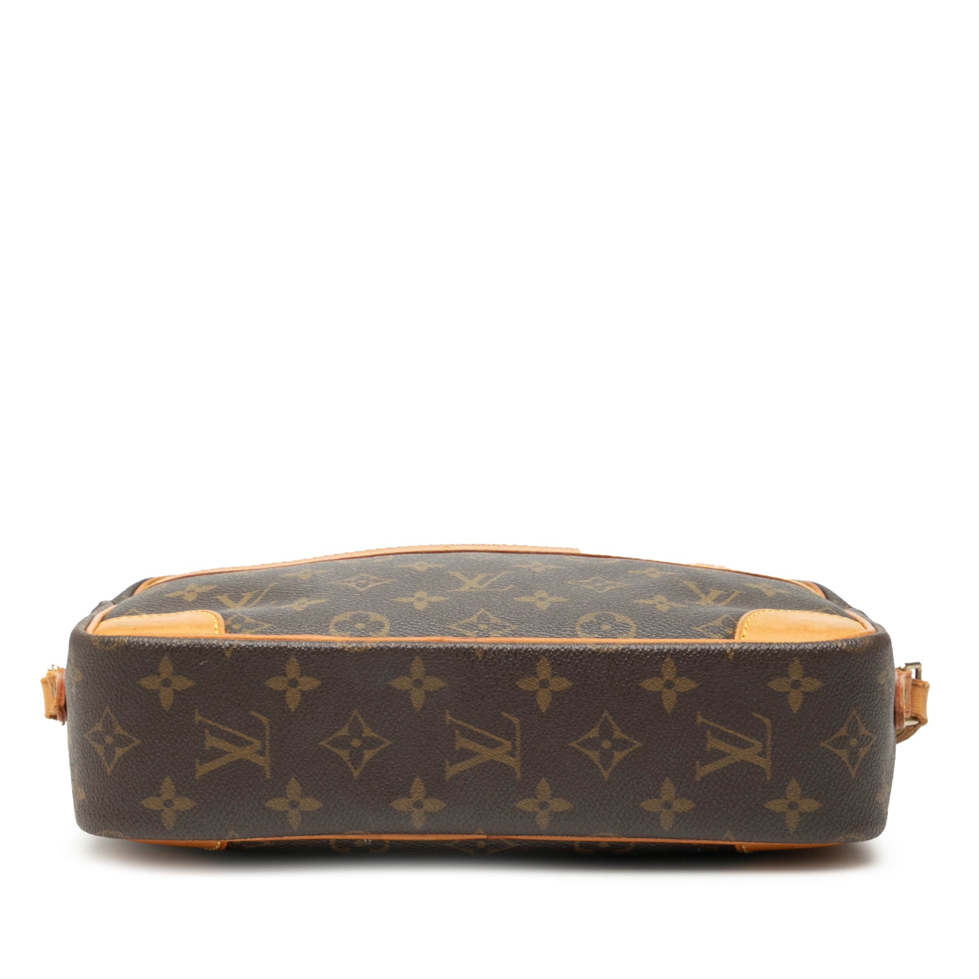 The Trocadero 27 features a monogram canvas body with vachetta leather trim, a flat vachetta leather shoulder strap, a top zip closure, an exterior slip pocket, and an interior zip pocket. Retail Price: 1500.00