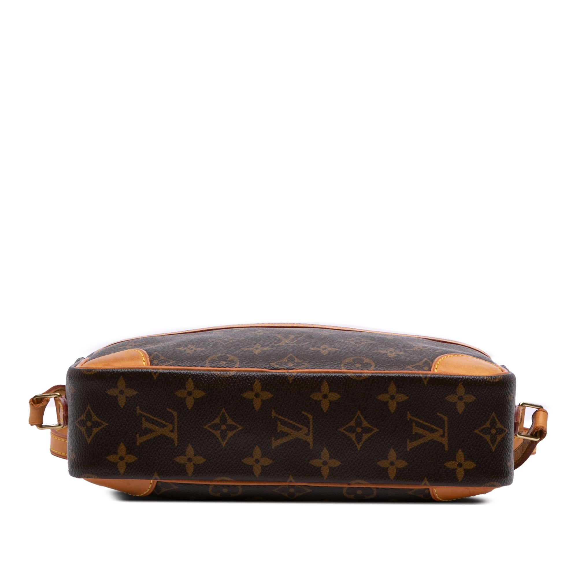 The Trocadero 27 features a monogram canvas body with vachetta leather trim, a flat vachetta leather shoulder strap, a top zip closure, an exterior slip pocket, and an interior zip pocket. Retail Price: 1500.00