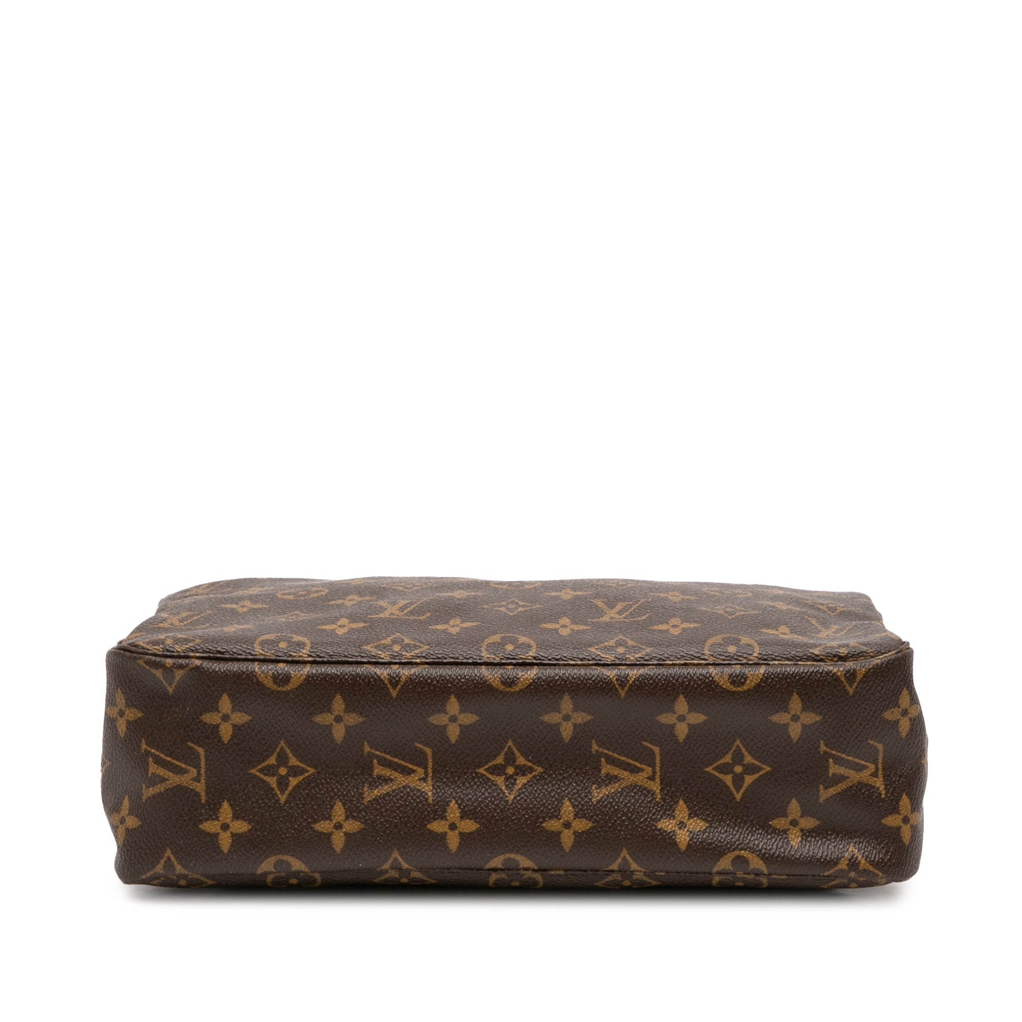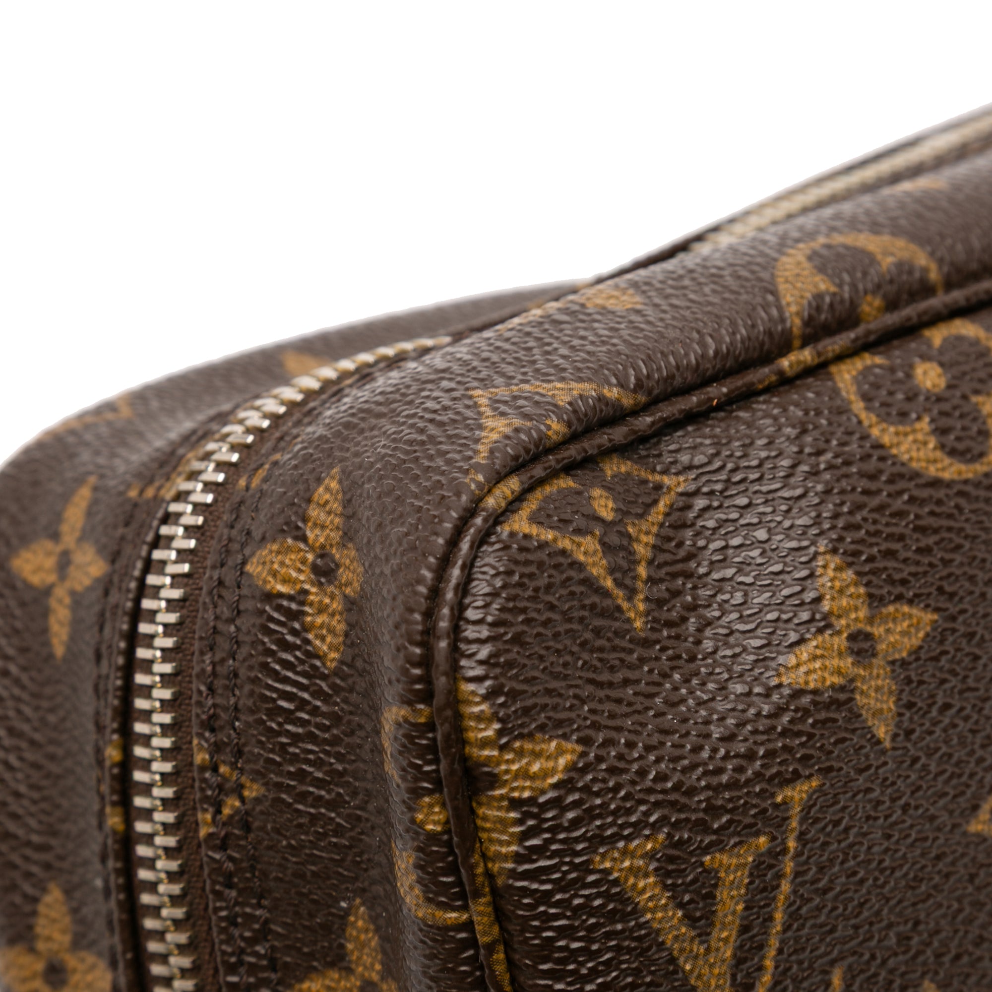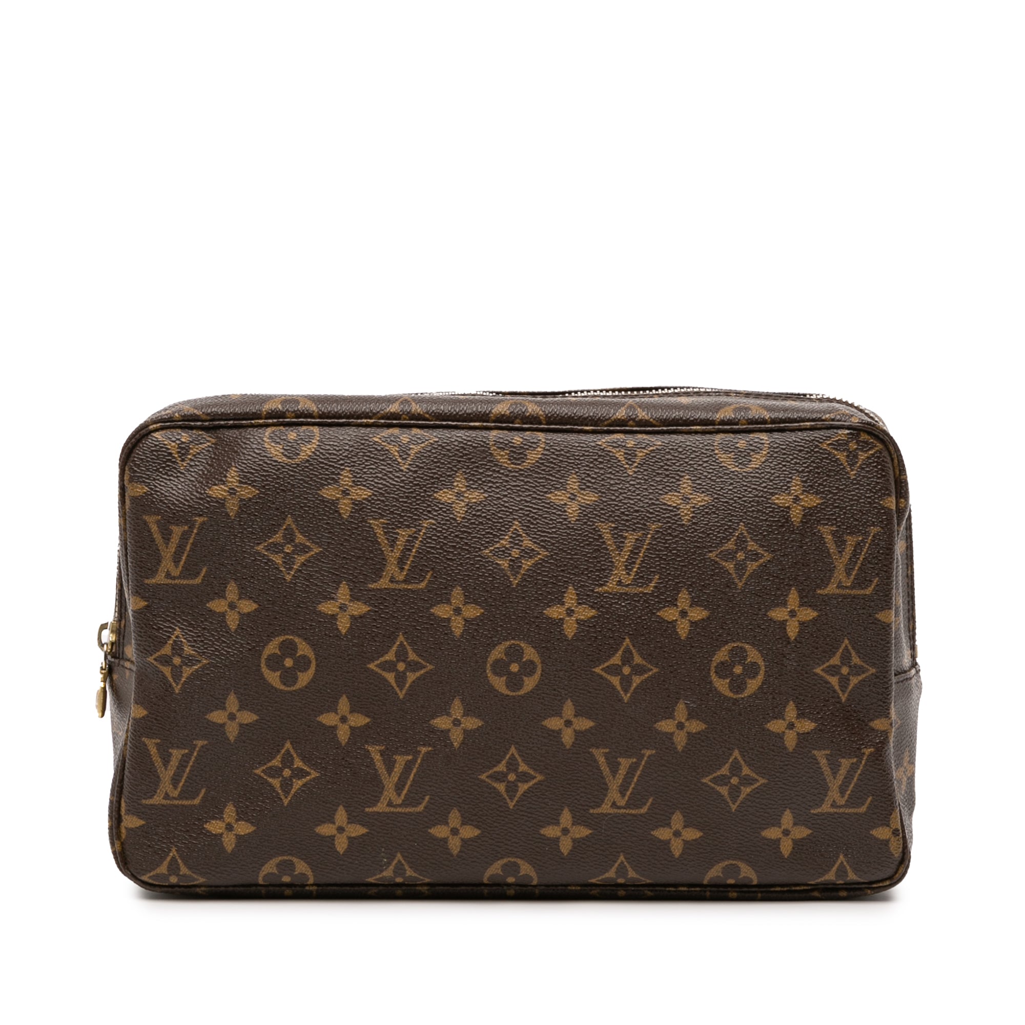 The Trousse Toilette 28 features a monogram canvas body, a top zip closure, and an interior slip pocket. Retail Price: 700.00