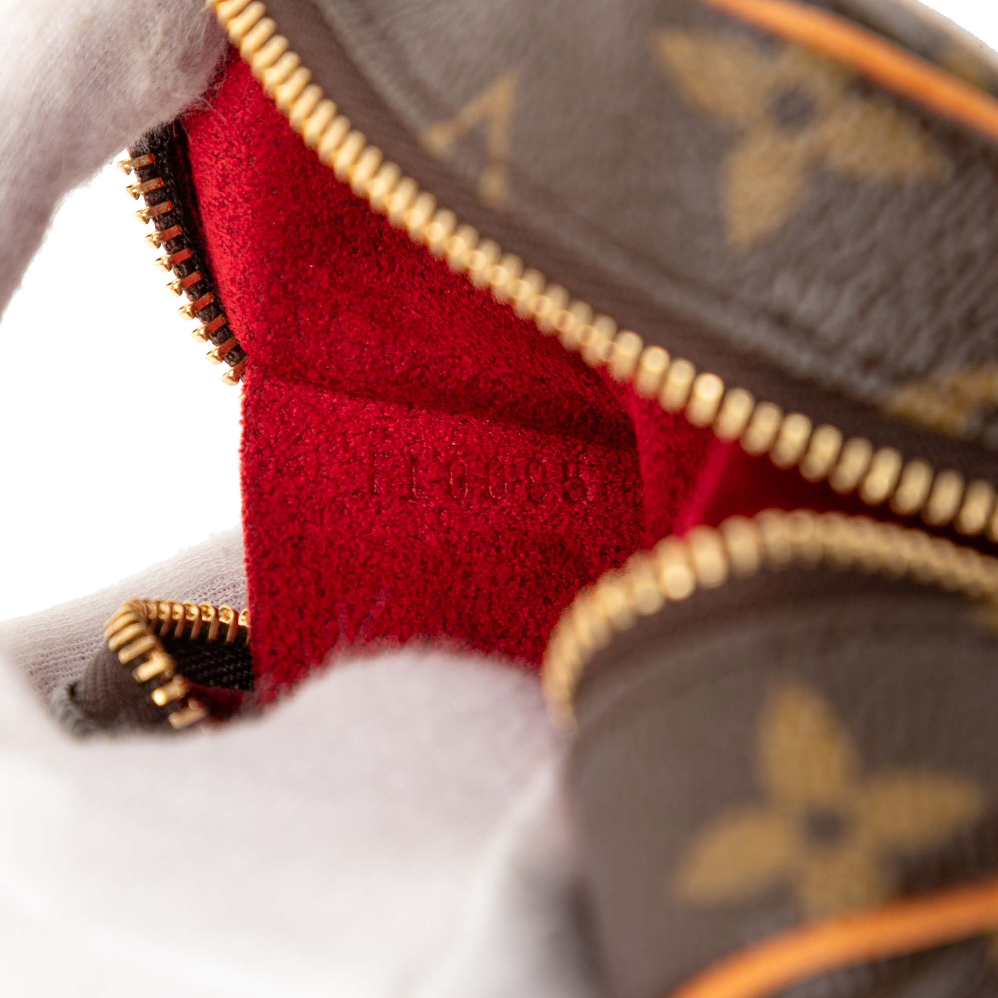 The Trousse Wapity features a monogram canvas body with vachetta leather trim, a flat vachetta leather wrist strap, a top zip closure, and an interior slip pocket. Retail Price: 800.00