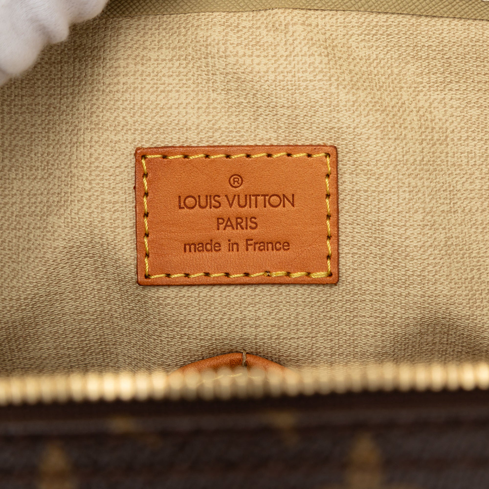 The Trouville features a monogram canvas with vachetta leather trim, rolled vachetta leather handles, a top zip closure, an exterior front slip pocket, and interior open pockets. Retail Price: 1070.00