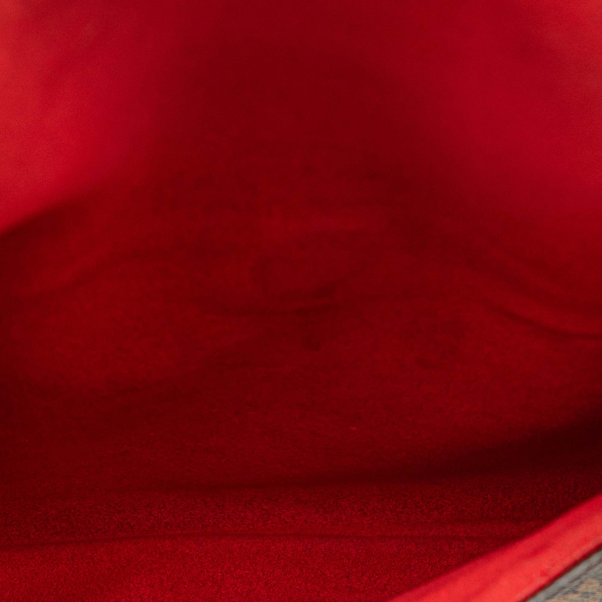 The Twice features a monogram canvas body, a flat leather strap, a front leather flap with a snap button closure, and a back zip compartment. Retail Price: 1250.00