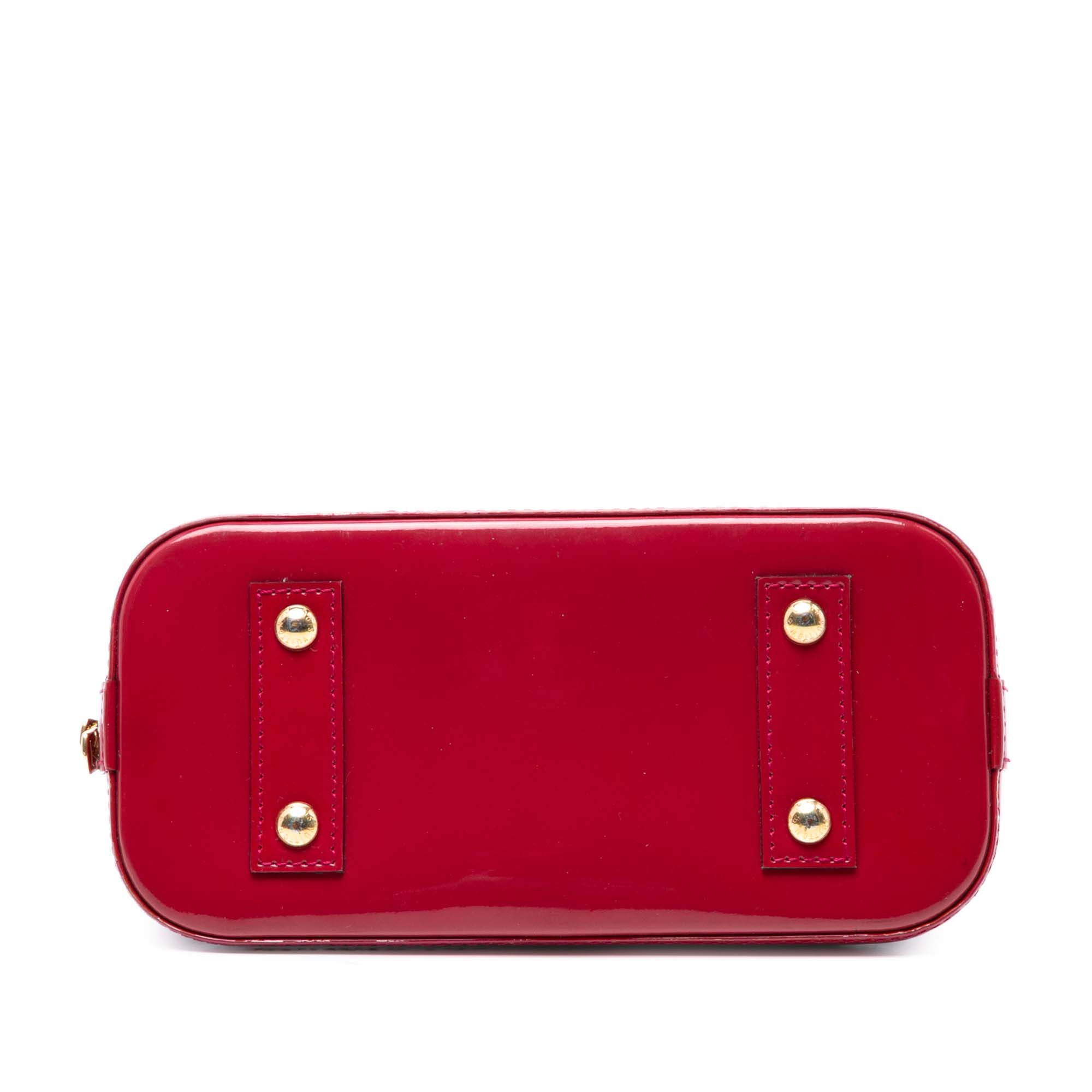 The Alma BB features a vernis leather body, rolled leather handles, a detachable leather strap, a top zip around closure, a clochette, and an interior slip pocket. Retail Price: 2230.00
