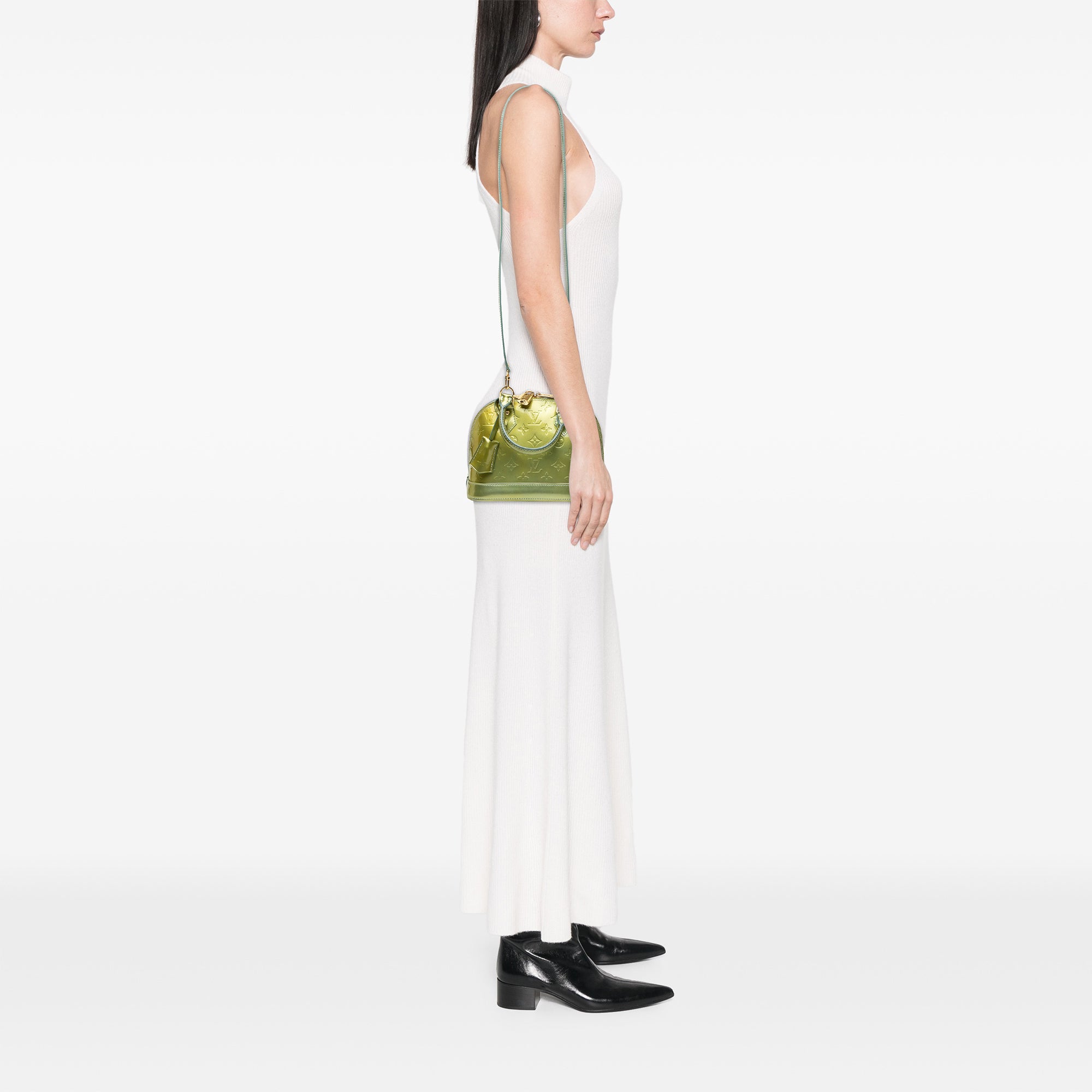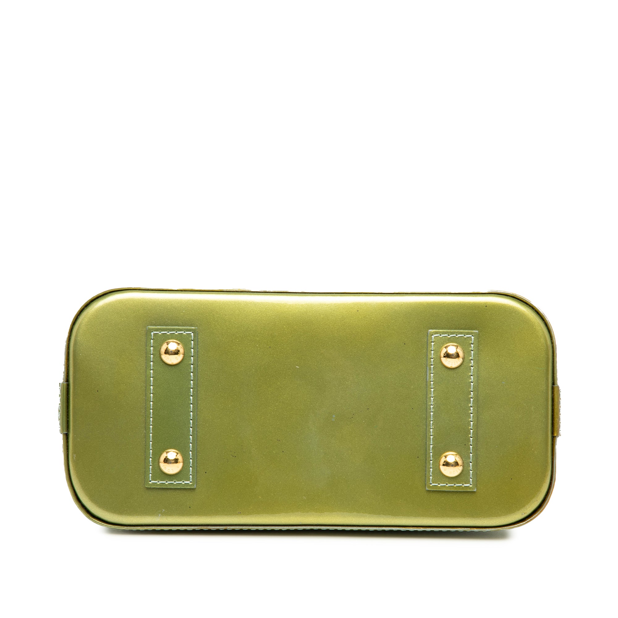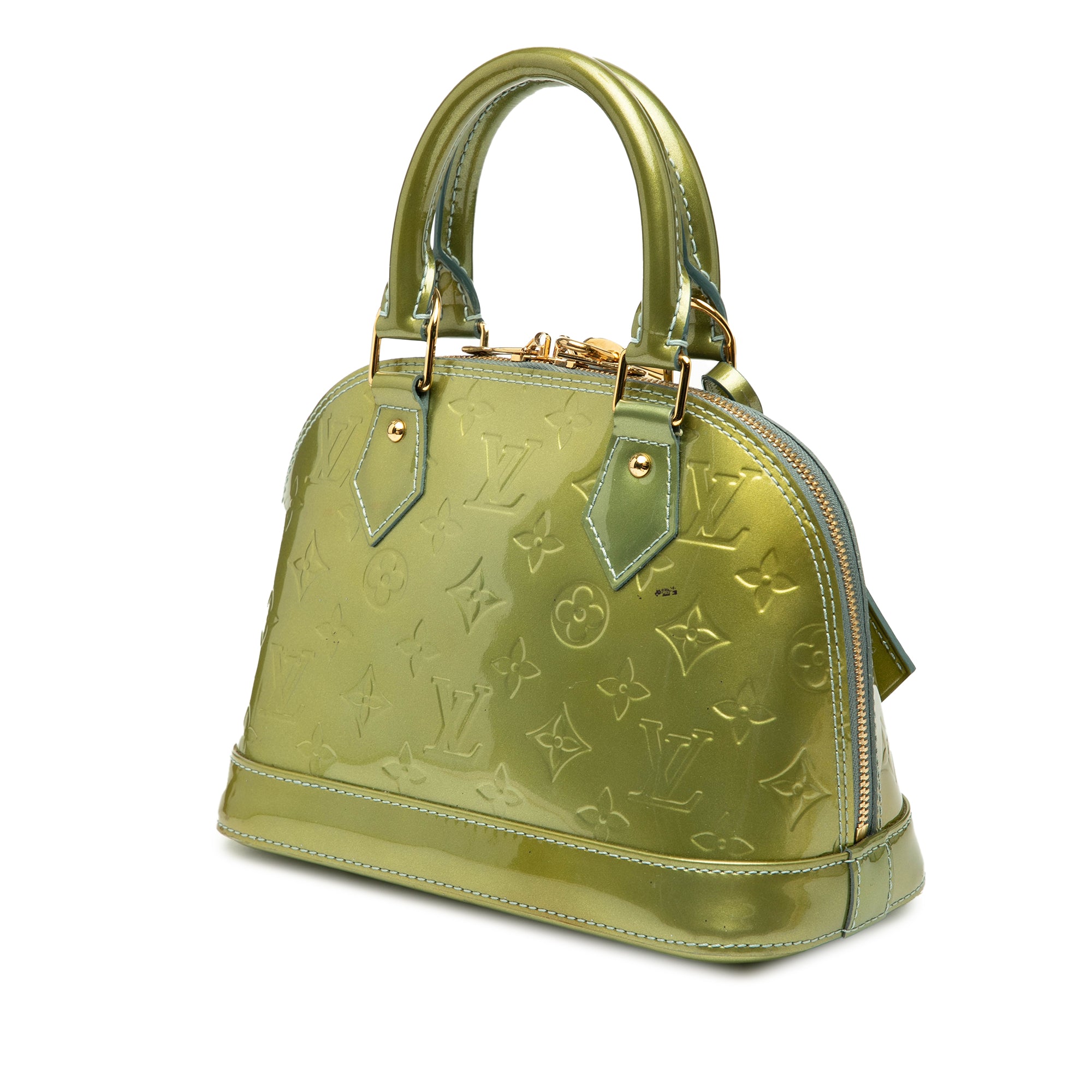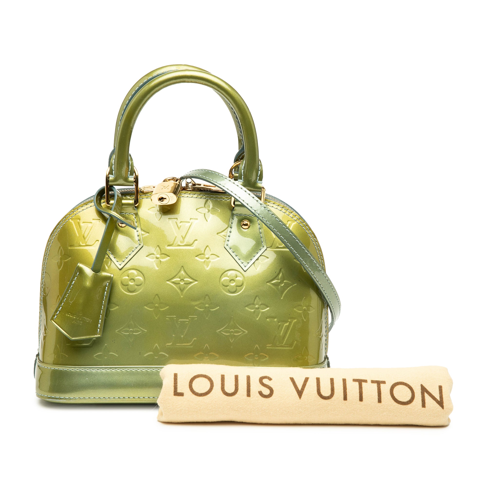 The Alma BB features a monogram vernis leather body, rolled leather handles, a flat detachable leather strap, a zip-around closure, a clochette, and an interior slip pocket. Inclusion: Dust bag. Retail Price: 1890.00