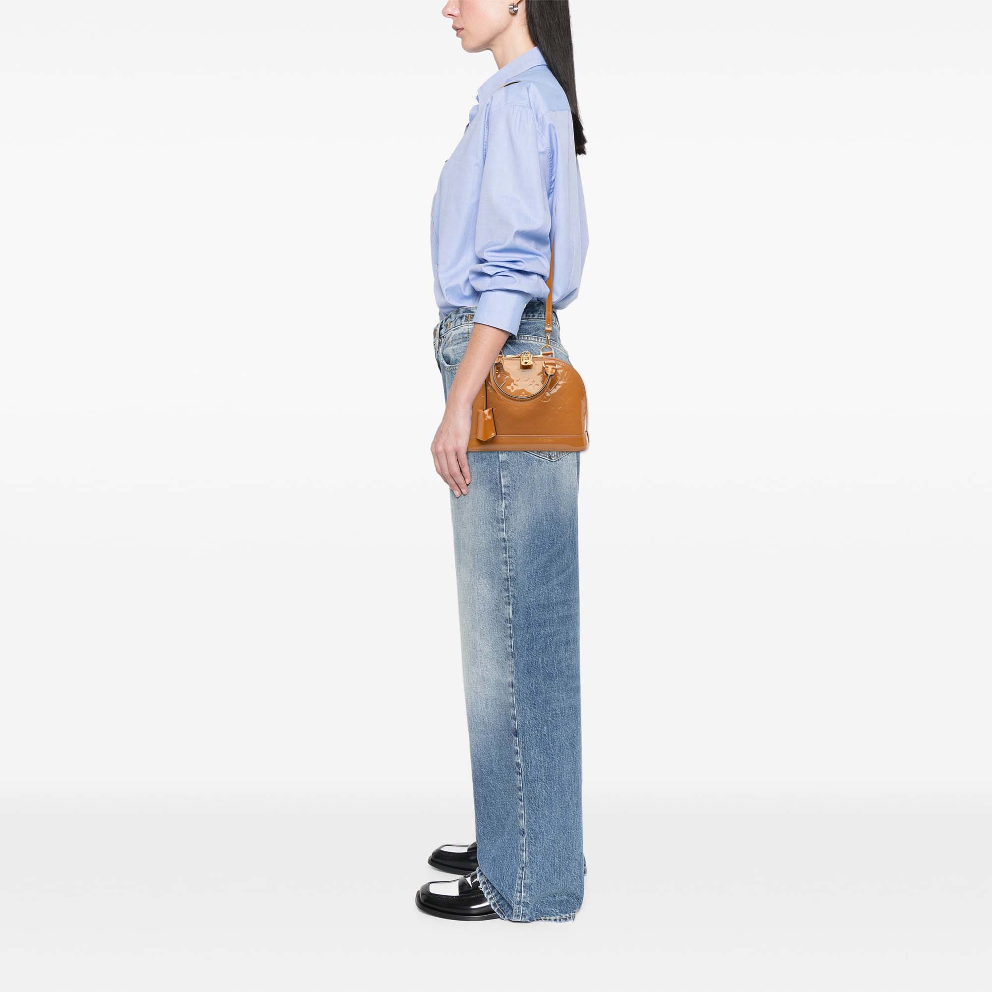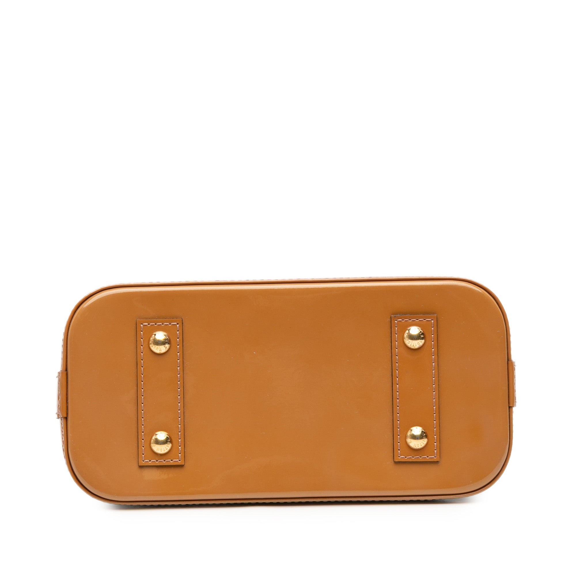The Alma BB features a vernis leather body, rolled leather handles, a detachable flat leather strap, a top zip around closure, a clochette, and an interior slip pocket. Retail Price: 2230.00