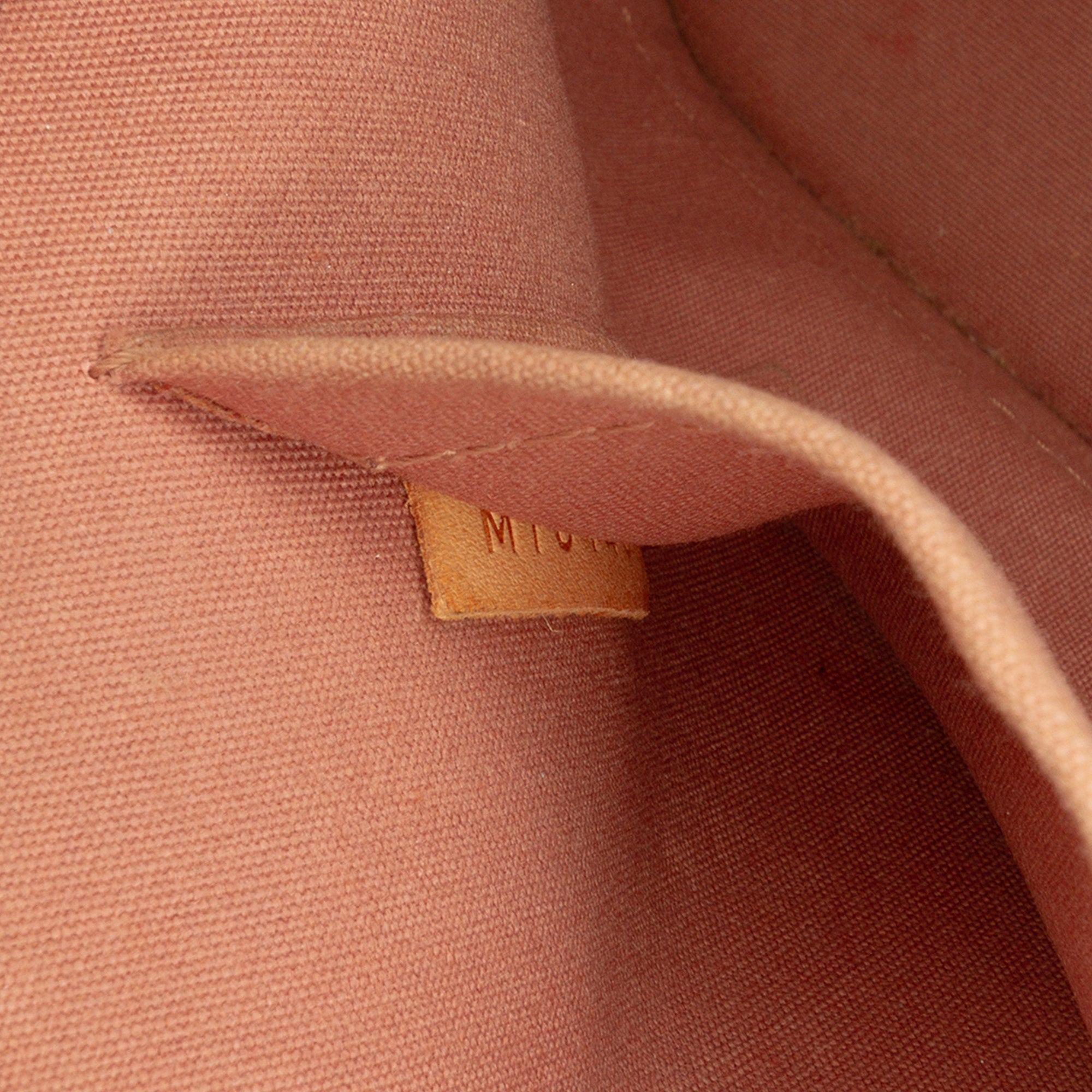 The Alma BB features a monogram vernis leather body, rolled leather handles, a detachable flat leather strap, a top zip closure, a clochette, and an interior slip pocket. Retail Price: 2230.00