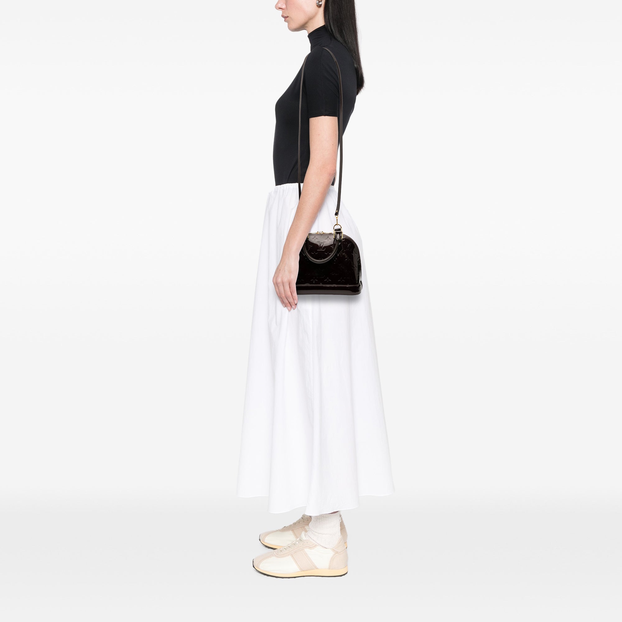 The Alma BB features an vernis leather body, rolled top handles, a detachable flat leather strap, a top zip closure, and an interior slip pocket. Retail Price: 2230.00