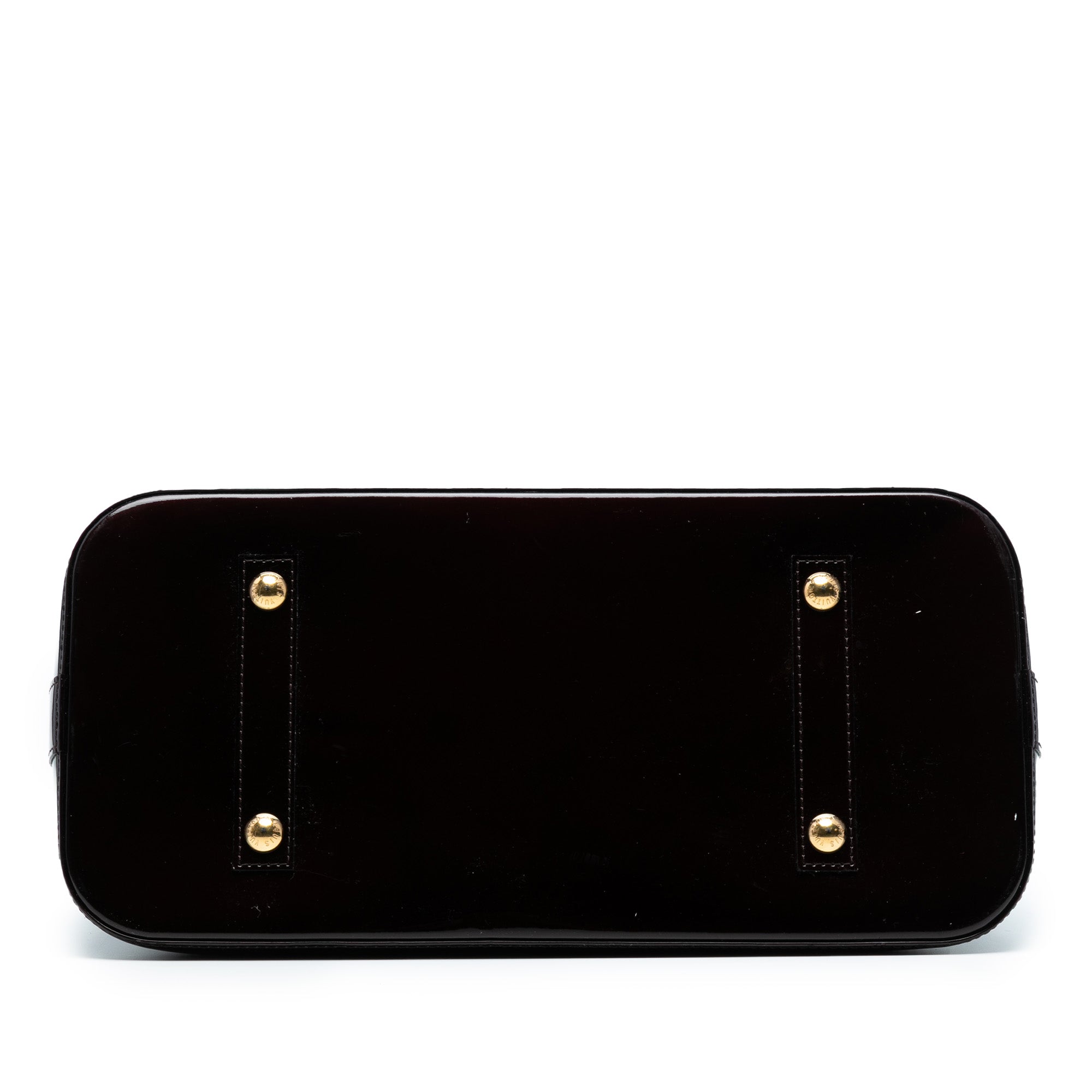 The Alma GM features a monogram vernis body, rolled leather handles, a clochette, gold-tone hardware, a top zip closure, and interior slip pockets. Retail Price: 2395.00