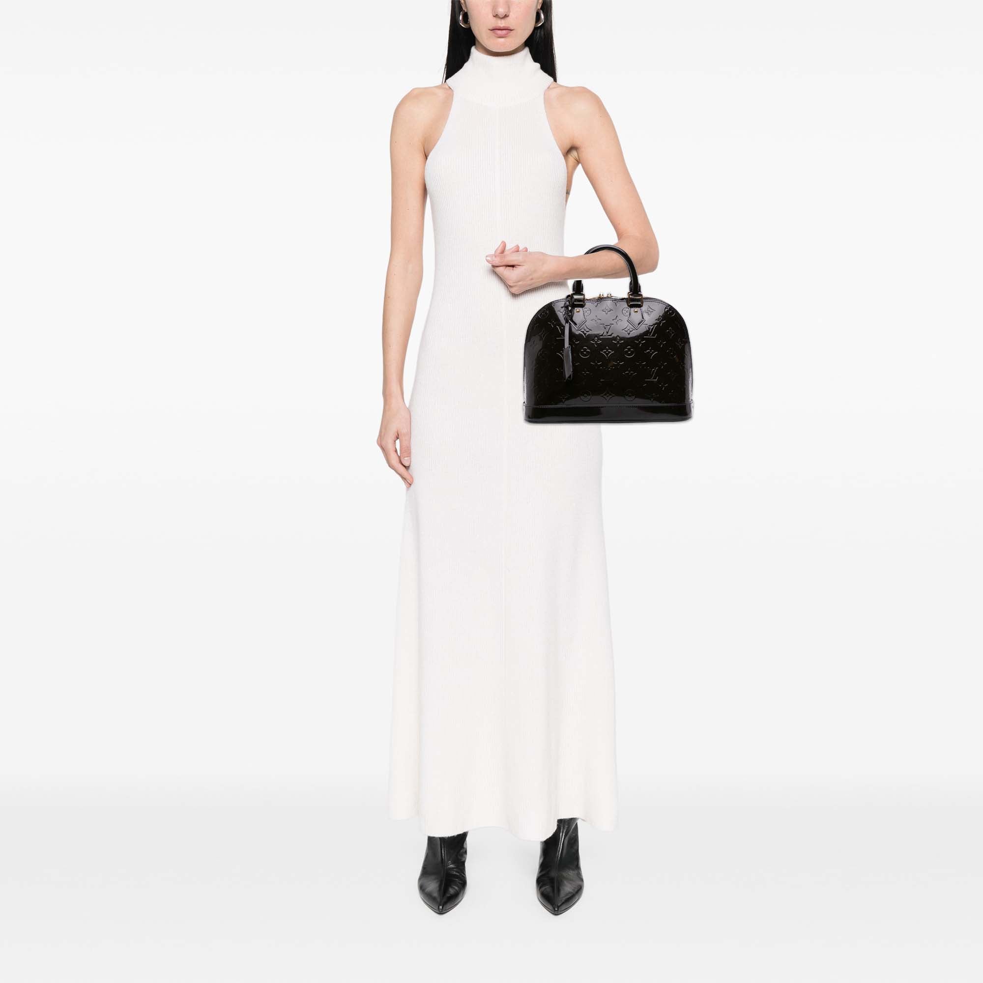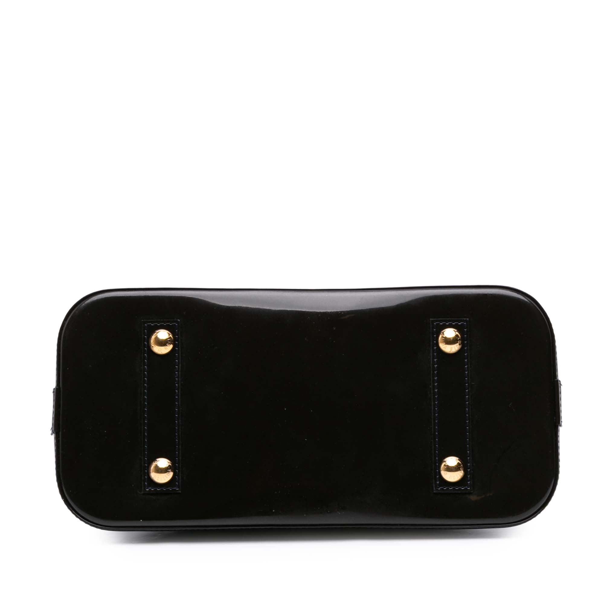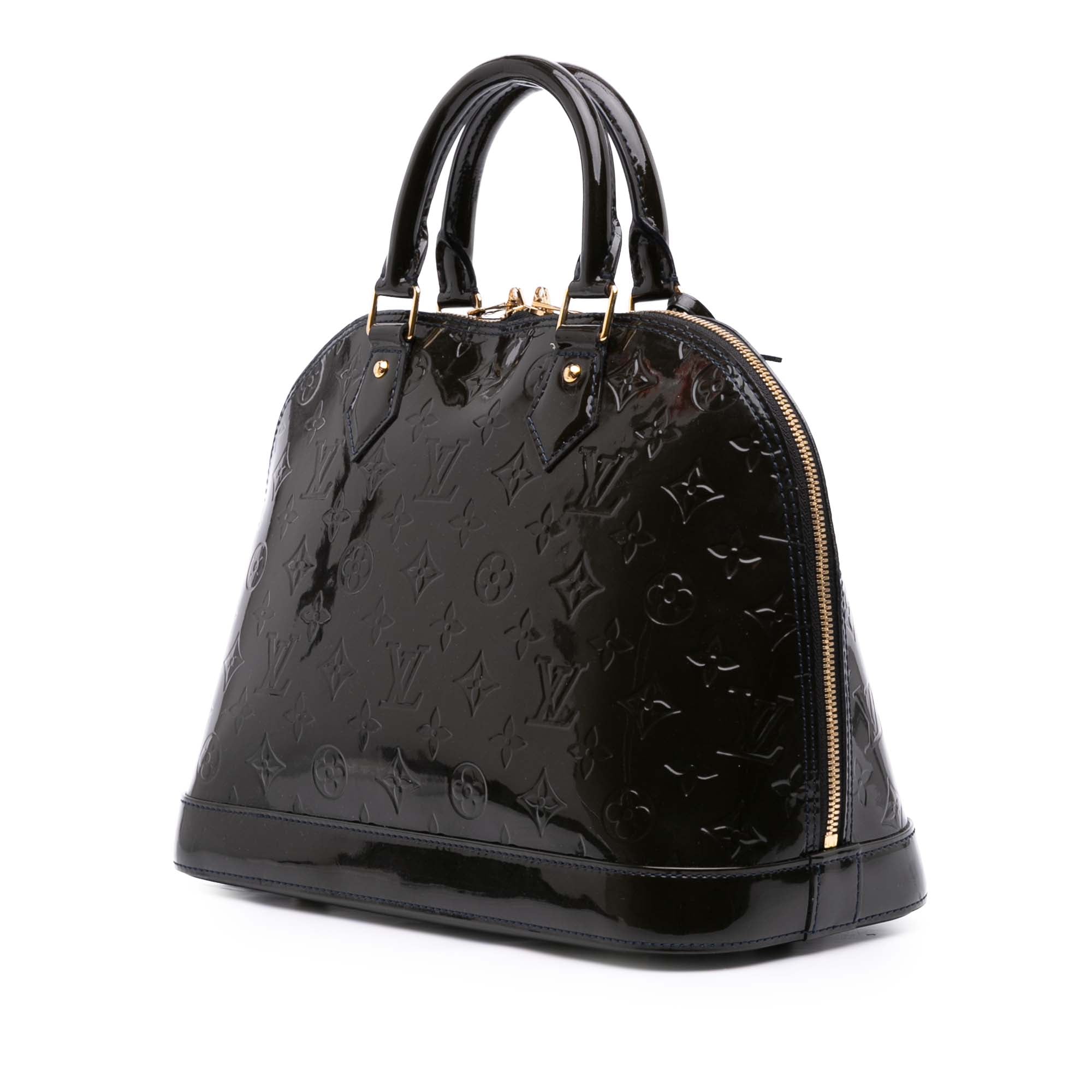 The Alma PM features a monogram vernis leather body, rolled leather handles, a top zip closure, and interior slip pockets. Retail Price: 2350.00