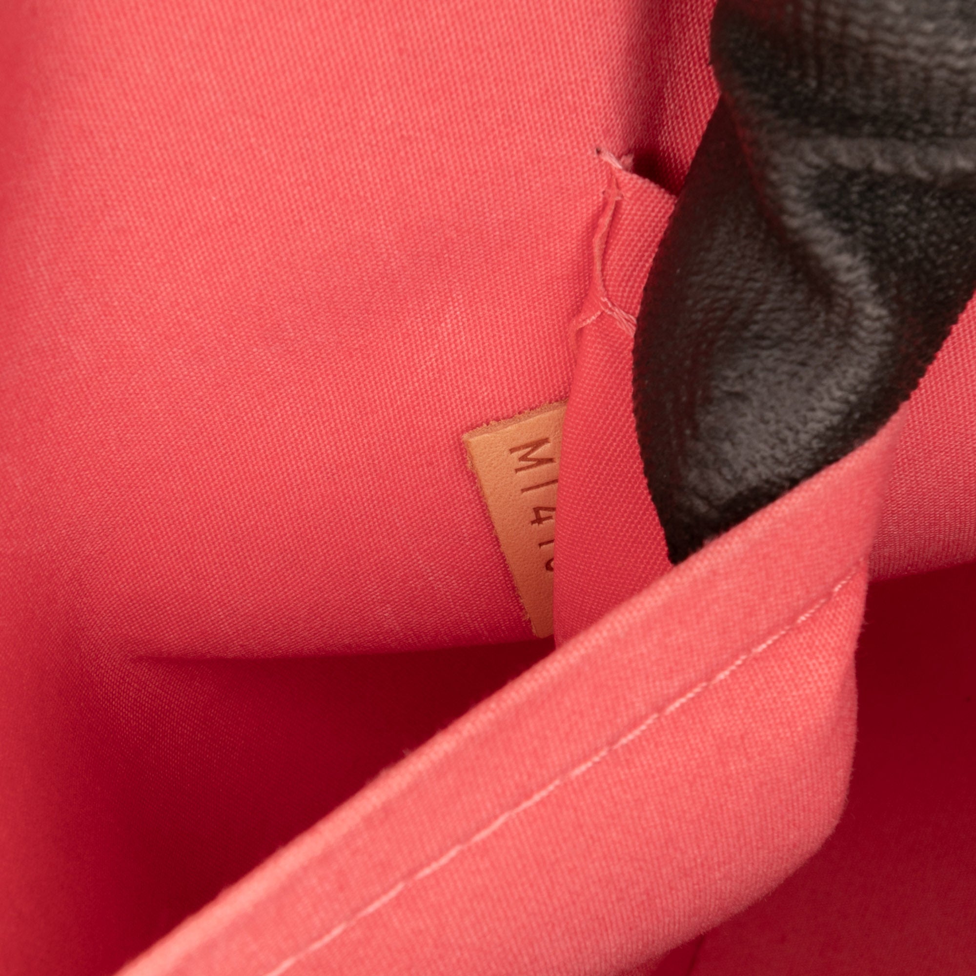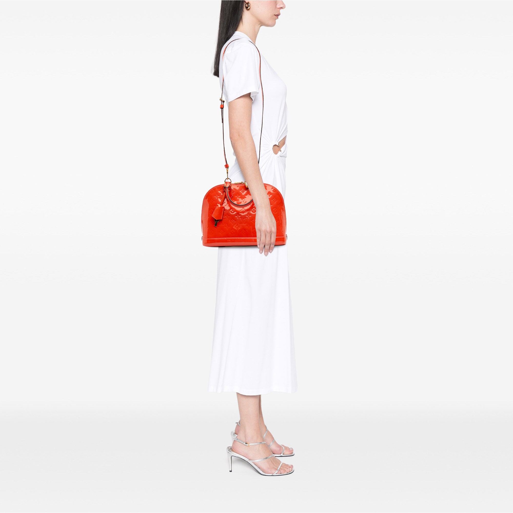 The Alma PM features a monogram vernis leather body, a clochette, rolled leather handles, a top zip closure, and interior slip pockets. Retail Price: 2350.00