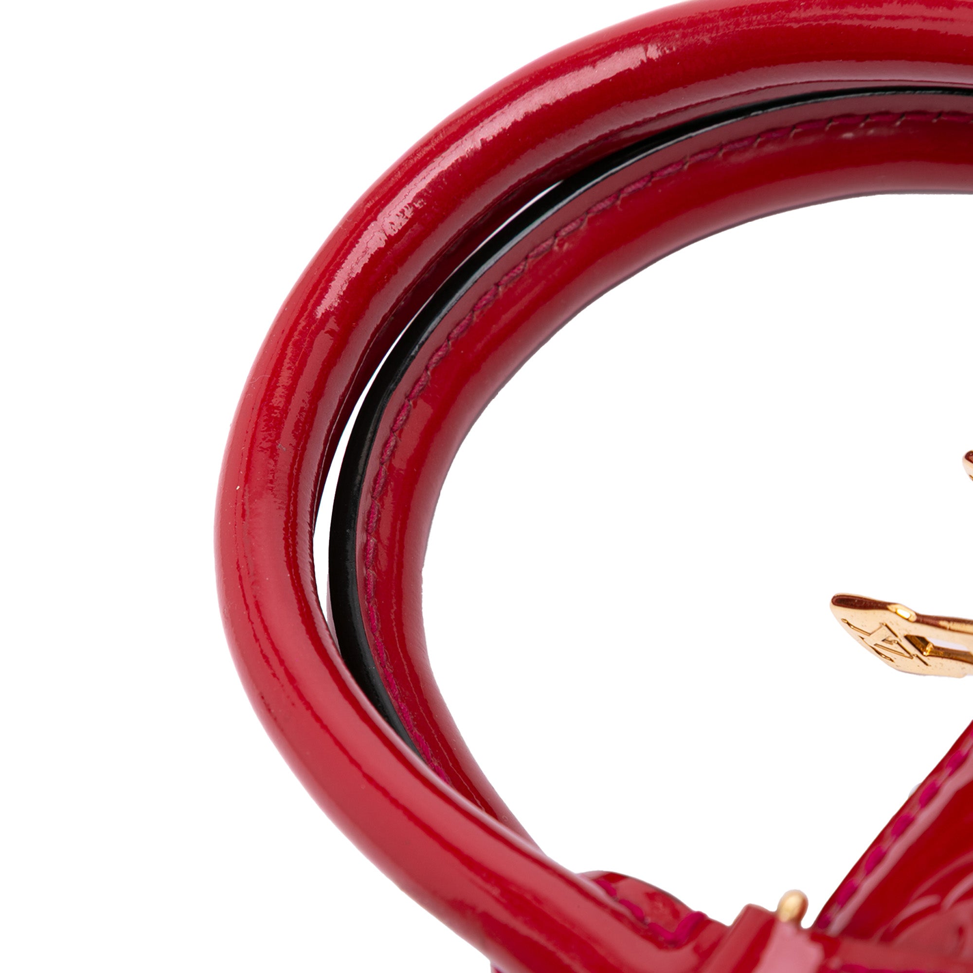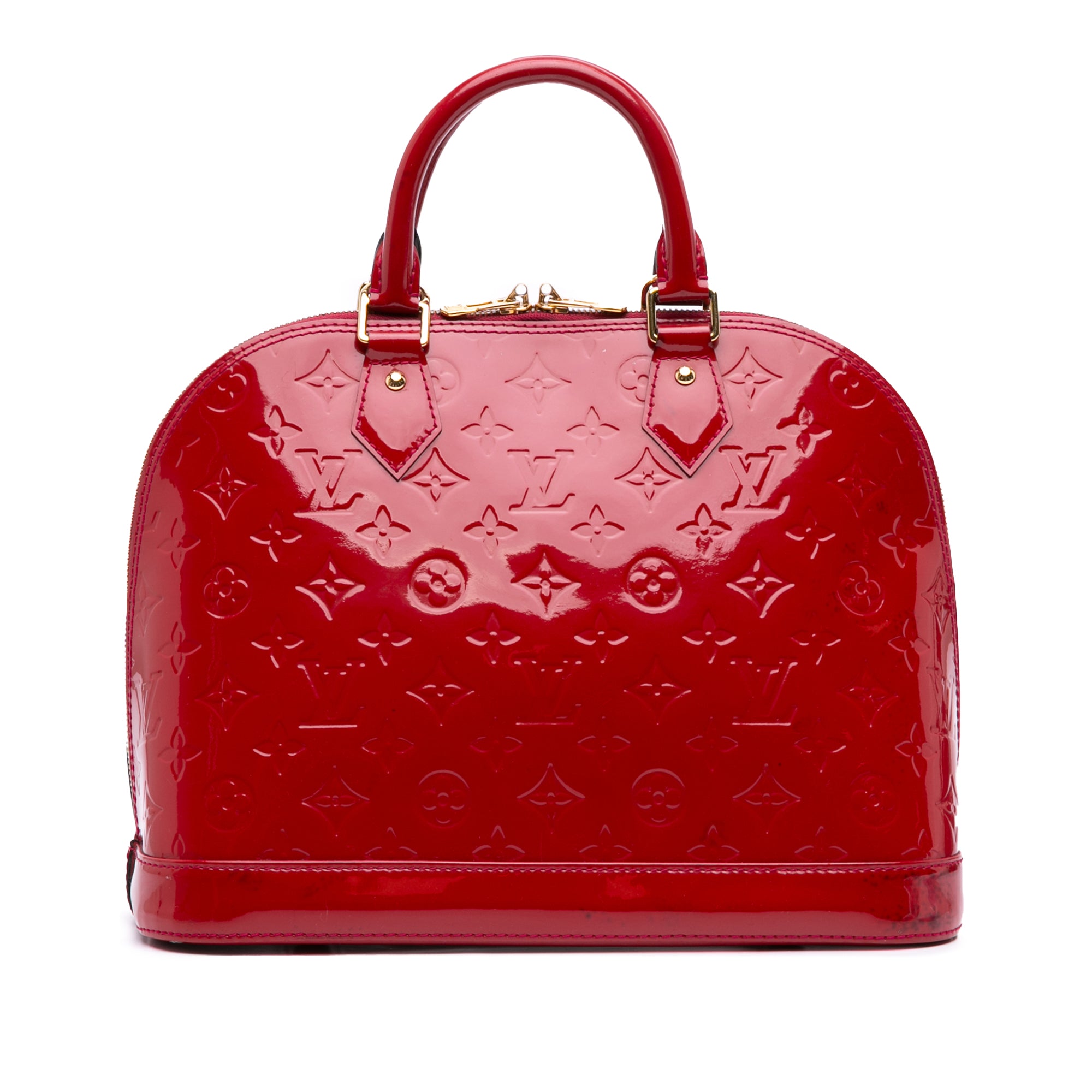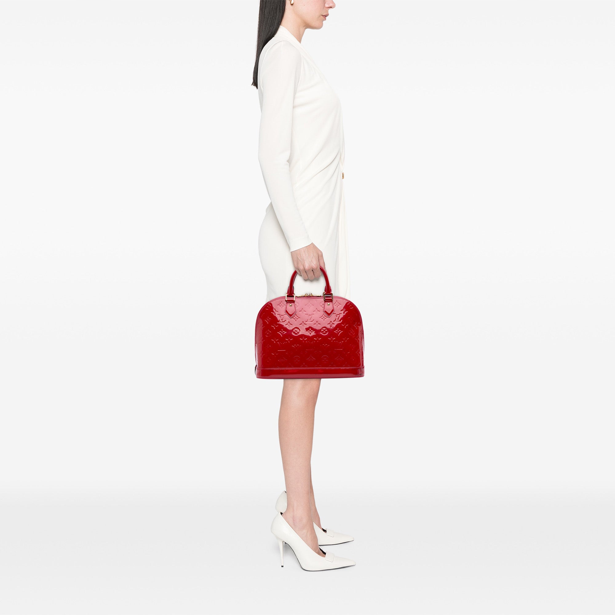 The Alma PM features a monogram vernis leather body, a clochette, rolled leather handles, a top zip closure, and interior slip pockets. Retail Price: 2350.00