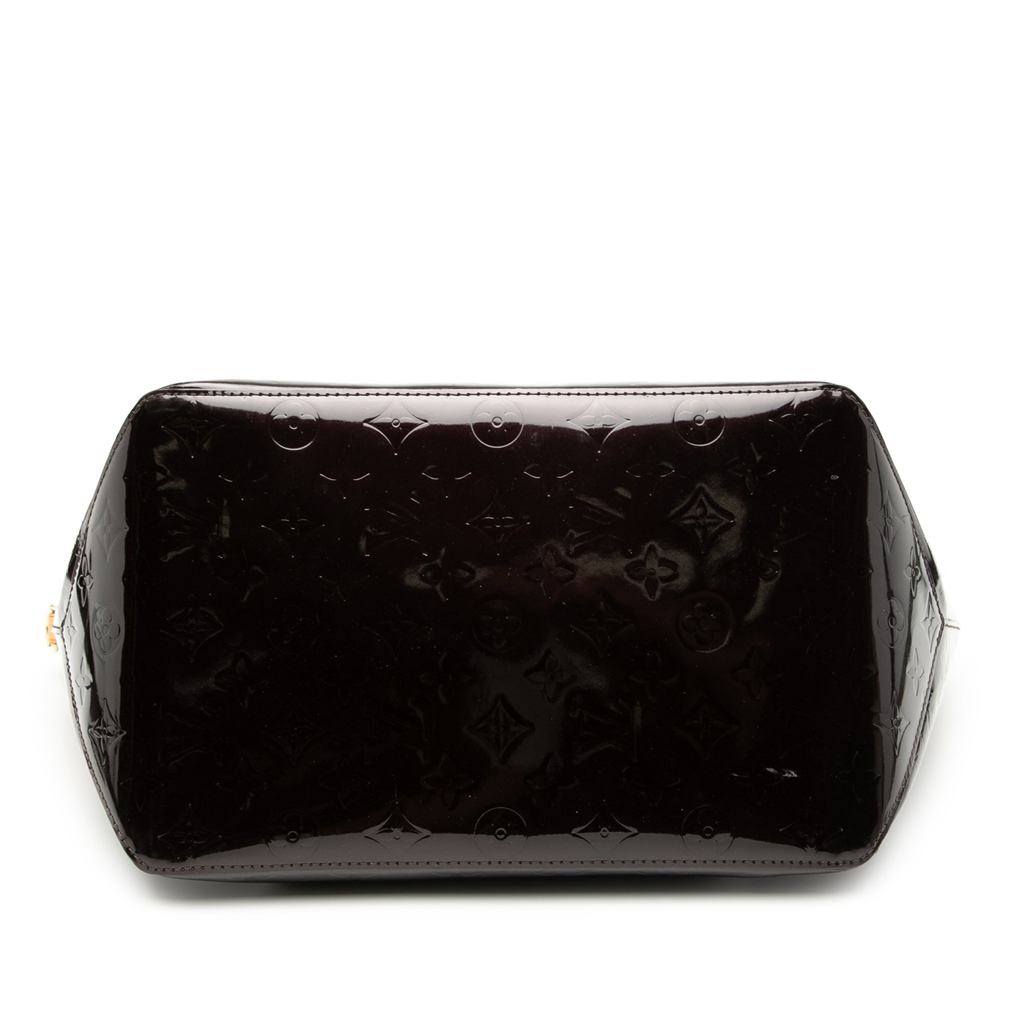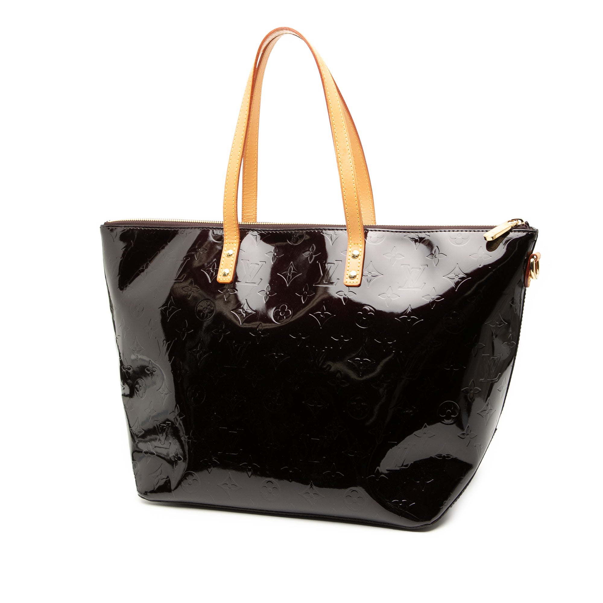 The Bellevue GM features a monogram vernis leather body, flat vachetta leather shoulder straps, a top zip closure, and interior slip pockets. Retail Price: 800.00