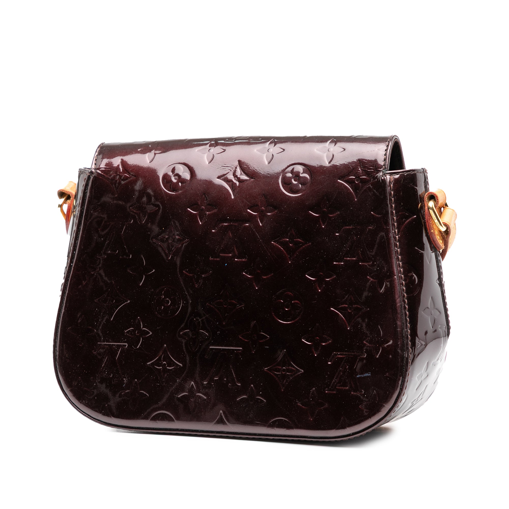 The Bellflower GM features a monogram vernis leather body, a flat vachetta shoulder strap, a front flap with a slip through closure, and an interior slip pocket. Retail Price: 1640.00