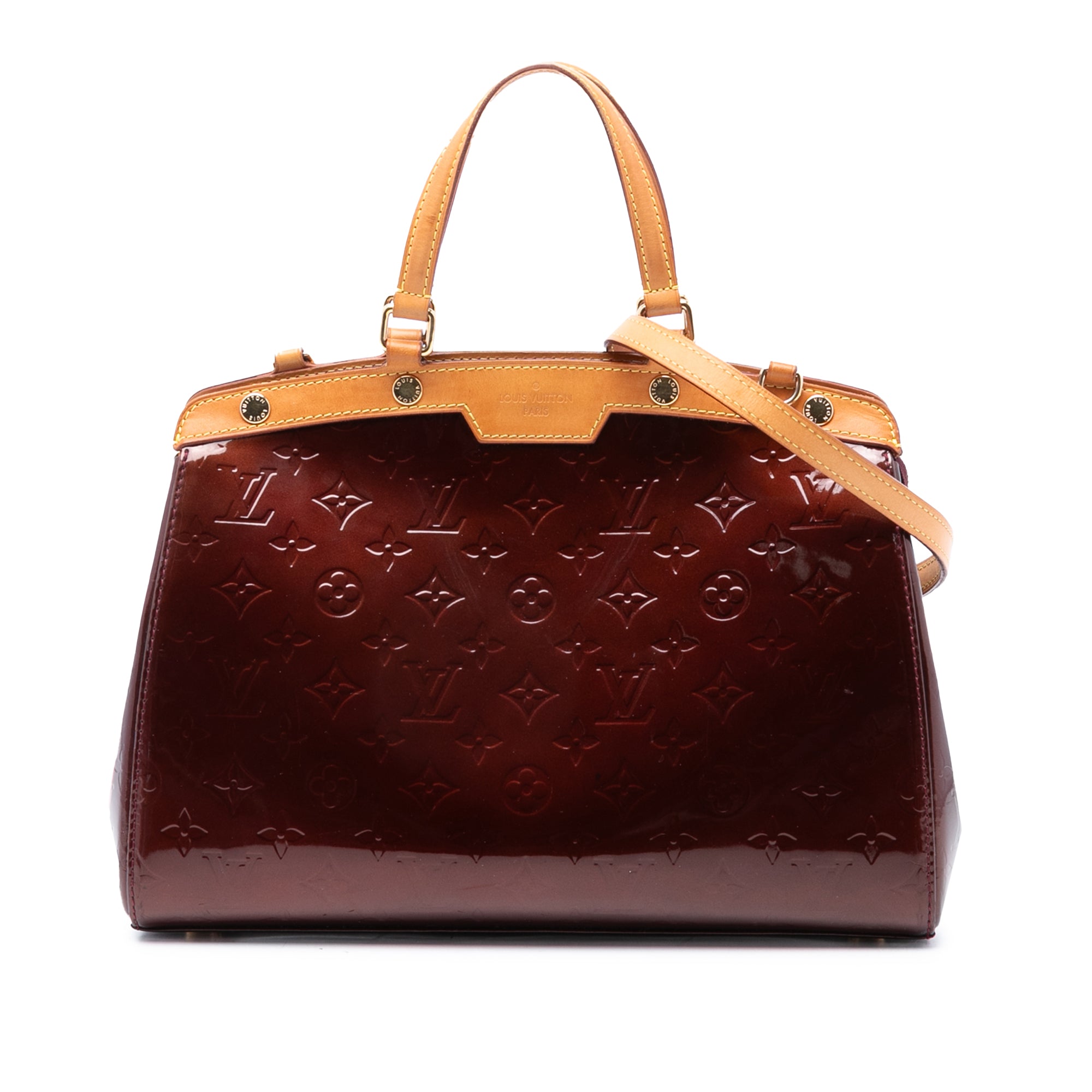 The Brea MM features a vernis leather body with vachetta leather trim, flat vachetta leather handles, a detachable vachetta leather strap, a top zip closure, and interior zip and slip pockets. Retail Price: 2730.00