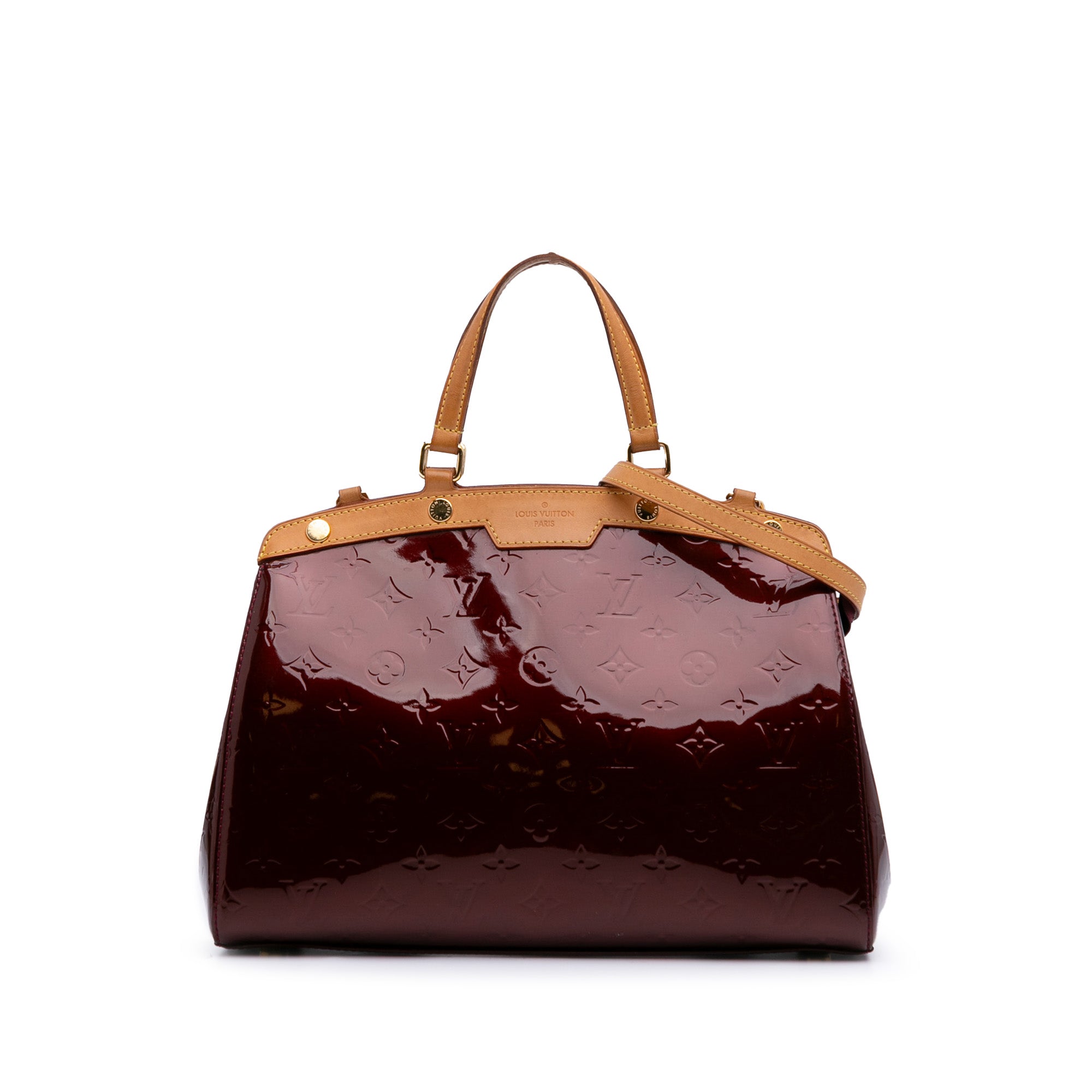 The Brea MM features a monogram vernis leather body with vachetta leather trim, flat vachetta leather handles, detachable vachetta leather strap, a top zip closure, and interior zip and slip pockets. Retail Price: 2730.00