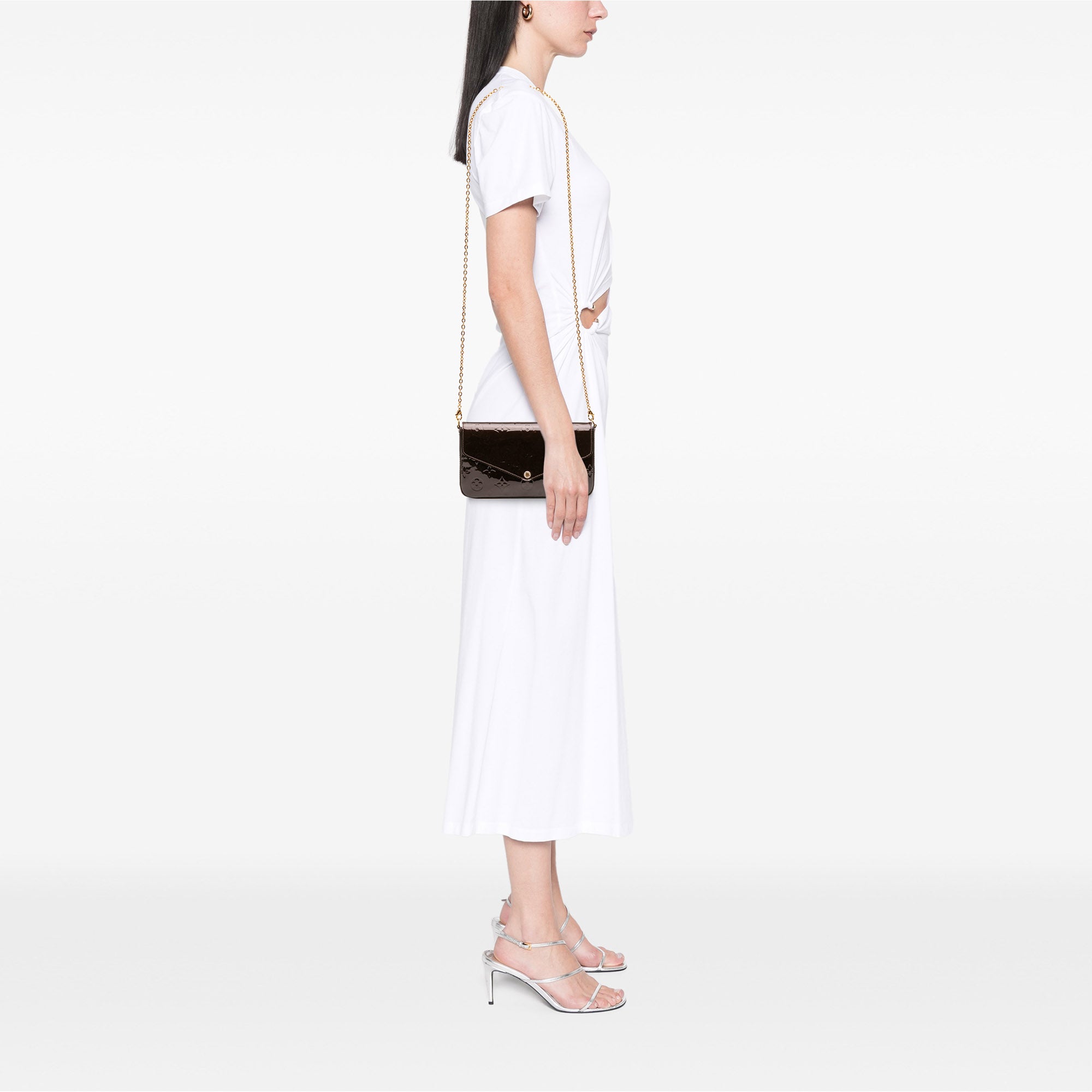 The Pochette Felicie features a vernis leather body, a detachable gold-tone chain strap, a top flap with snap button closure, and an interior slip pocket. Retail Price: 1620.00