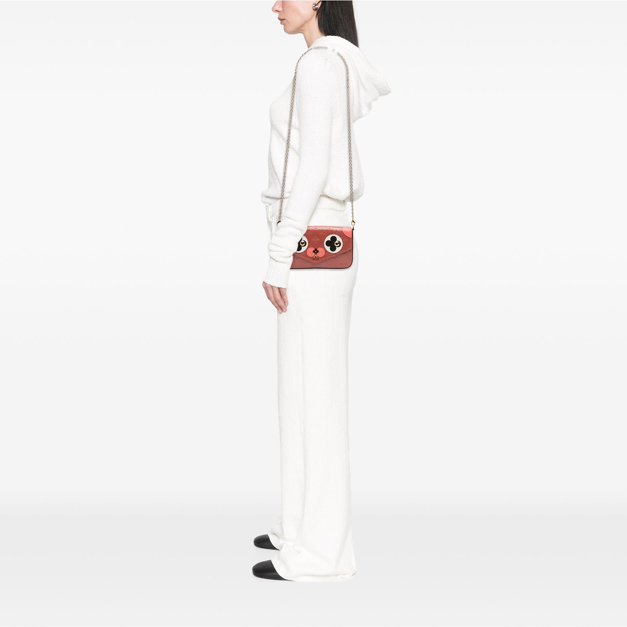 The Pochette Felicie features a monogram vernis body with dog design, a detachable chain link shoulder strap, a flap with magnetic snap closure, an interior slip pocket, and pouch inclusions. Retail Price: 1820.00