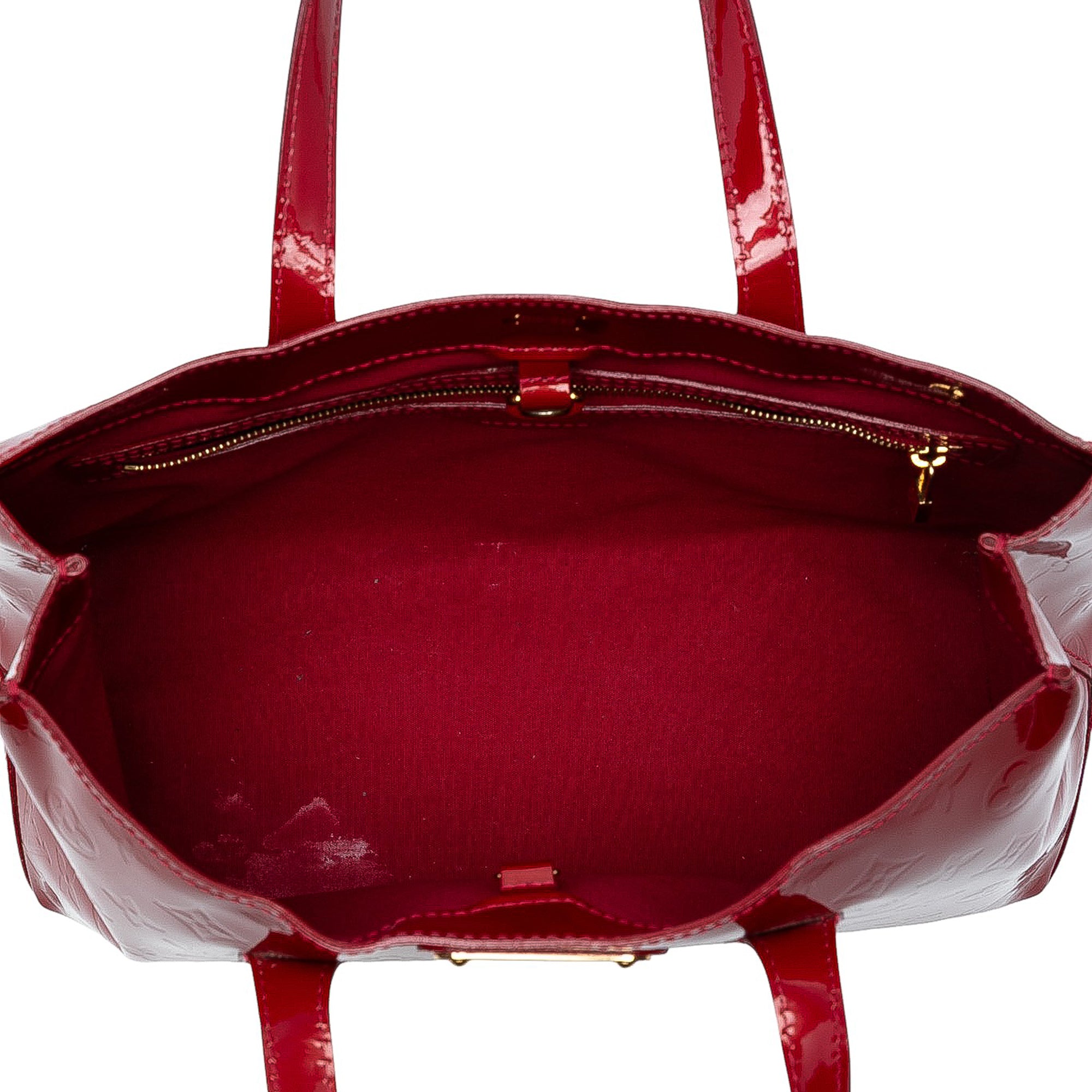 The Wilshire PM features a monogram vernis leather body, flat leather handles, an open top with a lobster claw clasp closure, and an interior zip pocket. Retail Price: 895.00