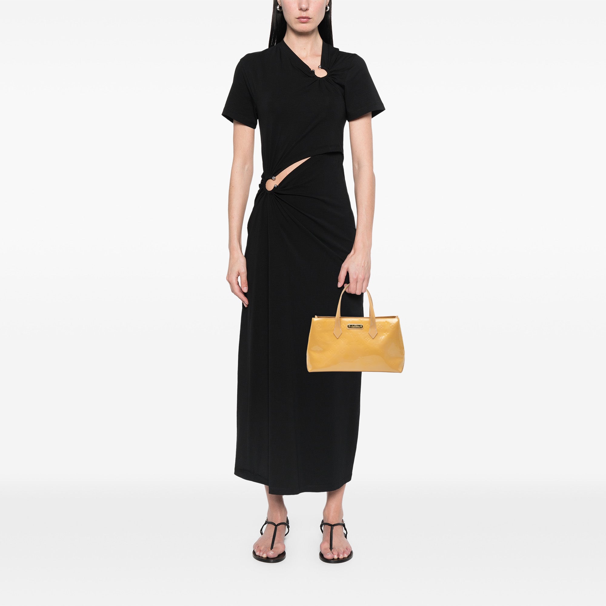 The Wilshire PM features a vernis leather body, flat handles, an open top with lobster claw closure, and an interior zip pocket. Retail Price: 890.00