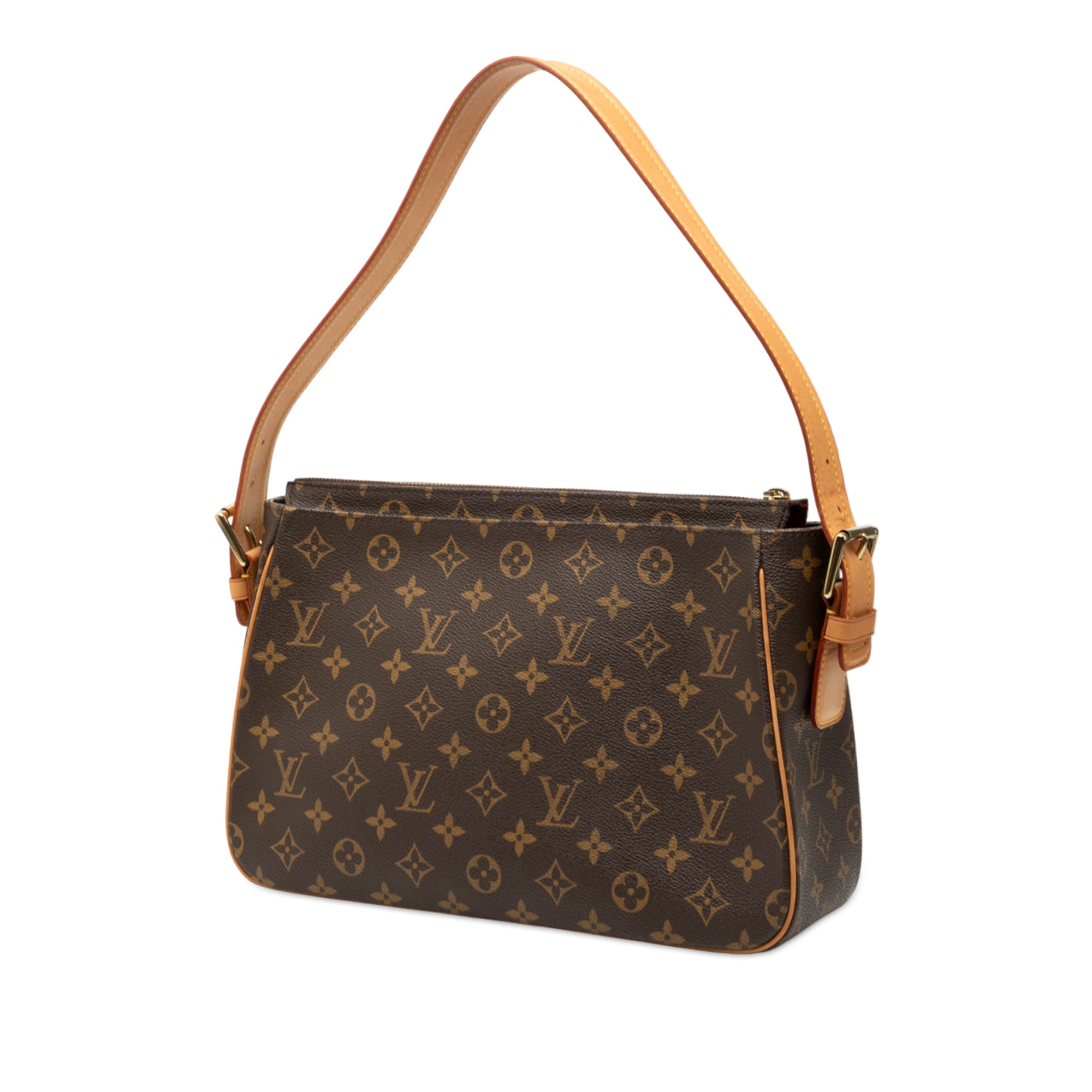 The Viva Cite features a monogram canvas body, an adjustable vachetta leather shoulder strap, a top zip closure, exterior front flap pockets and interior slip pockets. Inclusion: box. Retail Price: 1443.00
