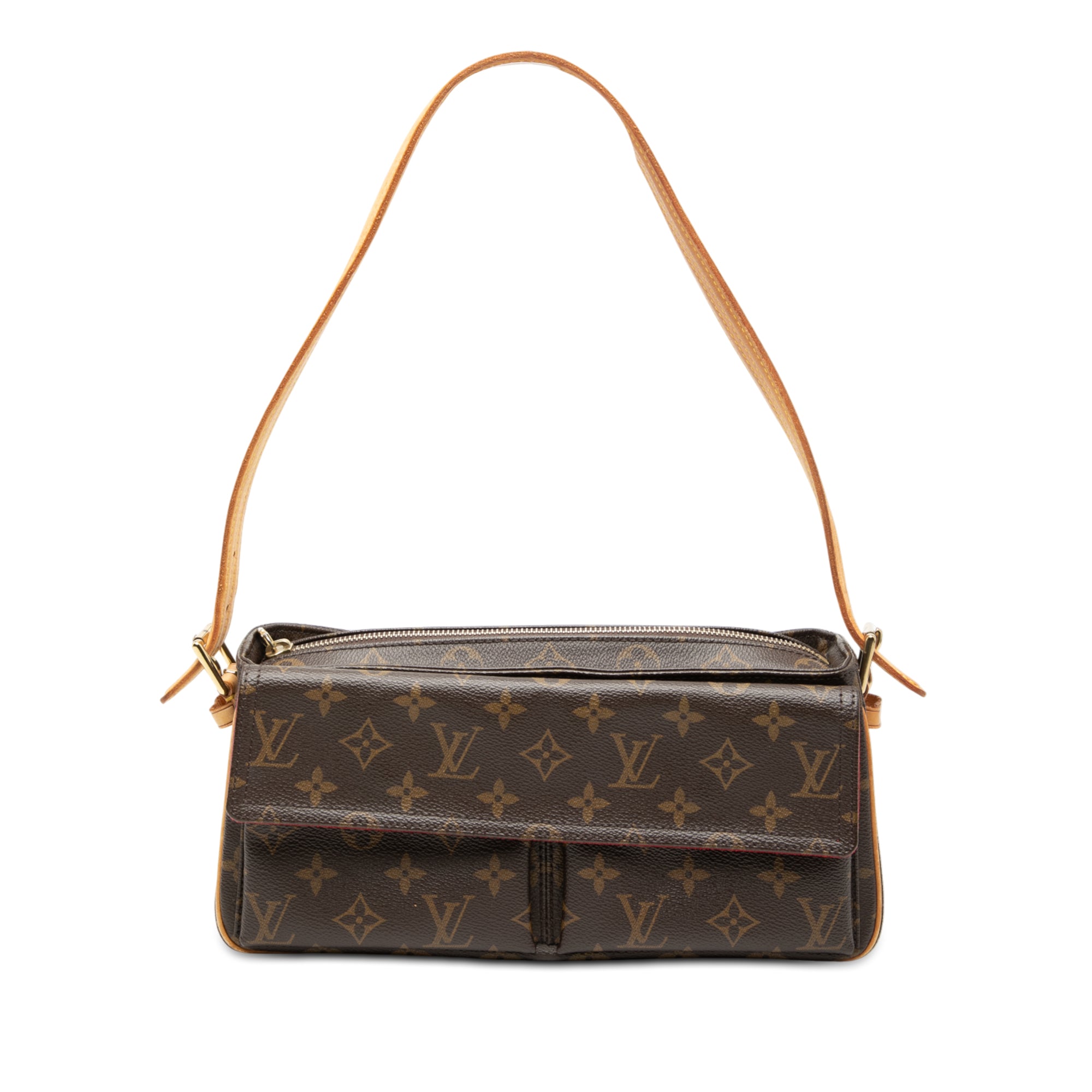 The Viva Cite MM features a monogram canvas body, an adjustable vachetta leather shoulder strap, a top zip closure, exterior flap pockets, and interior slip pockets. Retail Price: 1345.00