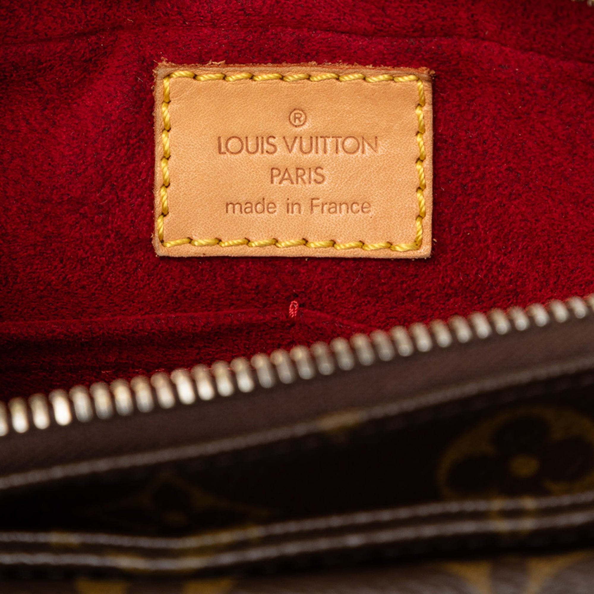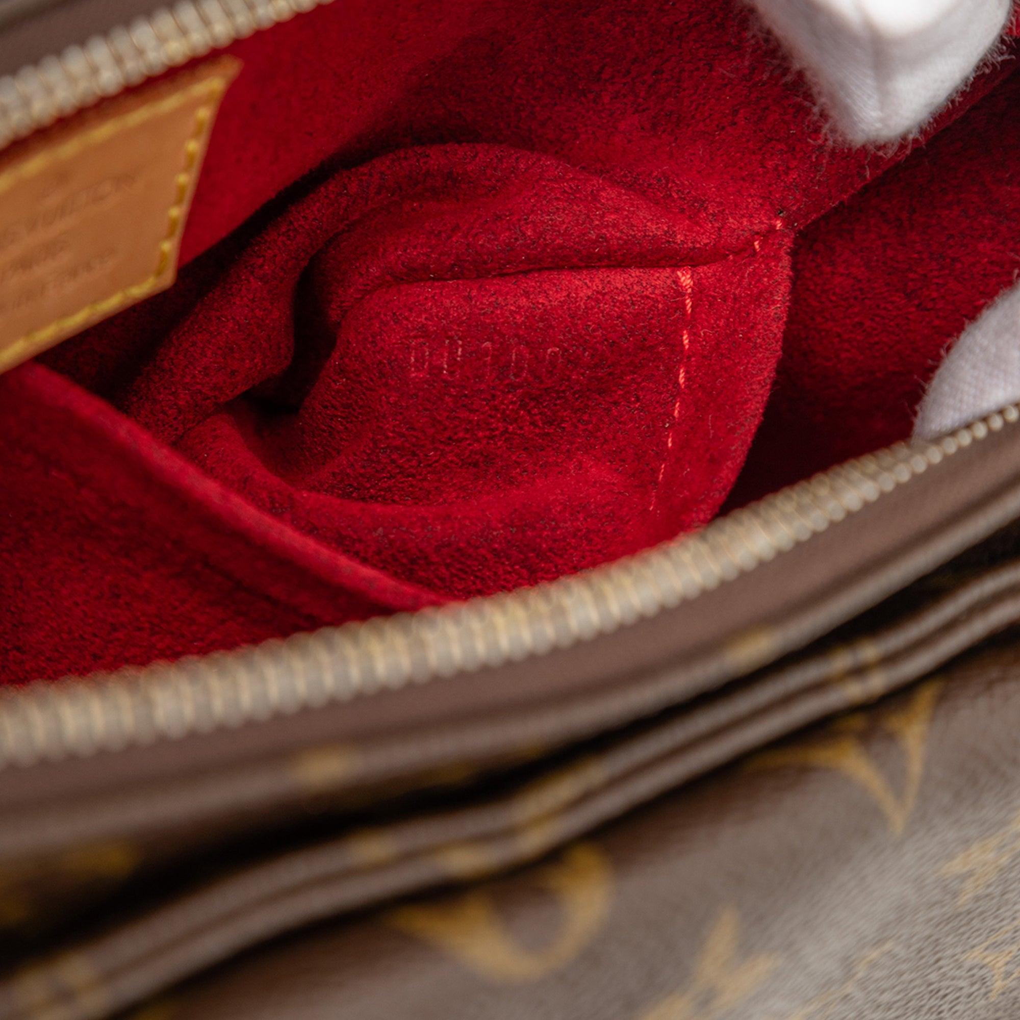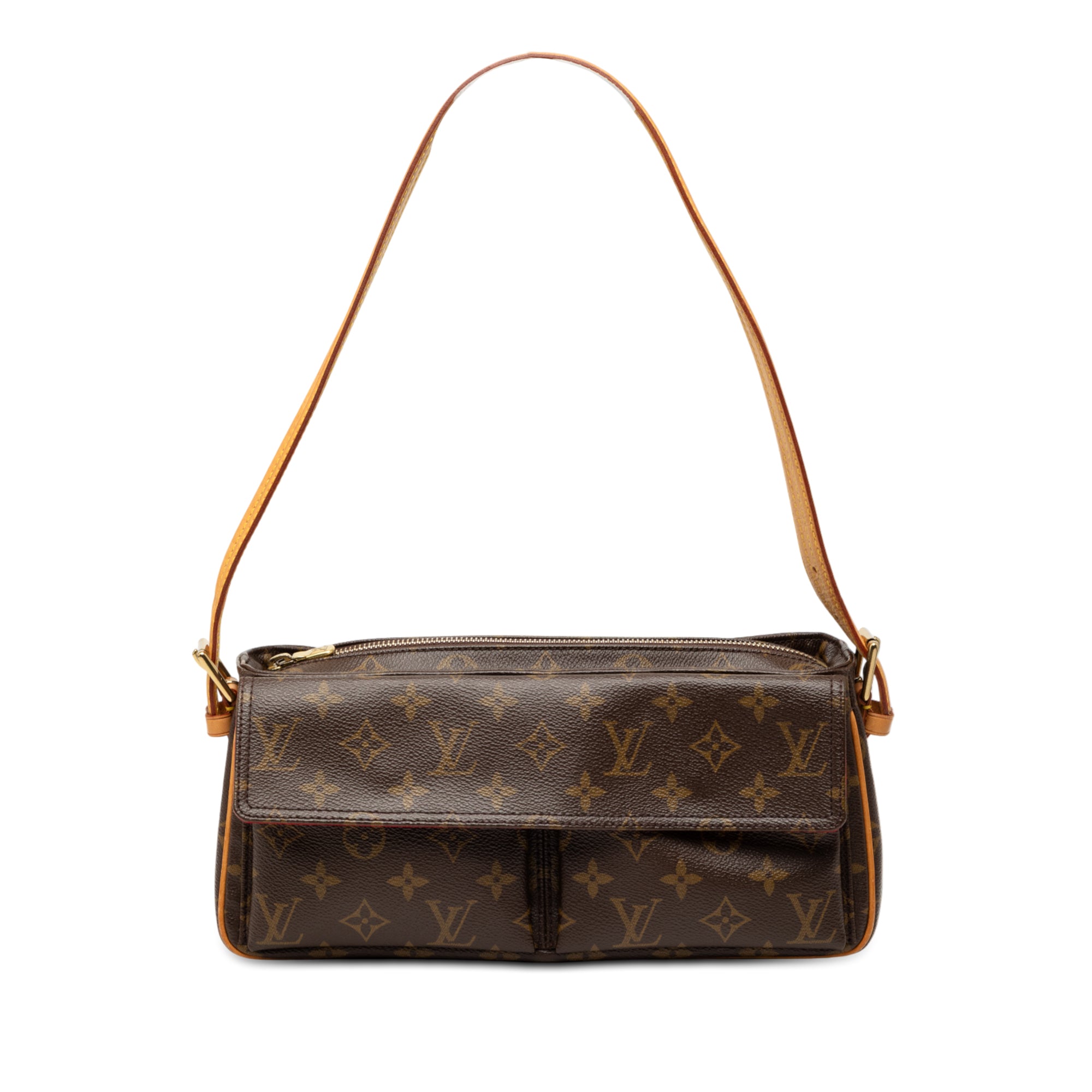 The Viva Cite MM features a monogram canvas body with vachetta leather trim, an adjustable vachetta leather shoulder strap, exterior flap pockets, a top zip closure, and an interior slip pocket. Retail Price: 1345.00