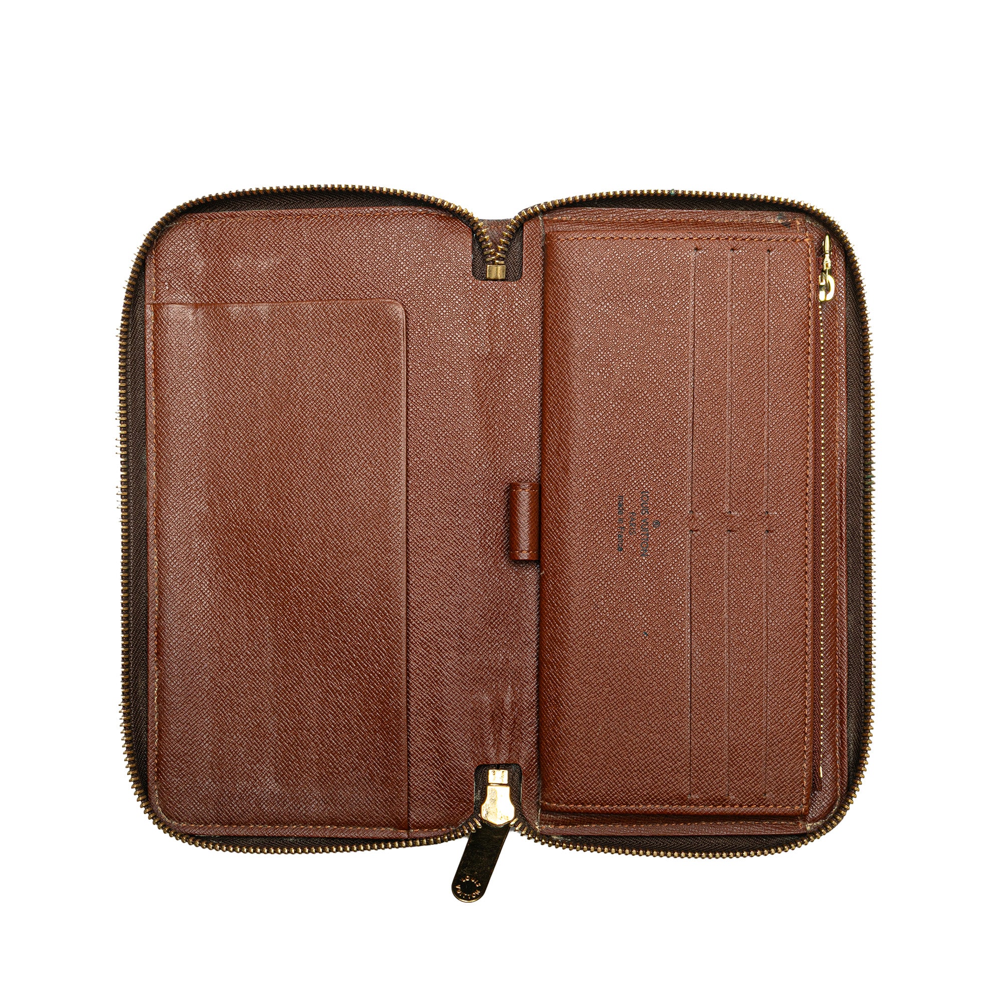 This organizer wallet features a monogram canvas body, a zip around closure, and interior zip and slip compartments. Retail Price: 1000.00
