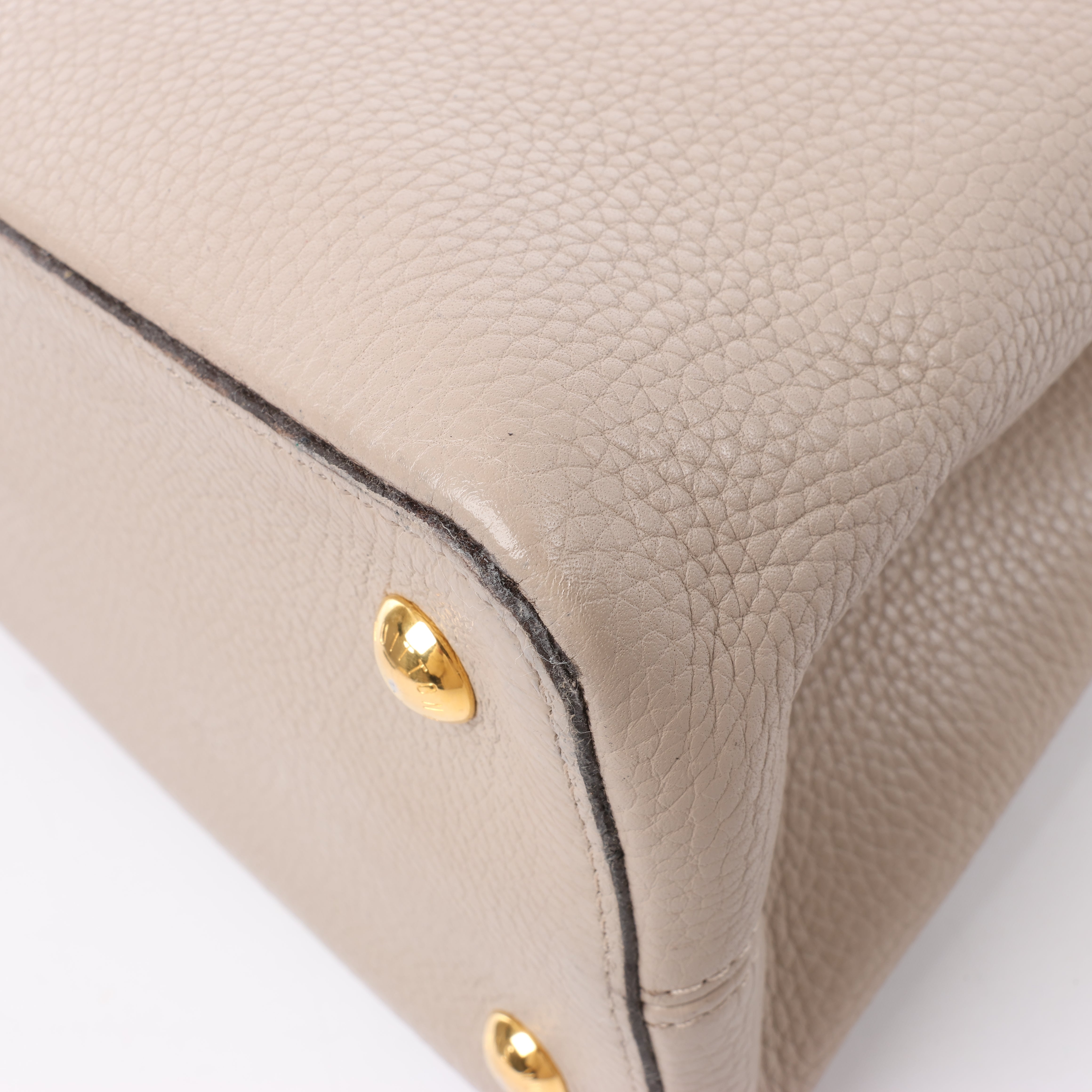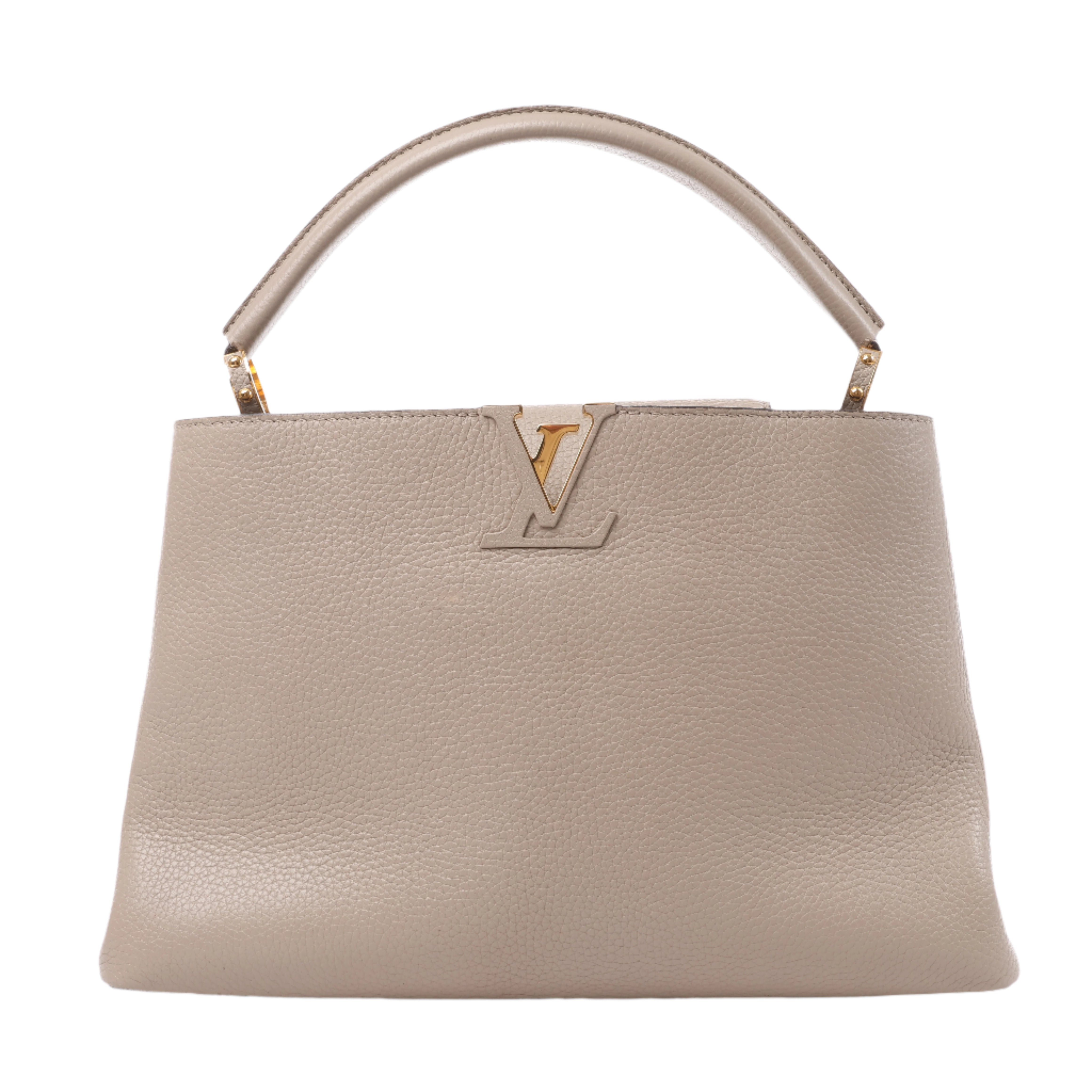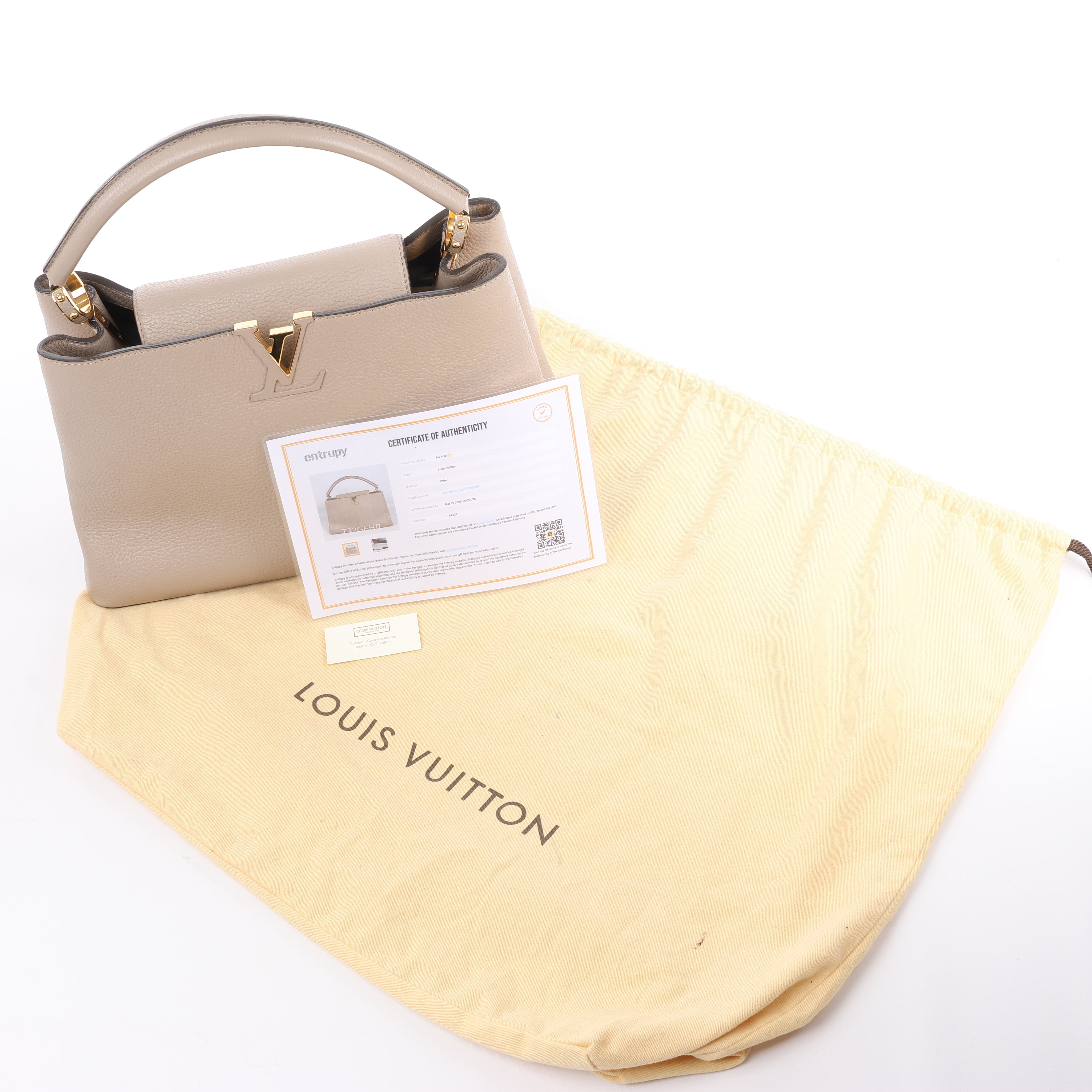 Brand: LOUIS VUITTON Model: CapucinesSize: MM Width: 35,5 cmHeight: 23 cm Exterior Condition: ExcellentInterior Condition: ExcellentCondition Details: The exterior leather is clean and beautiful with light creases. The handle is clean and firm, but has some creases. Note: The shoulder strap is missing. The hardware remains bright and clean, but has hairline scratches. The interior leatheris in excellent condition, but some glazings are destroyed that made a little mess. Overall the bag looks great! Date code: TR4123Colour: Beige (Taupe)Interior Colour: Brown Hardware Colour: GoldMaterial: LeatherComes With: Dustbag, Entrupy certificate