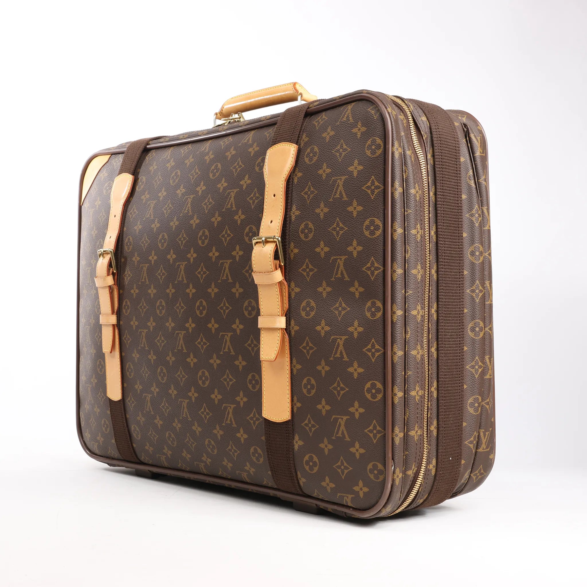 The Louis Vuitton Satellite 60 in Monogram canvas is a sophisticated soft-sided suitcase crafted for stylish travel. Featuring natural leather trim, buckle straps, and a spacious interior, it’s ideal for long getaways.