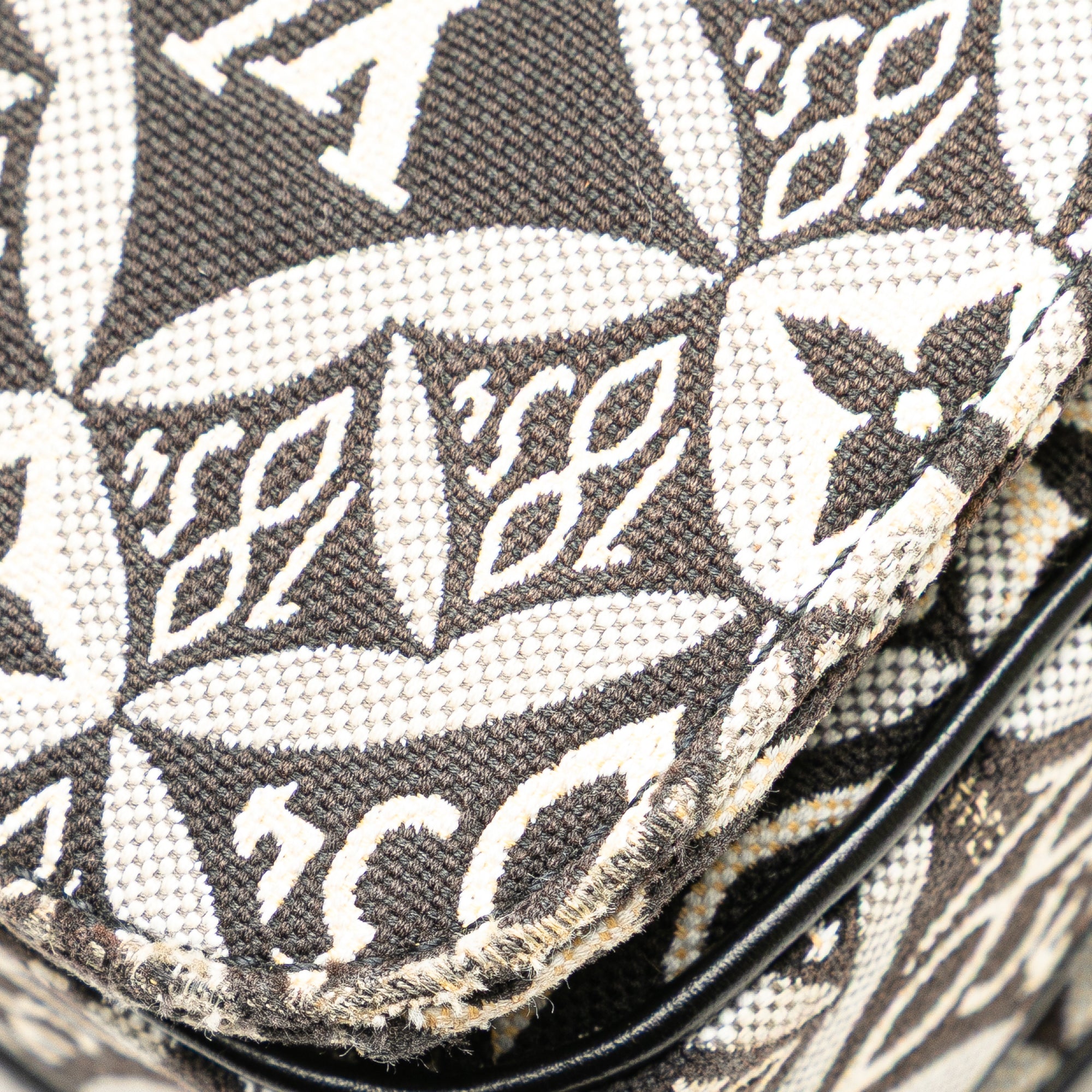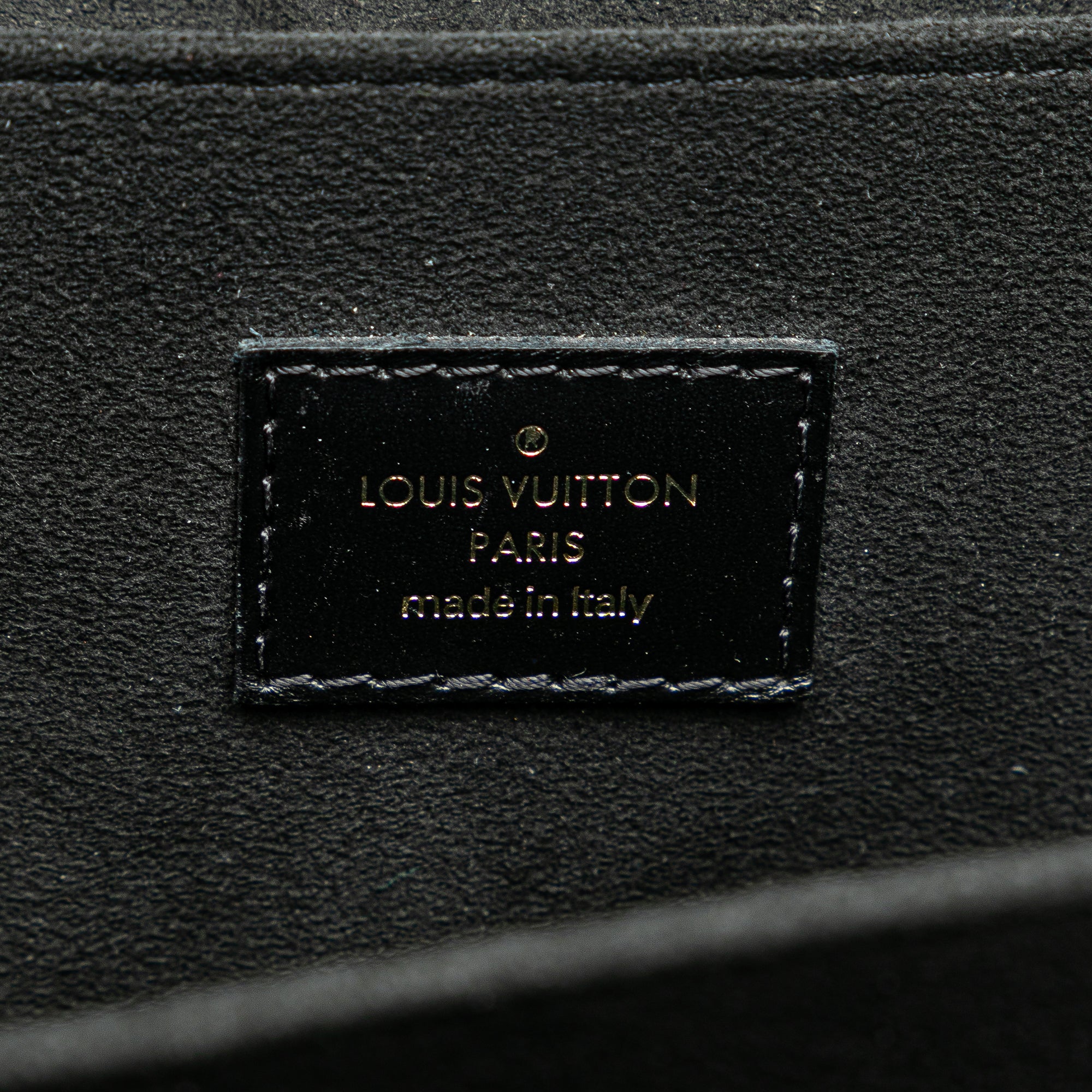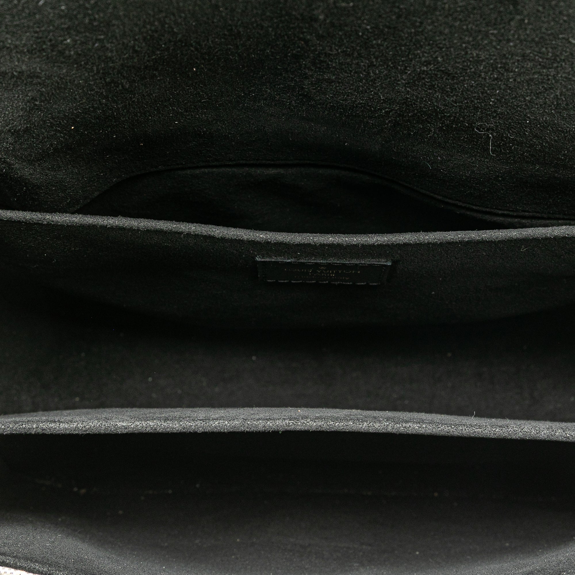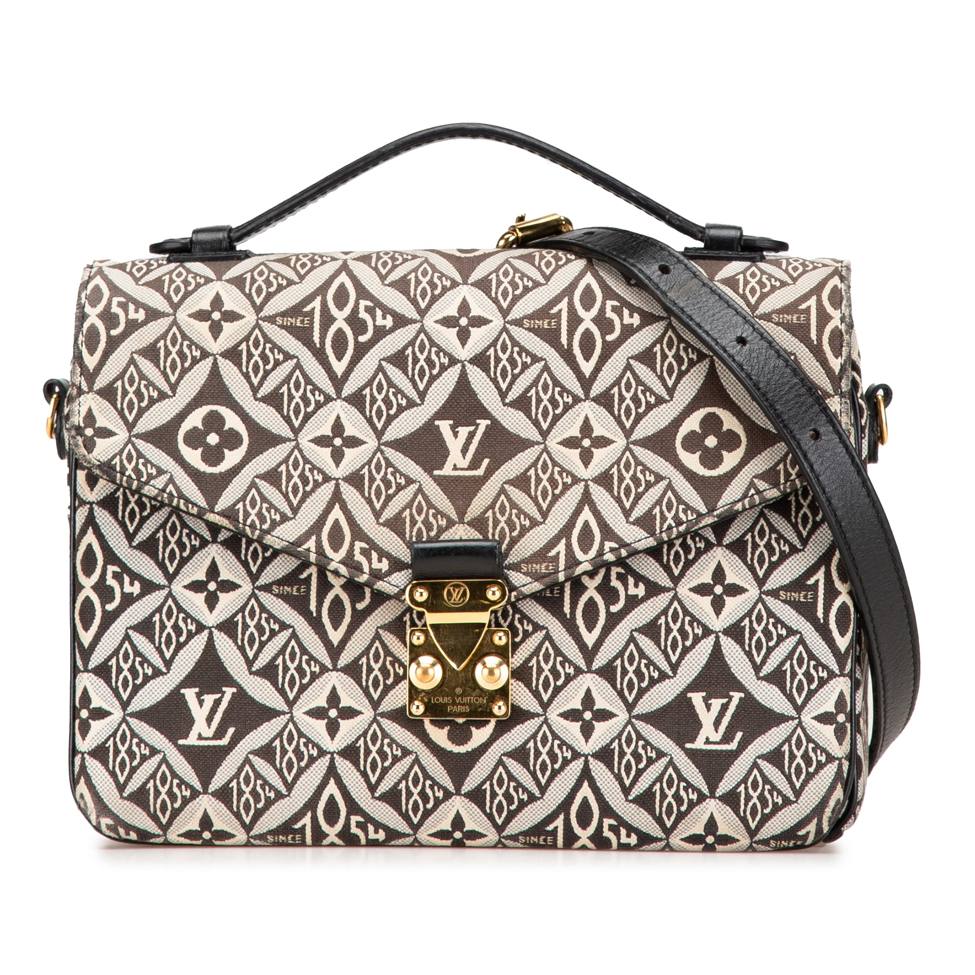 The Pochette Metis features a canvas body, a flat leather top handle, a detachable flat leather shoulder strap, a front flap with an S-lock closure, an exterior back zip pocket, and an interior slip pocket. Retail Price: 2420.00