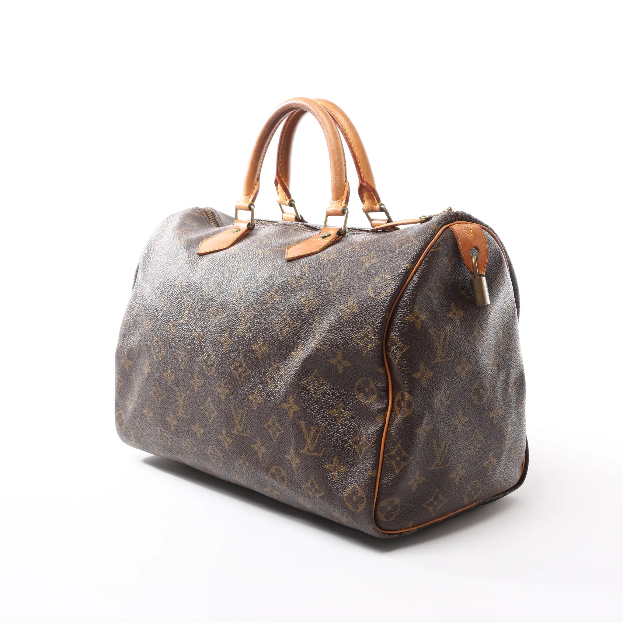 Louis Vuitton Speedy 35 handbag in brown Monogram canvas (M41524)—iconic zip-top satchel with vachetta leather handles and timeless LV style, offering extra room for everyday carry and travel-ready ease.