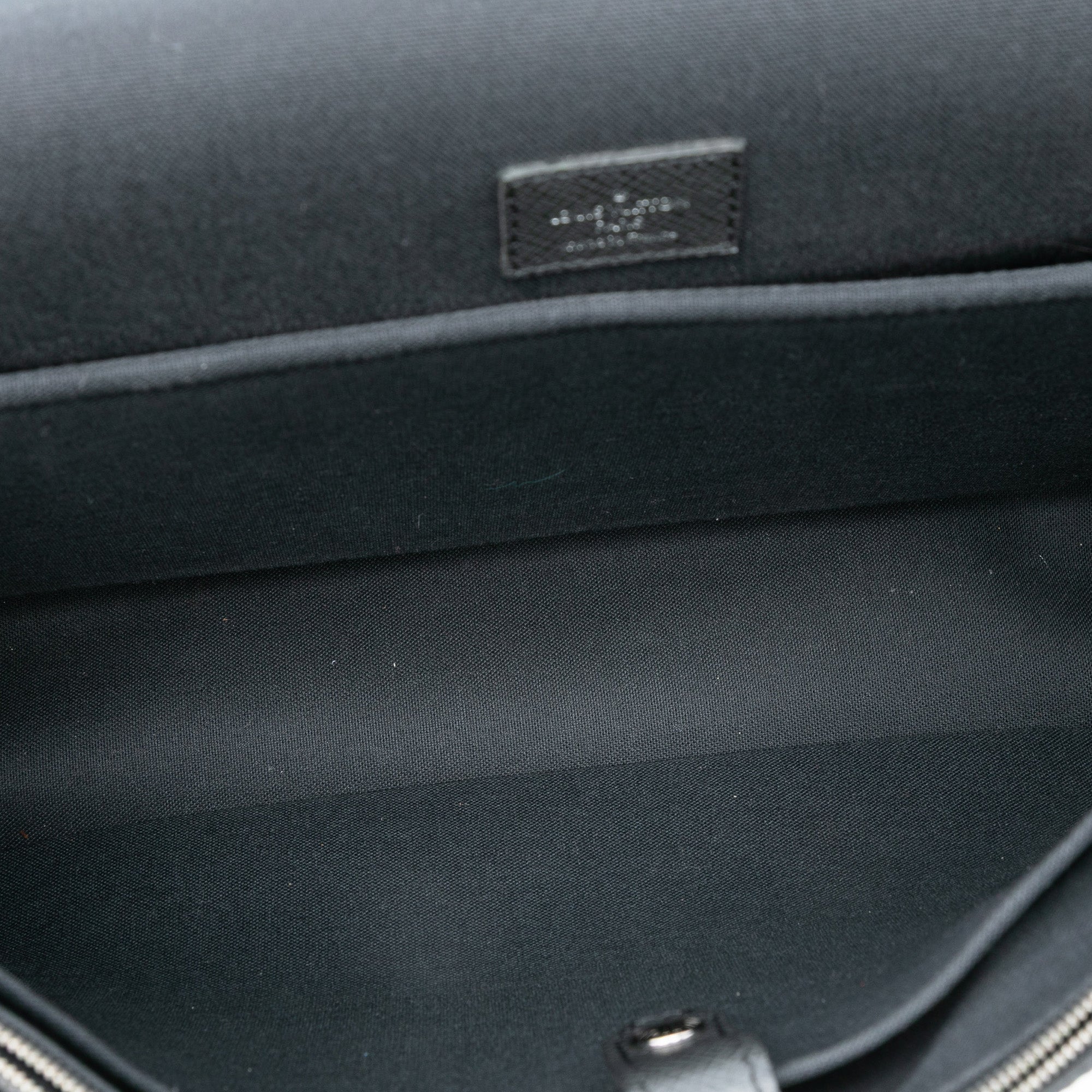 The Anton business bag features a taiga leather body, flat leather top handle, front flap with push lock closures, front slip pockets, and interior zip and slip pockets. Retail Price: 3250.00