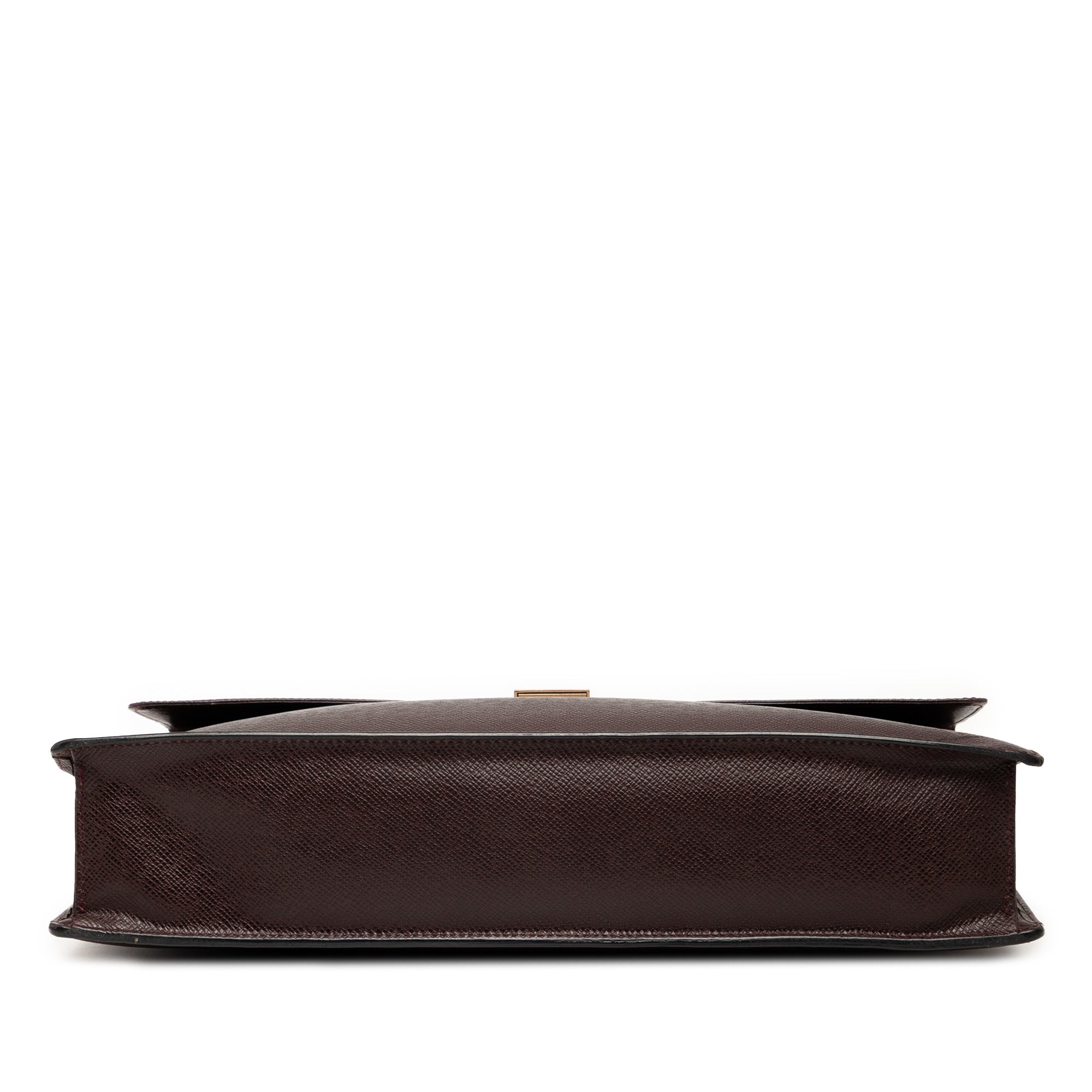 This business bag features a taiga leather body, exterior back open pocket, rolled leather handle, front flap with push lock closure, and interior open pockets. Retail Price: 2500.00