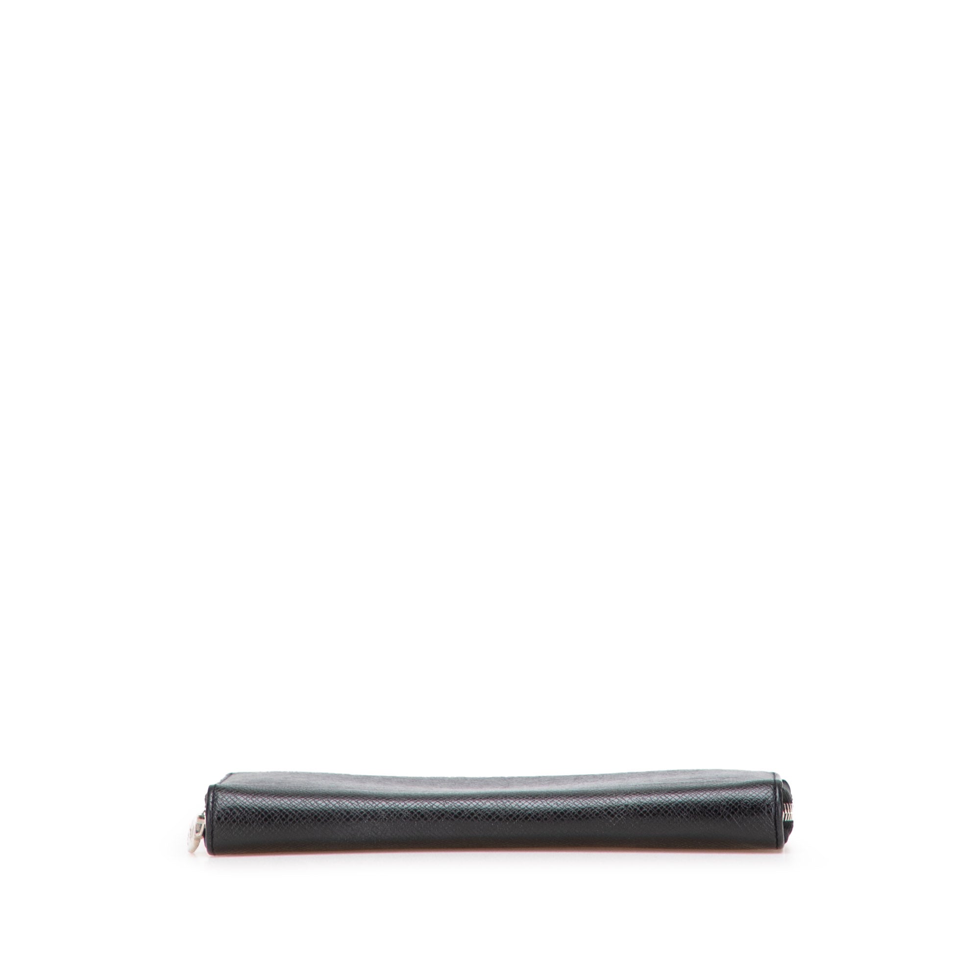 This long wallet features a taiga leather body, a zip around closure, an interior zip compartment, and interior slip pockets. Retail Price: 1120.00