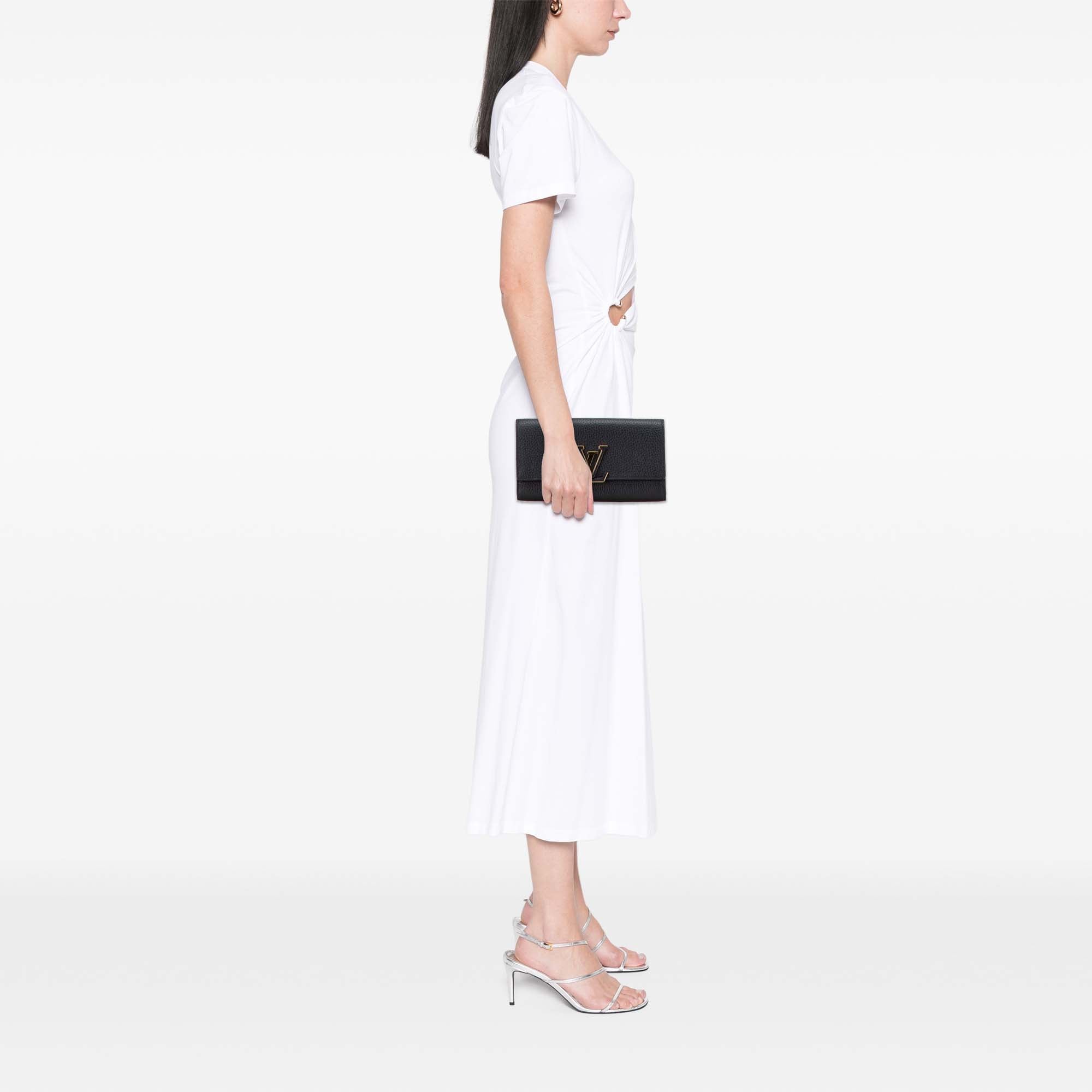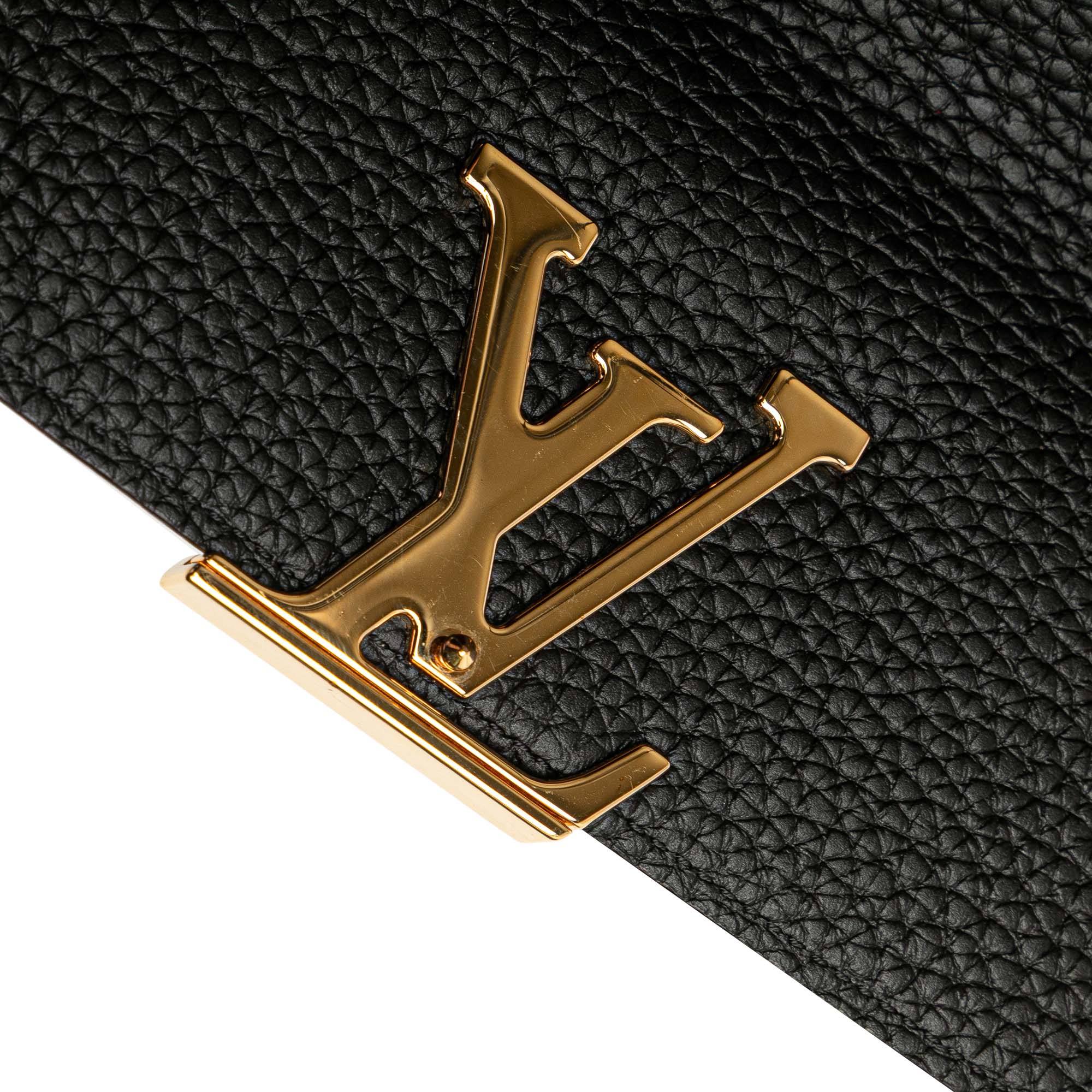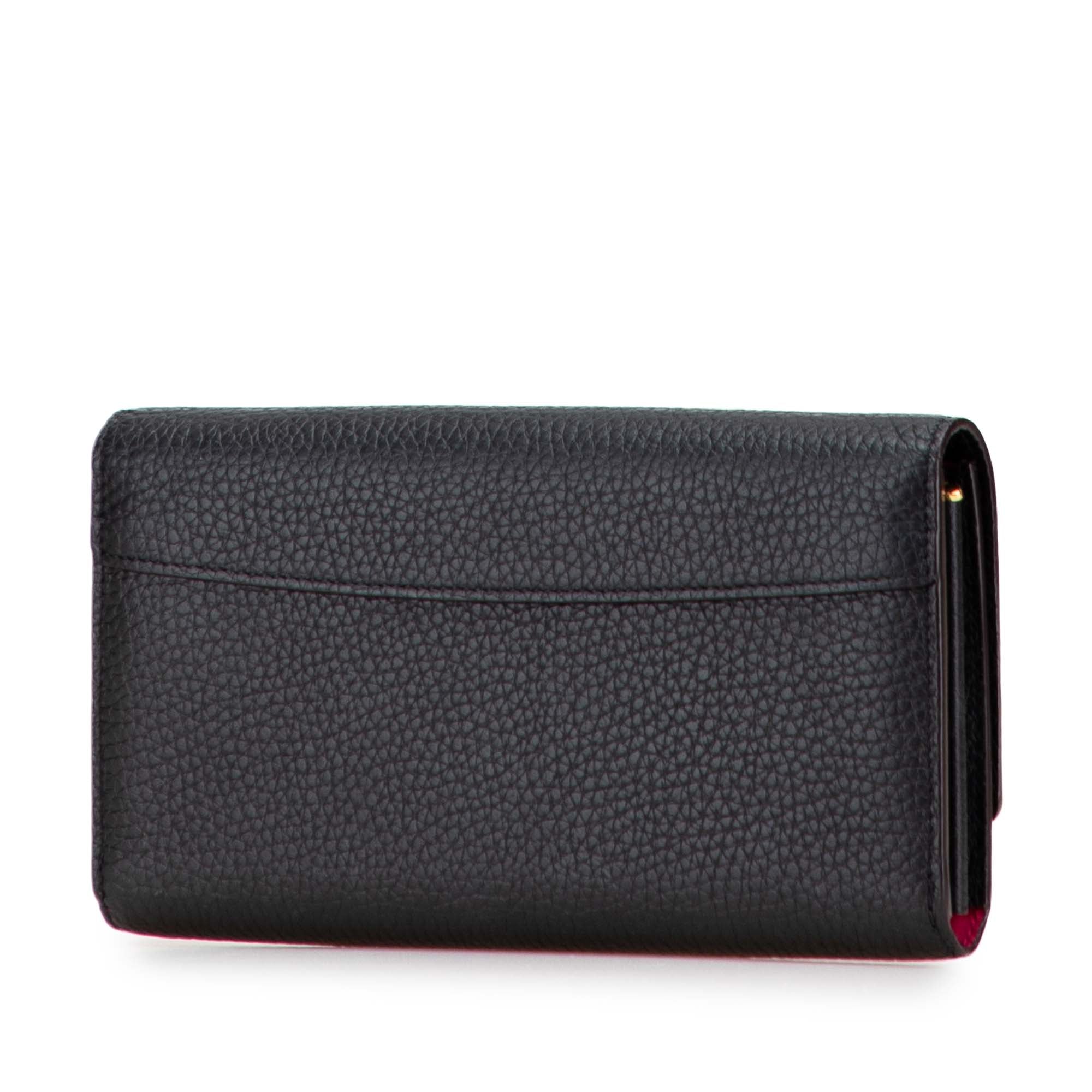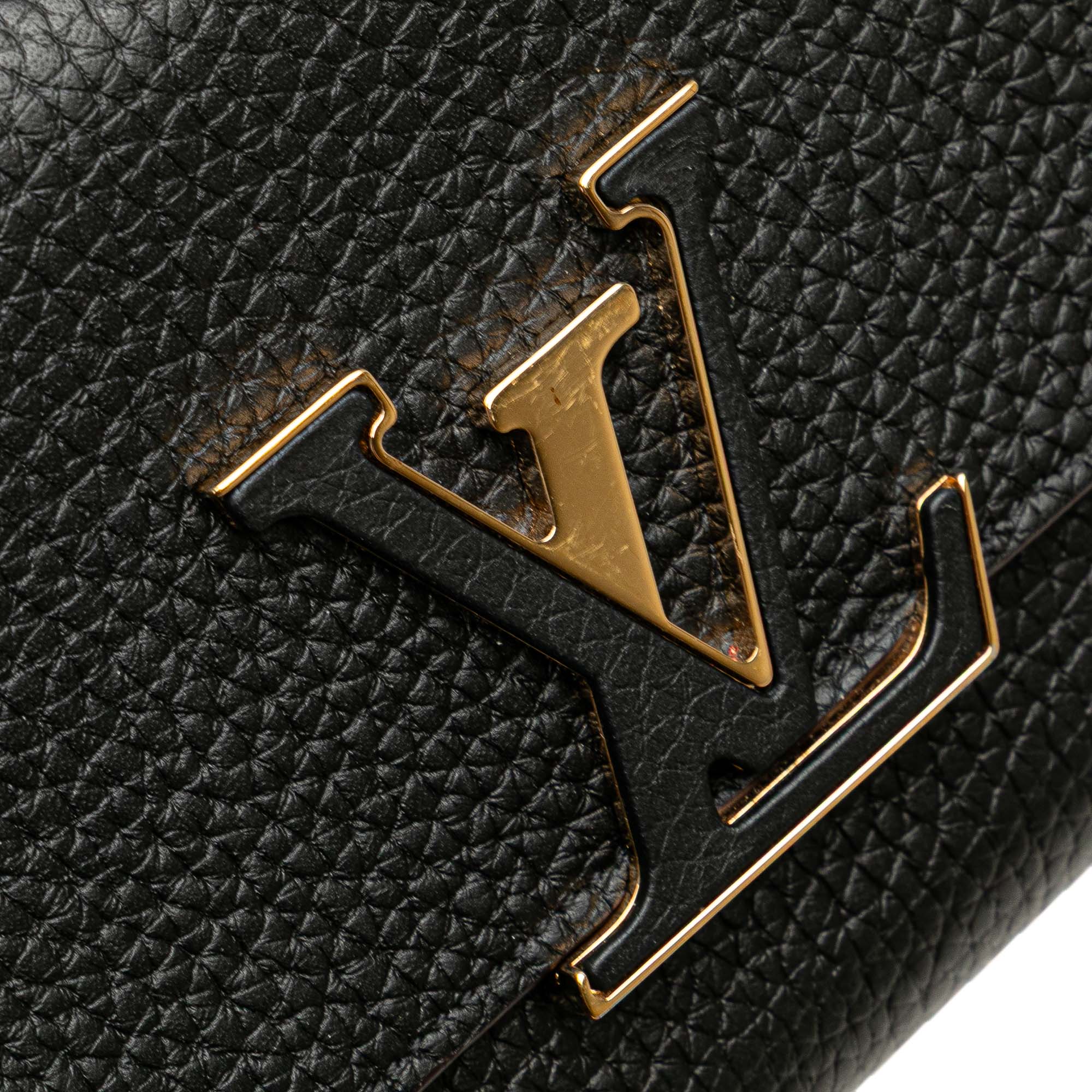 The Taurillon Capucines Wallet features a leather body, a front flap button closure, and interior zip and slip pockets. Inclusion: Dust bag, box. Retail Price: 1600.00