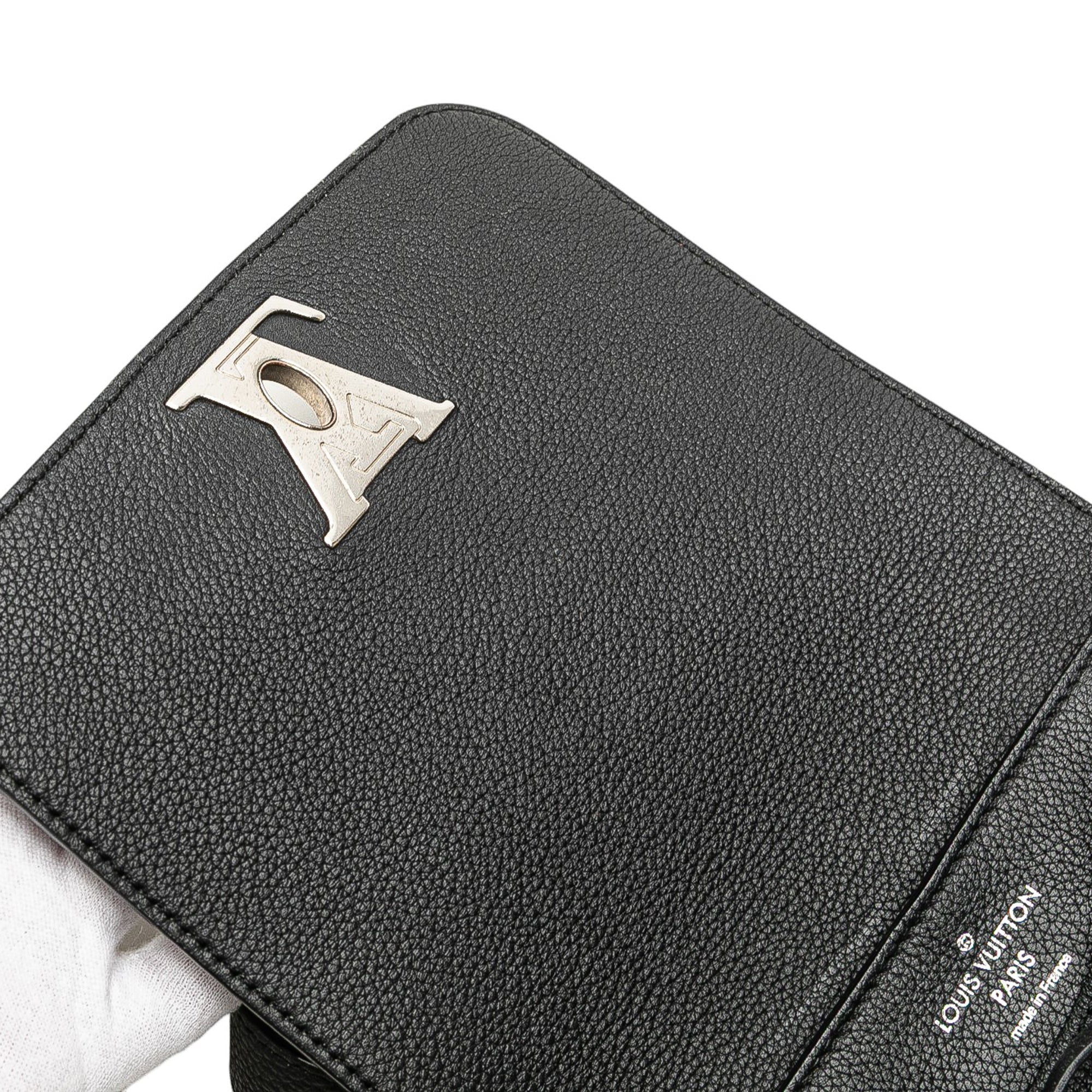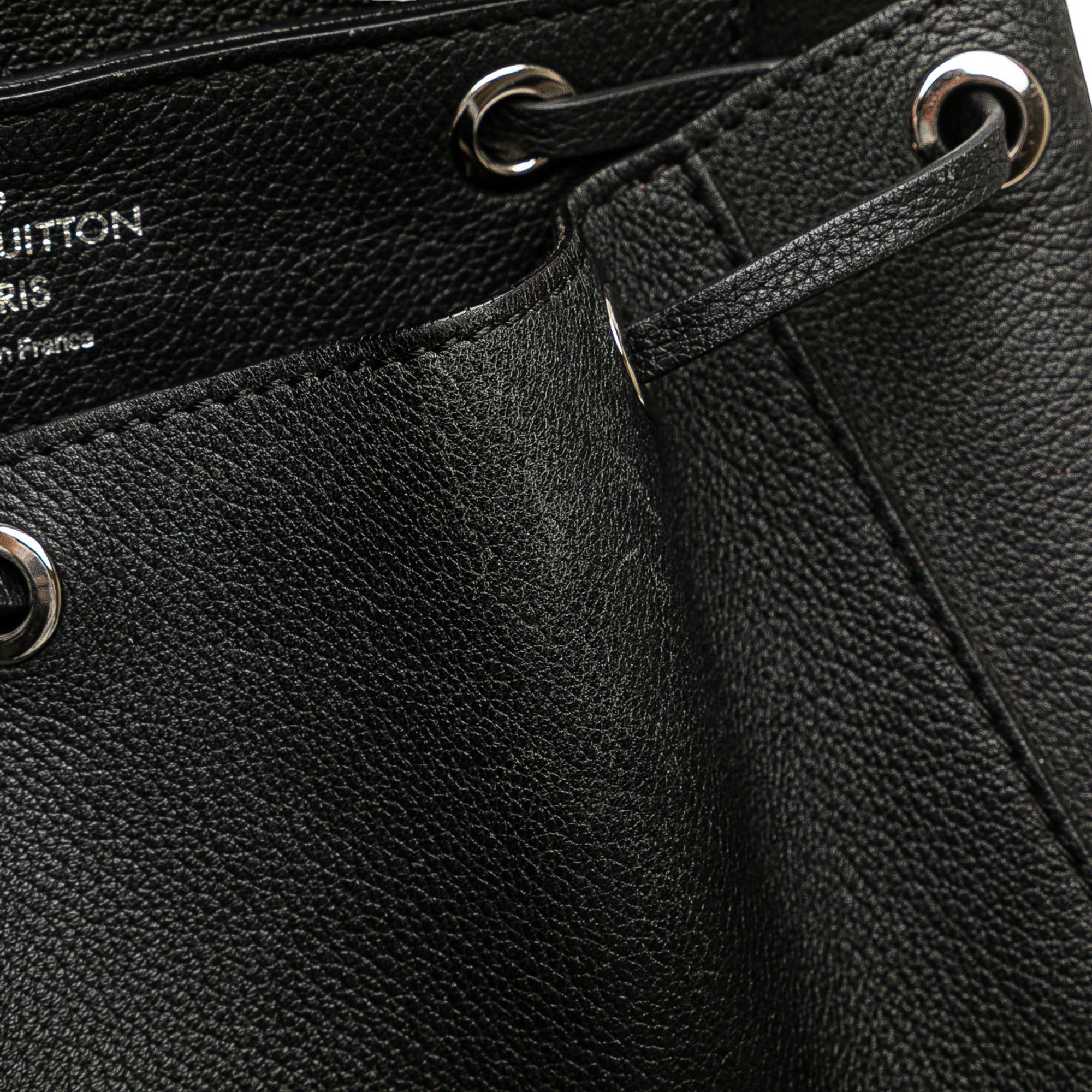 The Lockme backpack features a leather body, a rolled top handle, adjustable flat back straps, a top flap with a silver-tone turn lock closure, a drawstring closure, and an interior slip pocket. Retail Price: 2897.00