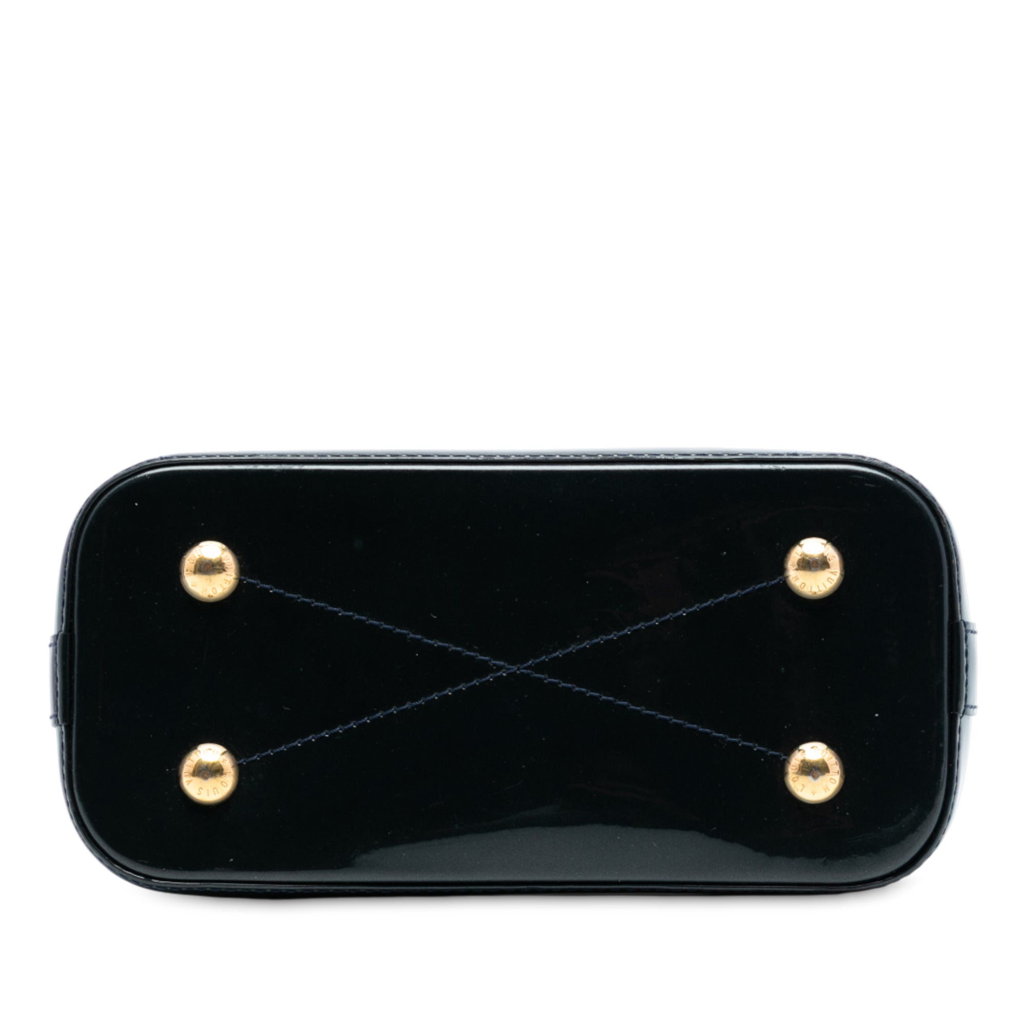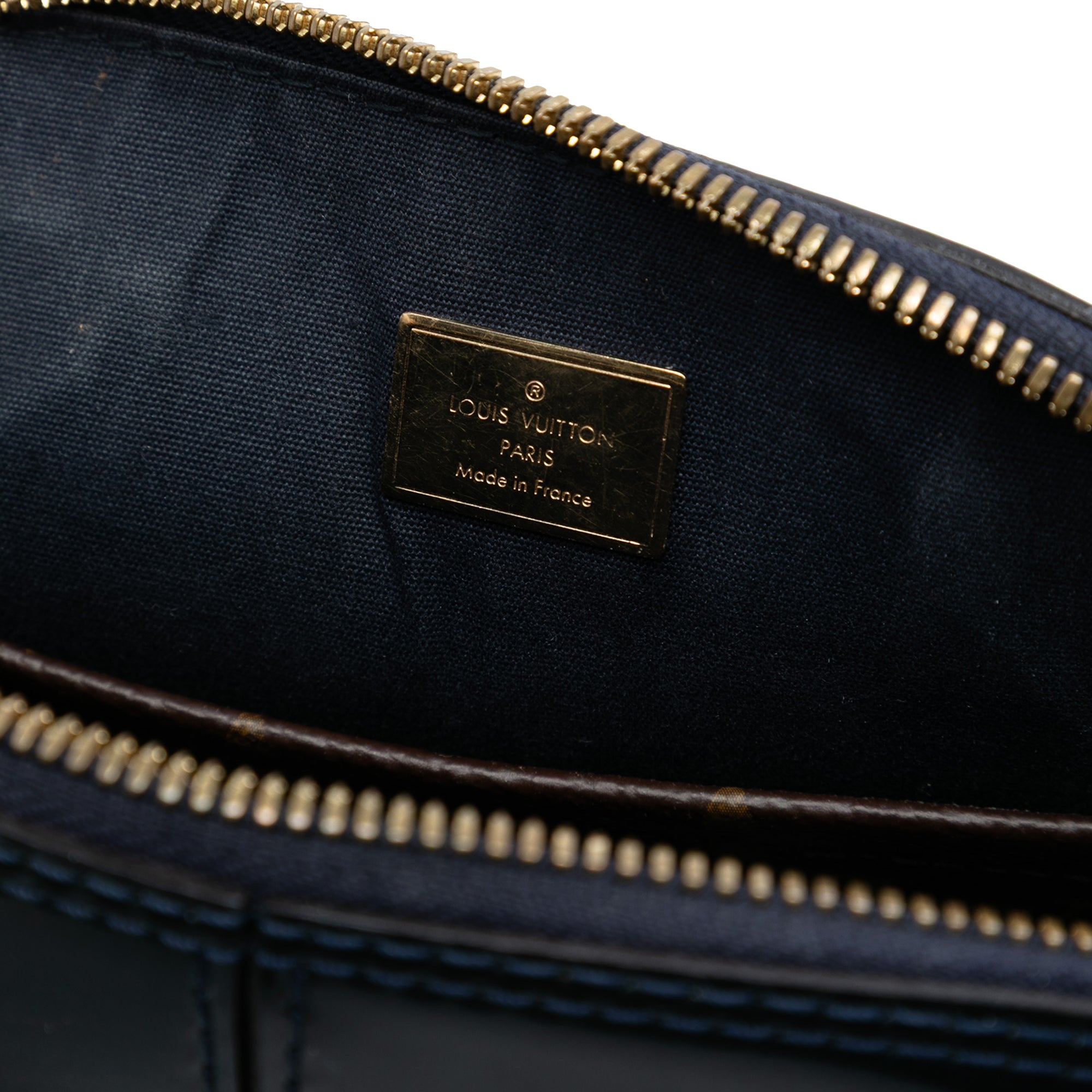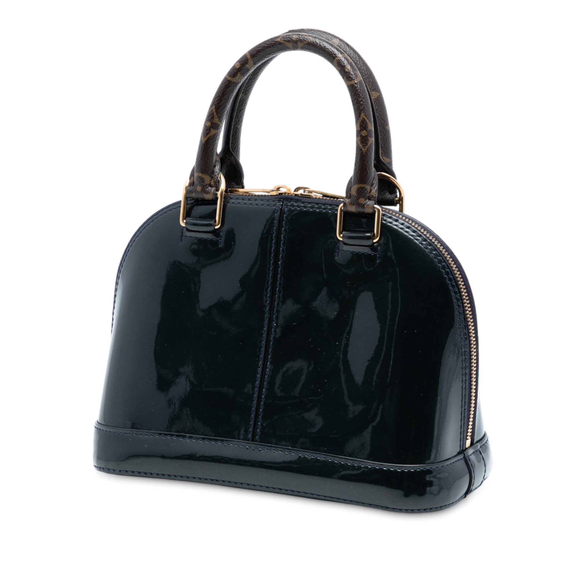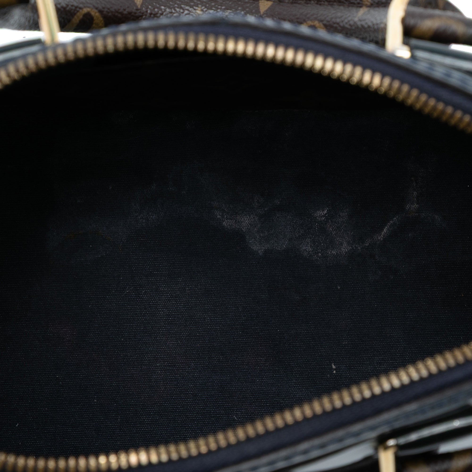 The Mirior Alma features a vernis leather body, rolled monogram canvas handles, a detachable flat monogram canvas strap, a top zip closure, and an interior slip pocket. Retail Price: 1995.00