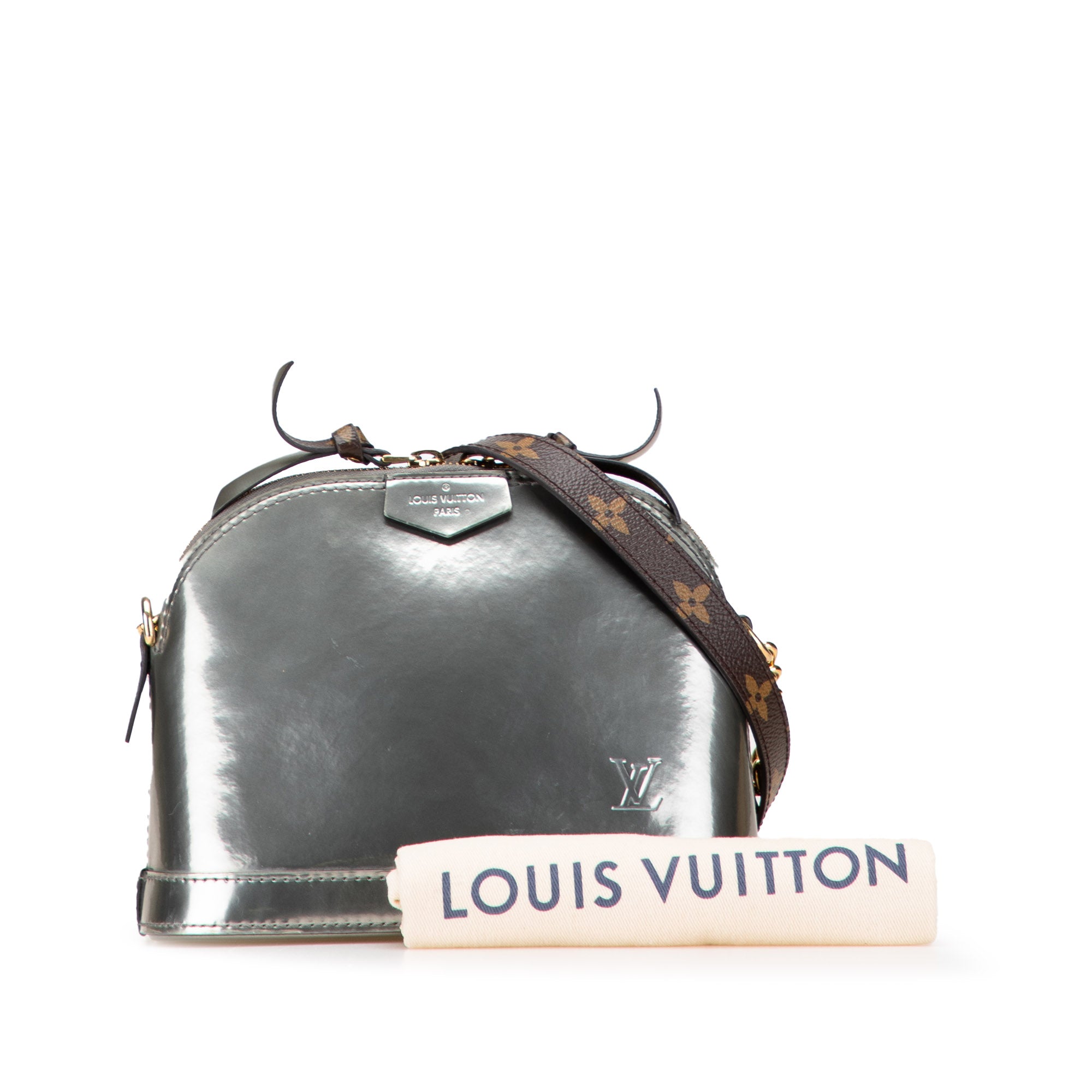 The Miroir Alma features a vernis leather body, a flat monogram canvas leather with gold-tone chain strap, a top zip closure, and an interior slip pocket. Inclusion: Dust bag. Retail Price: 1350.00