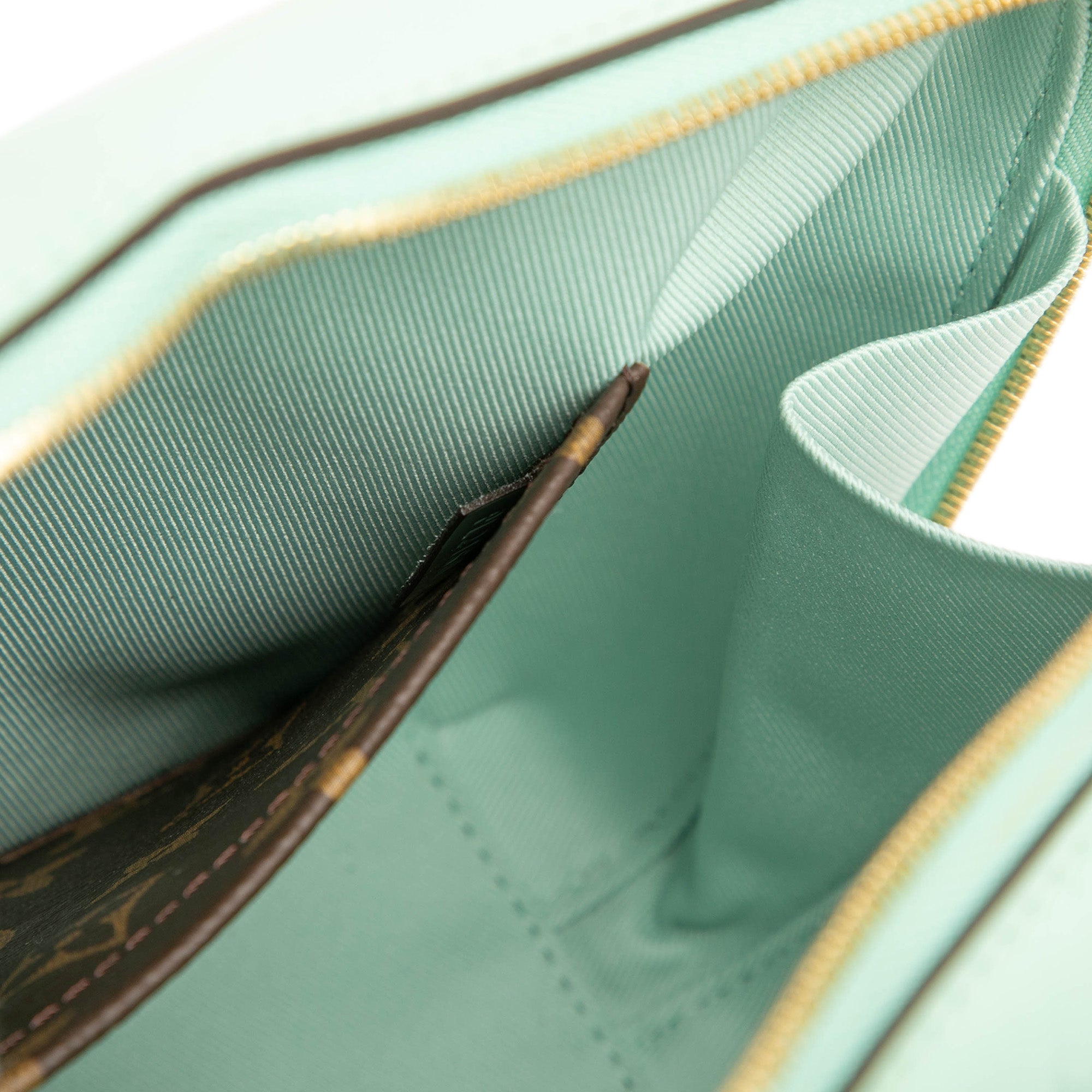 The Venice features a vernis leather body with monogram canvas trim, a flat adjustable monogram canvas strap, a zip-around closure, and an interior slip pocket. Retail Price: 1860.00