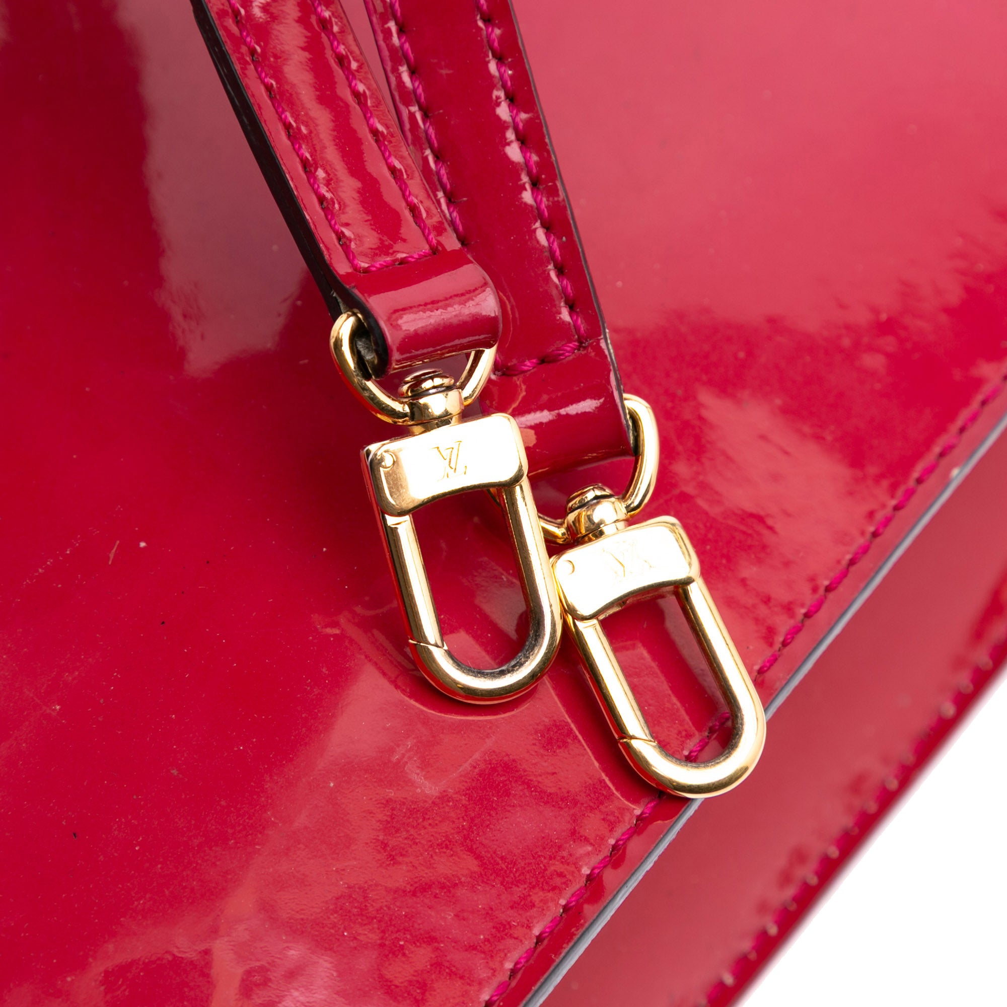 The Monceau features a vernis leather body, a flat leather top handle, a detachable flat leather strap, a front flap with an S lock closure, and an interior zip pocket. Retail Price: 1850.00