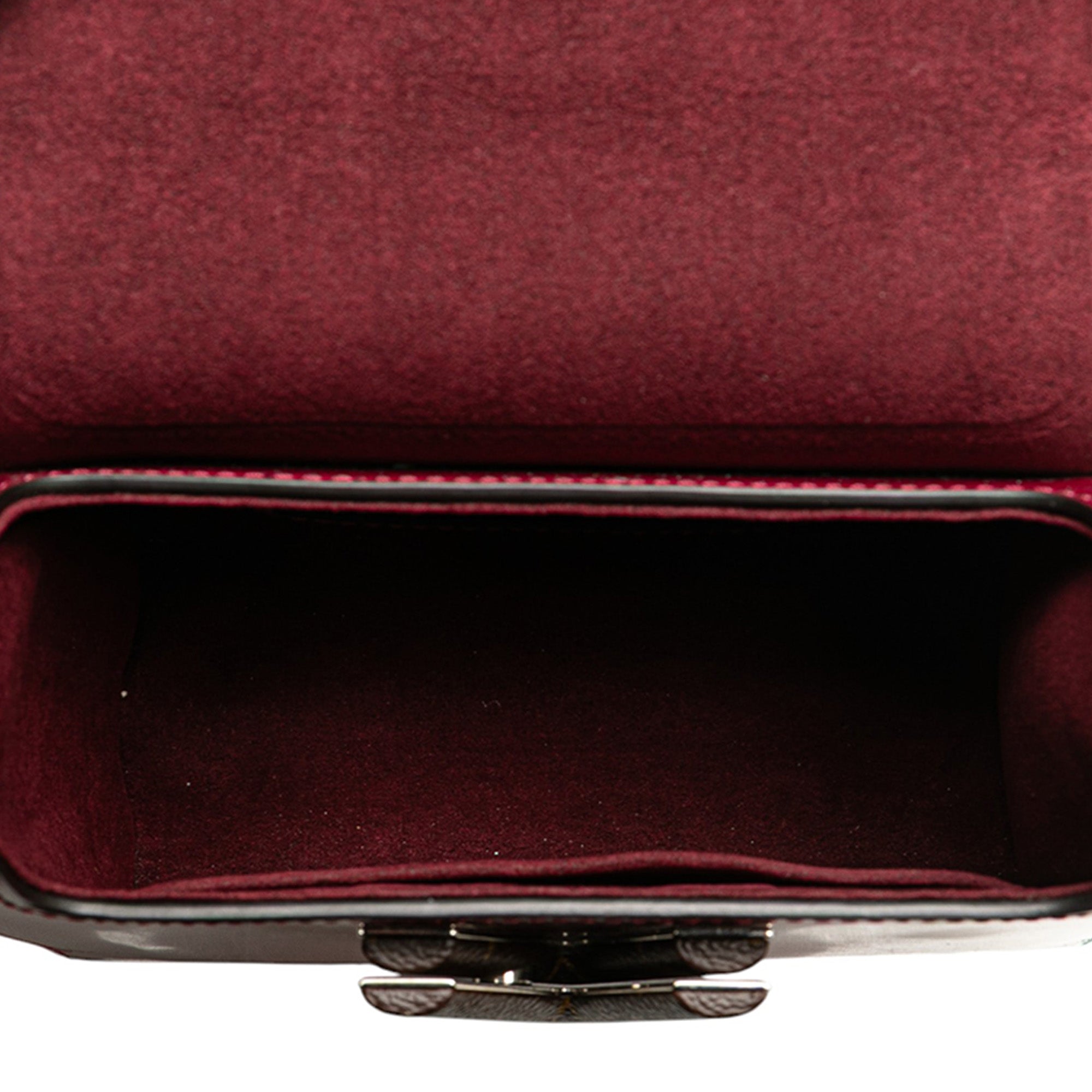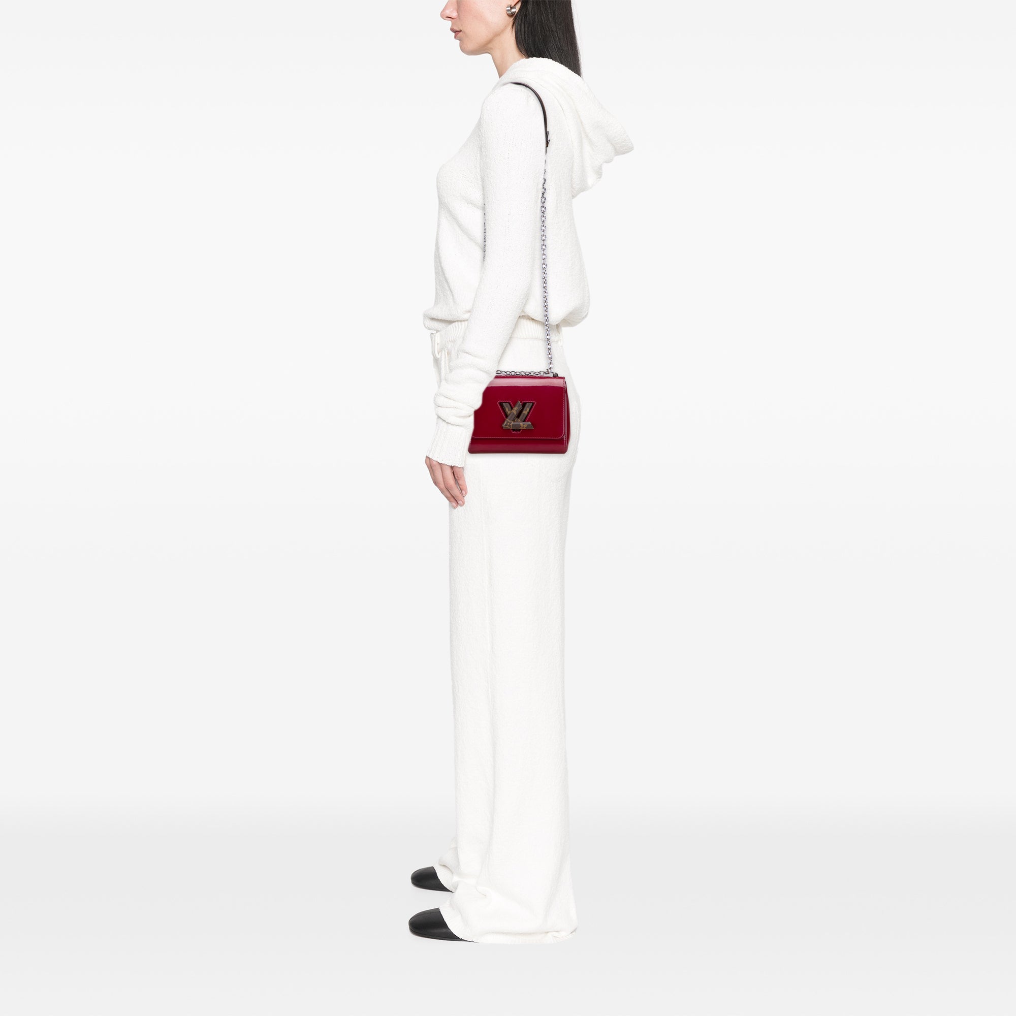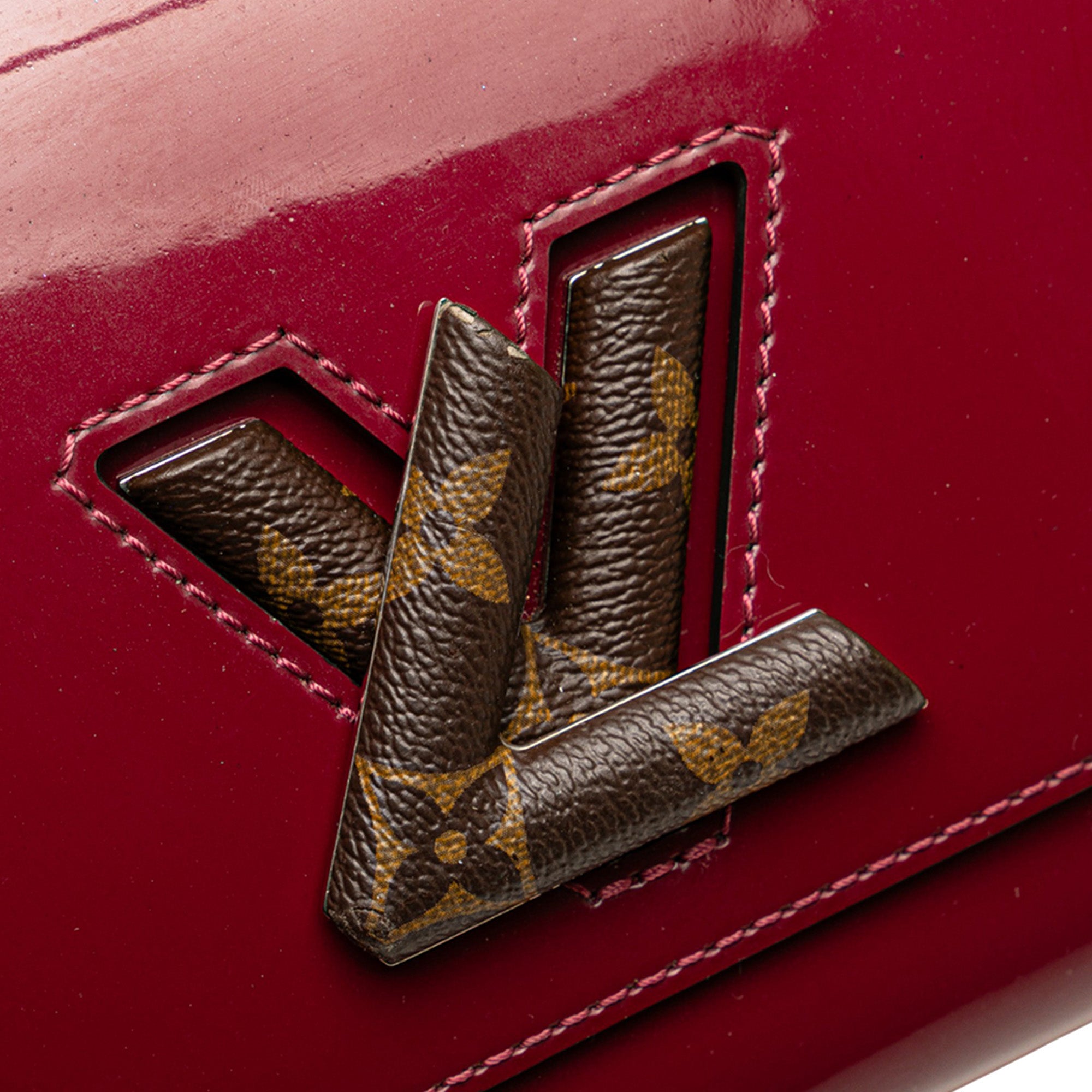 The Twist PM features a vernis leather body, a chain link strap with a monogram canvas shoulder guard, a front flap with a monogram canvas twist lock closure, and interior slip pockets. Retail Price: 3250.00