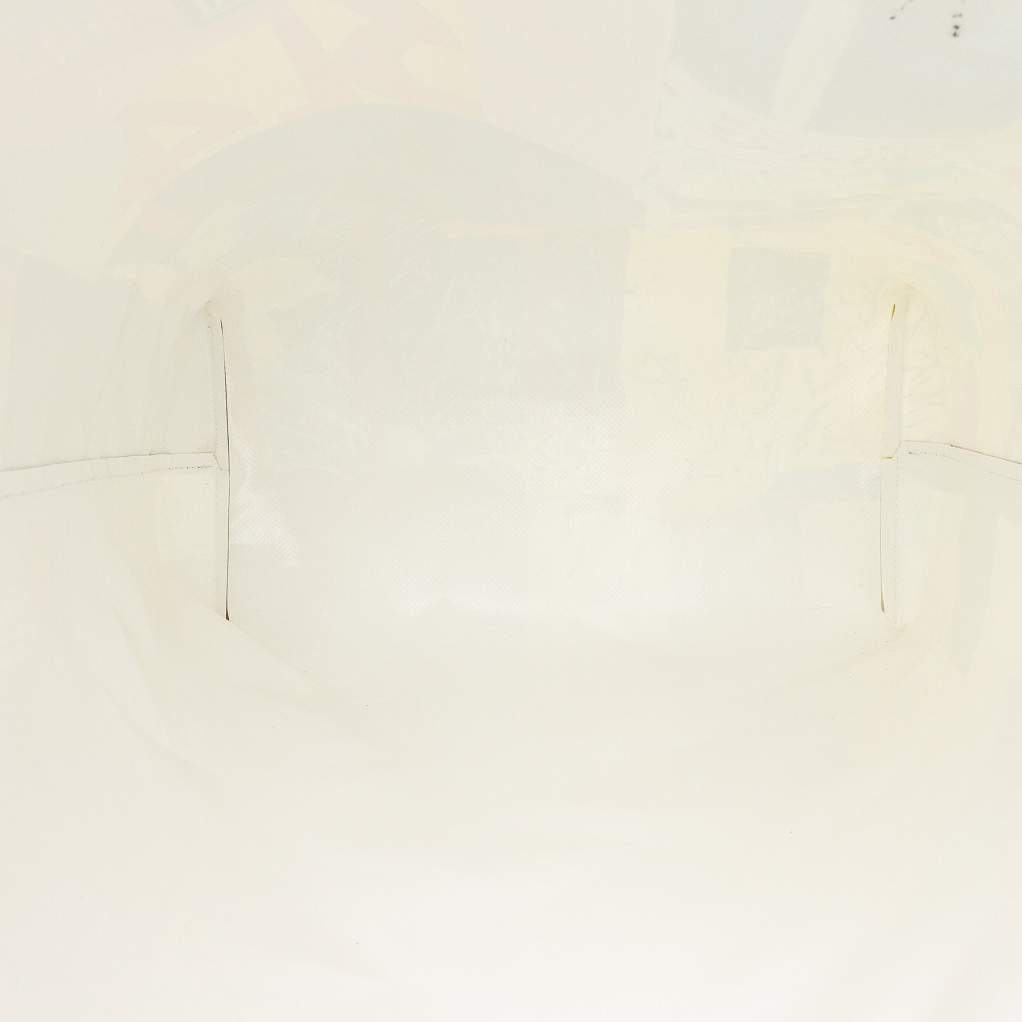 This tote bag features a printed PVC body, flat leather handles, and an open top. Retail Price: 400.00